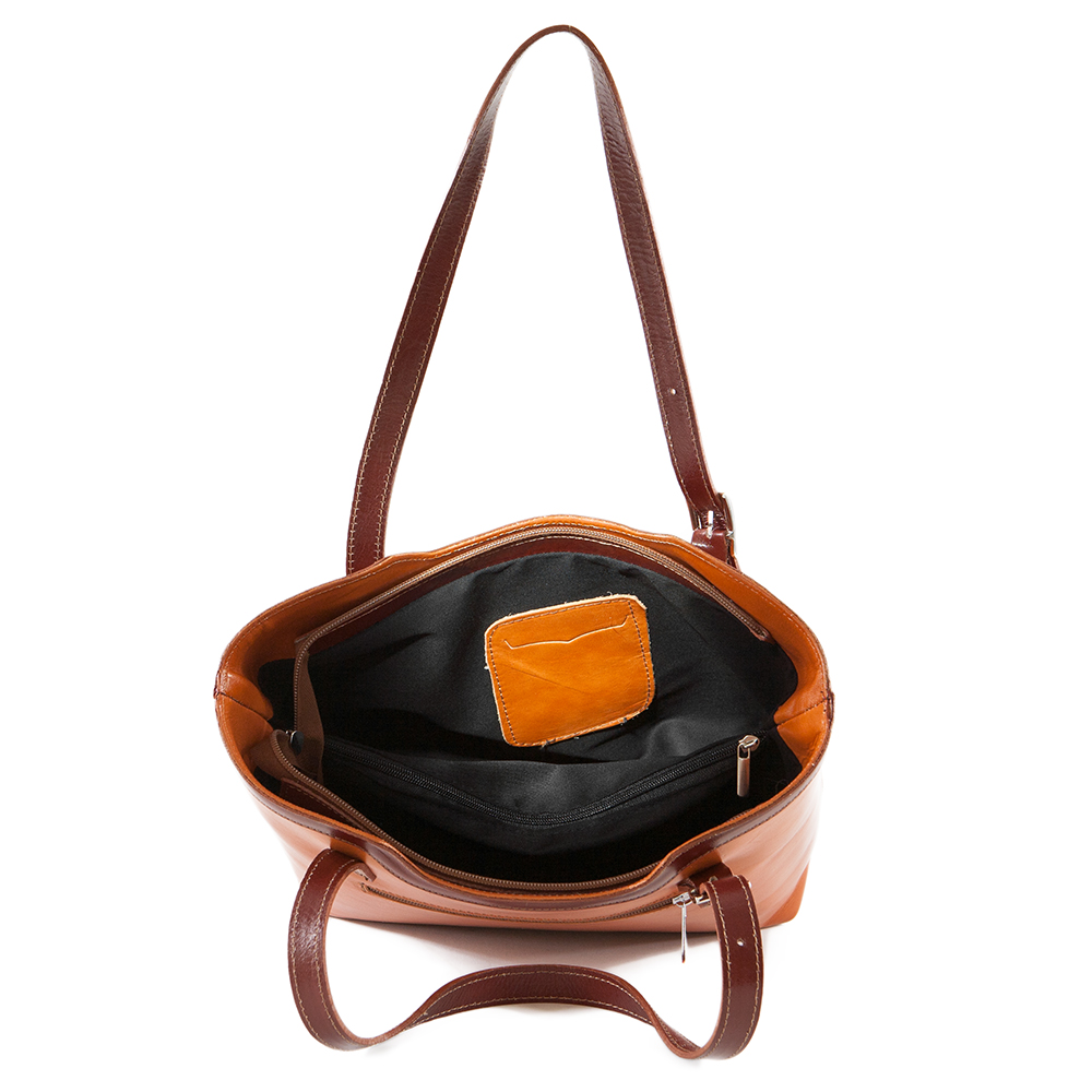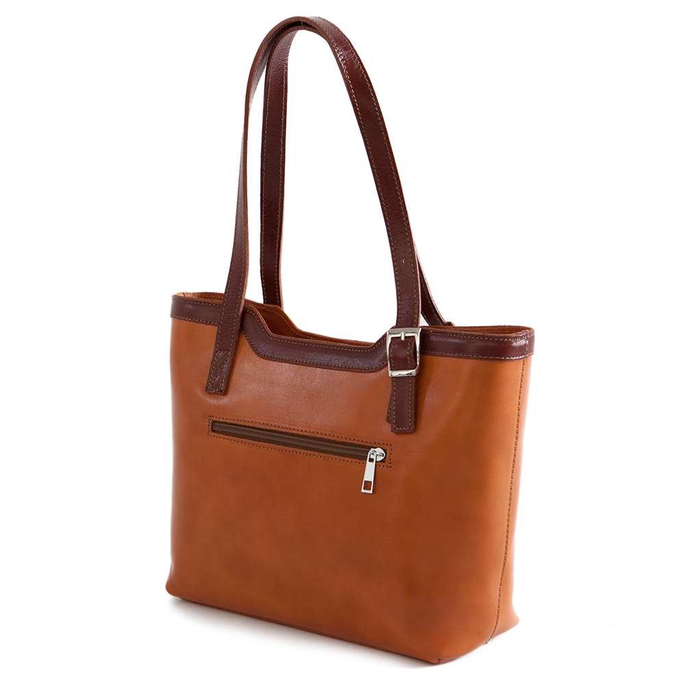Włoska klasyczna skórzana torebka wykonana z wysokogatunkowej naturalnej gładkiej skóry licowej firmy Vera Pelle. Zamykana z góry na suwak. Torebka jednokomorowa przedzieloną dużą kieszenią na suwak. Wewnątrz jedna kieszonka na zamek oraz jedna na telefon. Wnętrze wykończone trwałą podszewką dopasowaną kolorystycznie do skóry. Dodatkowo z tyłu torebki kieszonka na suwak. Torebka od spodu usztywniona. Uszy w torebce można regulować na długość 58-64 cm. Elementy wykończenia w kolorze srebrnym.