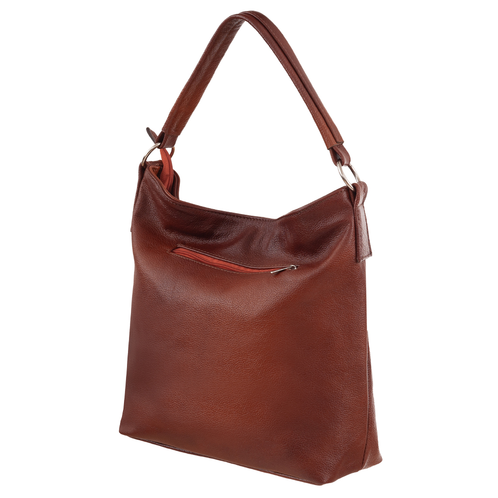 Skórzana, miękka A4 torebka wykonana w całości ze skóry naturalnej licowej. Zamykana z góry na suwak. Torebka dwukomorowa przedzielona na środku dużą kieszenią na zamek. Wewnątrz jedna kieszonka na zamek oraz jedna na telefon. Dodatkowo z tyłu kieszonka na suwak. Wnętrze wykończone trwałą, materiałową podszewką. Dodatkowy pasek z możliwością regulacji długości od 65 cm do 130 cm. Metalowe elementy w kolorze srebrnym. Dno torebki usztywnione.