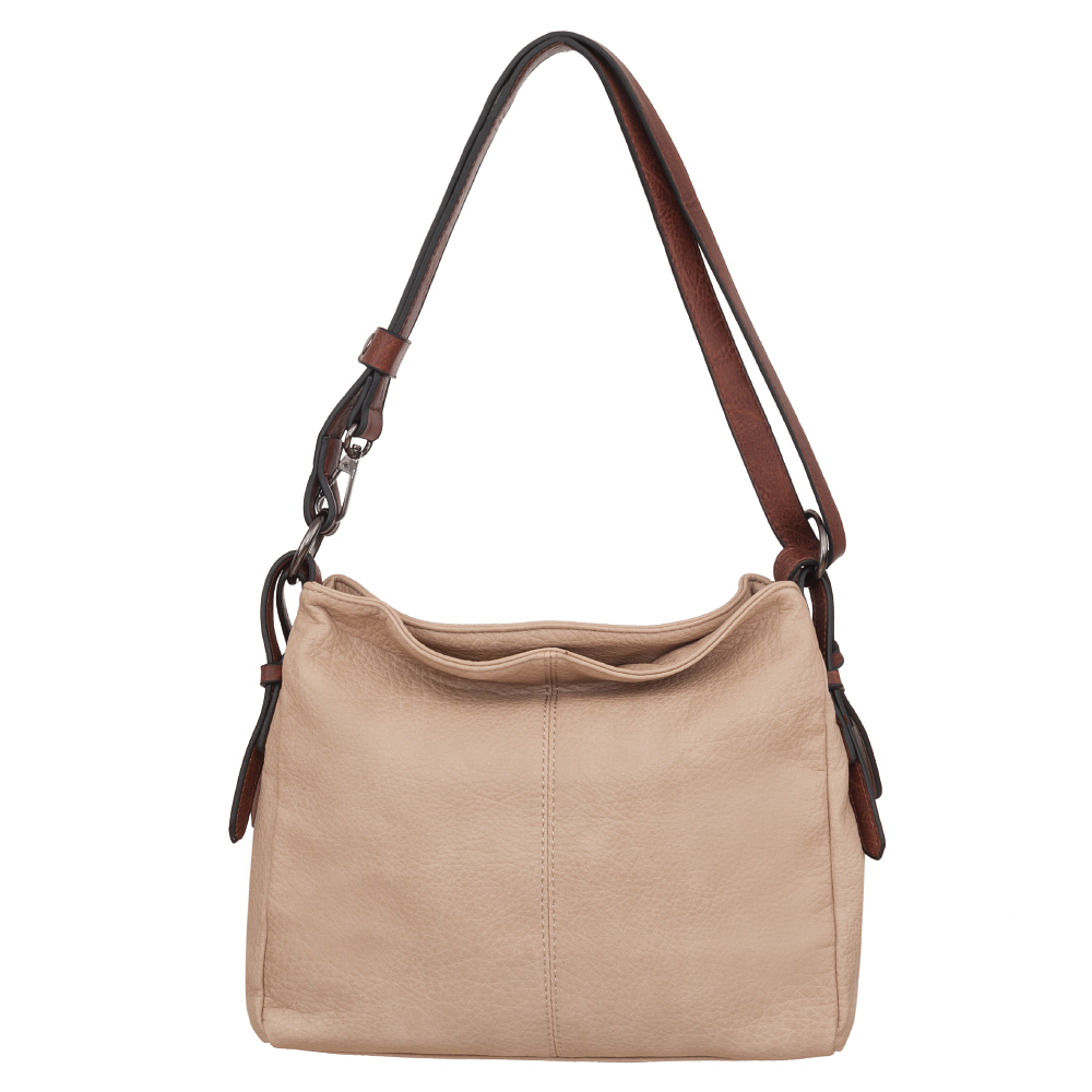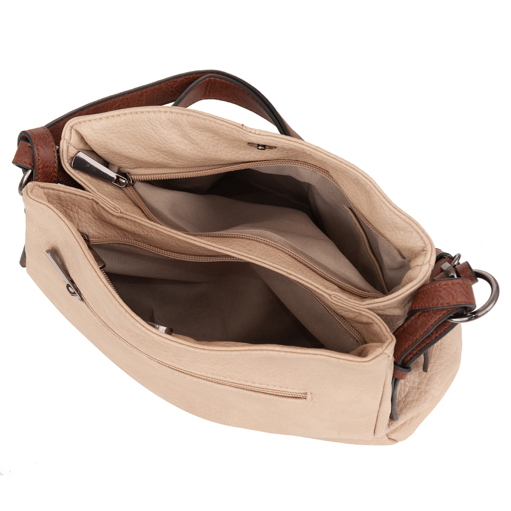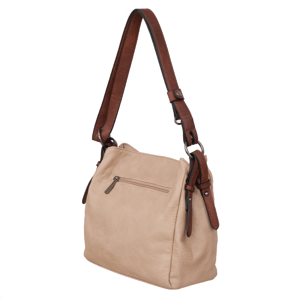 Modna, klasyczna torebka wykonana z wysokogatunkowej skóry ekologicznej wysokiej jakości. Zamykana od góry na zamek na całej szerokości. Torebka dwukomorowa, zorganizowana w środku + wewnątrz kieszonka na zamek, jedna na telefon + dodatkowa kieszeń na drobiazgi, klucze. Wnętrze wykończone trwałą, mocną materiałową podszewką. Dodatkowo z tyłu torebki kieszonka na zamek. Torebka od spodu lekko usztywniona. Elementy wykończenia w kolorze srebrnym. Pasek z możliwością regulacji, dzięki czemu torebkę można nosić zarówno na ramieniu jak i przez ramię jako listonoszkę.