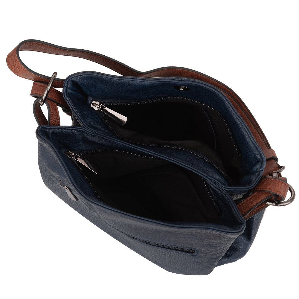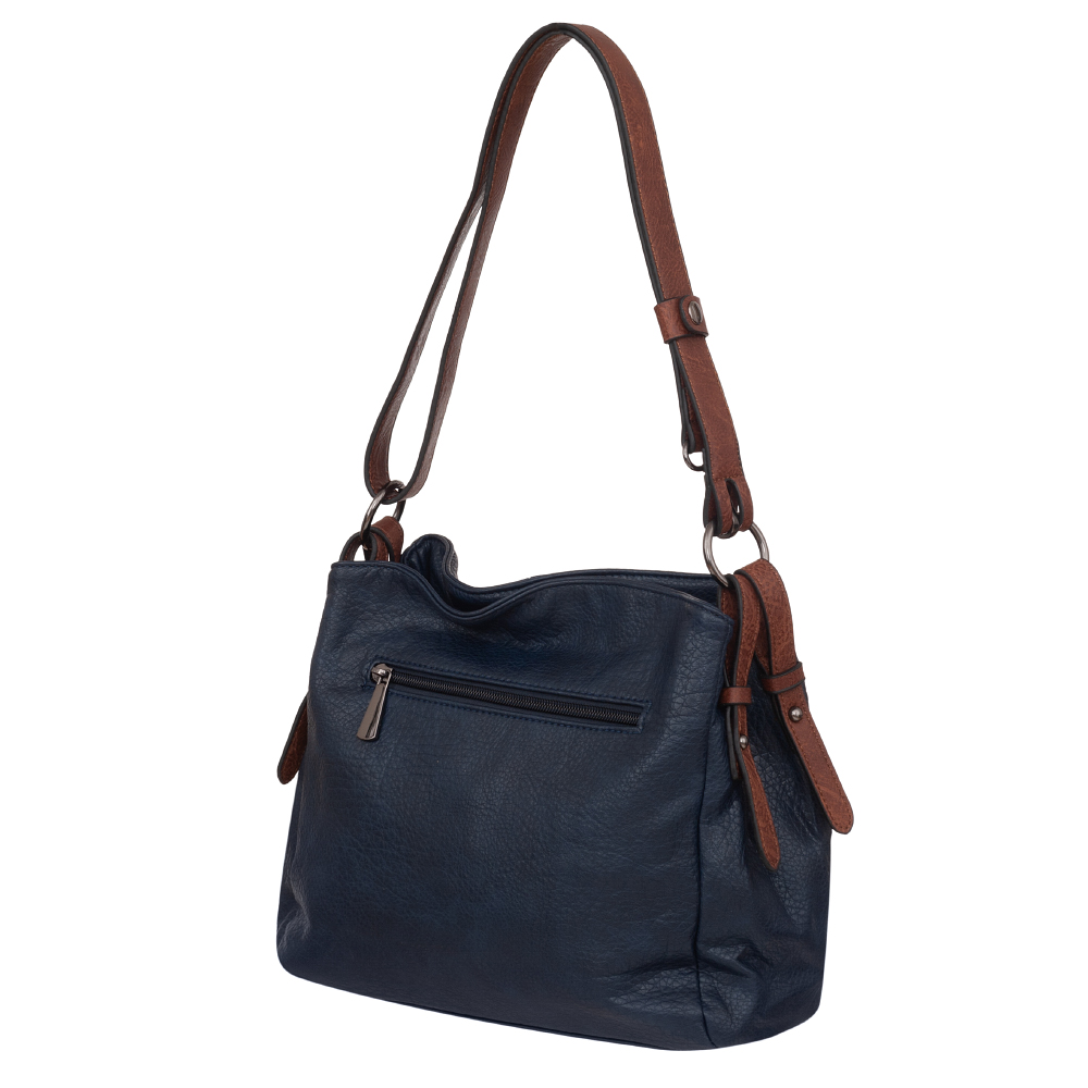 Modna, klasyczna torebka wykonana z wysokogatunkowej skóry ekologicznej wysokiej jakości. Zamykana od góry na zamek na całej szerokości. Torebka dwukomorowa, zorganizowana w środku + wewnątrz kieszonka na zamek, jedna na telefon + dodatkowa kieszeń na drobiazgi, klucze. Wnętrze wykończone trwałą, mocną materiałową podszewką. Dodatkowo z tyłu torebki kieszonka na zamek. Torebka od spodu lekko usztywniona. Elementy wykończenia w kolorze srebrnym. Pasek z możliwością regulacji, dzięki czemu torebkę można nosić zarówno na ramieniu jak i przez ramię jako listonoszkę.