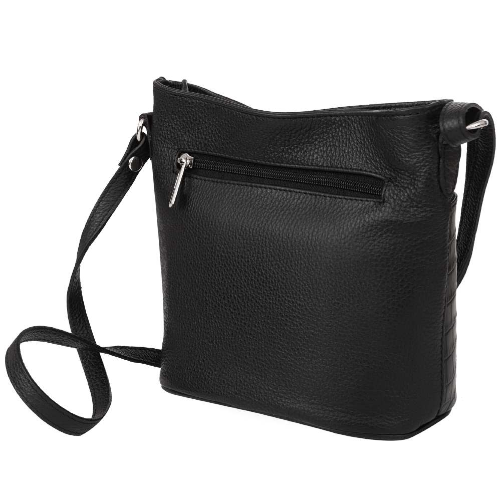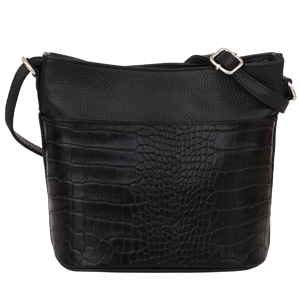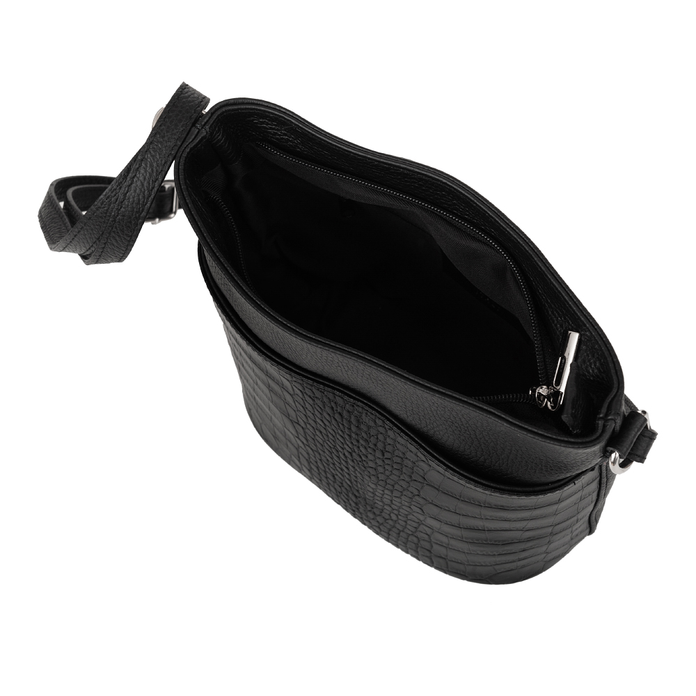 Hit sezonu! Włoska pojemna, modna skórzana torebka listonoszka wykonana z wysokogatunkowej gładkiej naturalnej skóry licowej łączonej ze skórą z fakturą łuski krokodyla firmy VERA PELLE. Torebka w stylu miejskim. Wygodny dostęp do środka. Torebka jednokomorowa wykończona materiałową podszewką w kolorze czarnym. W środku kieszonka na telefon + kieszeń na zamek. Dodatkowo z przodu torebki wsuwna kieszeń na magnes + kieszonka z tyłu na zamek. Metalowe wykończenia w kolorze srebrnym. Pasek w pełni regulowany na długość.