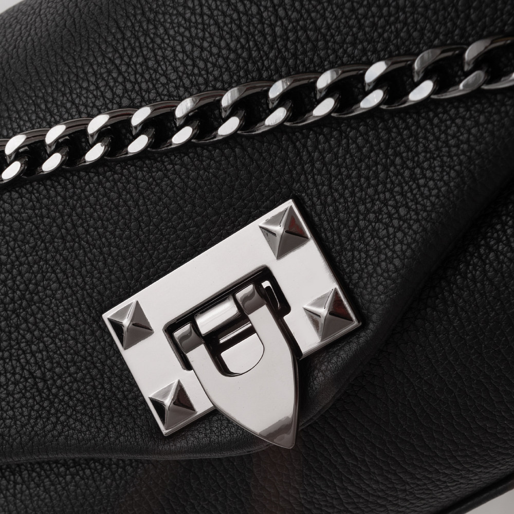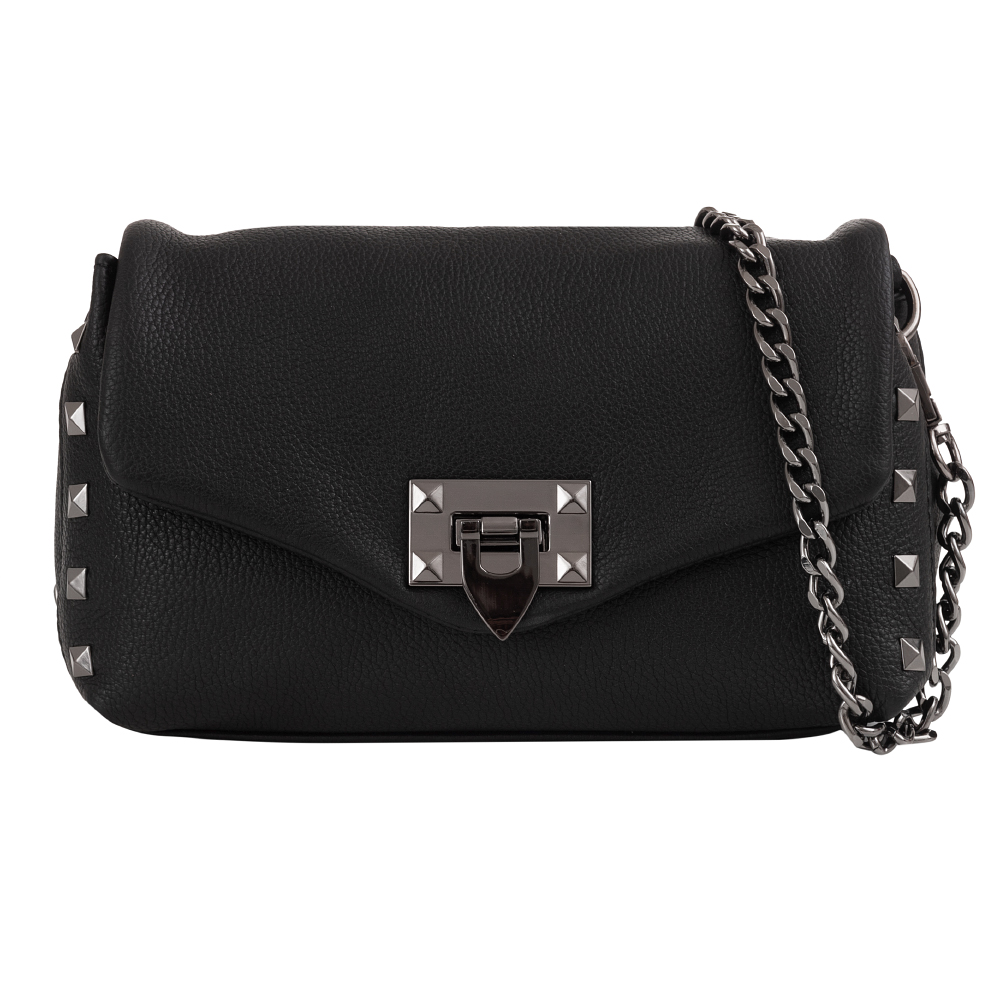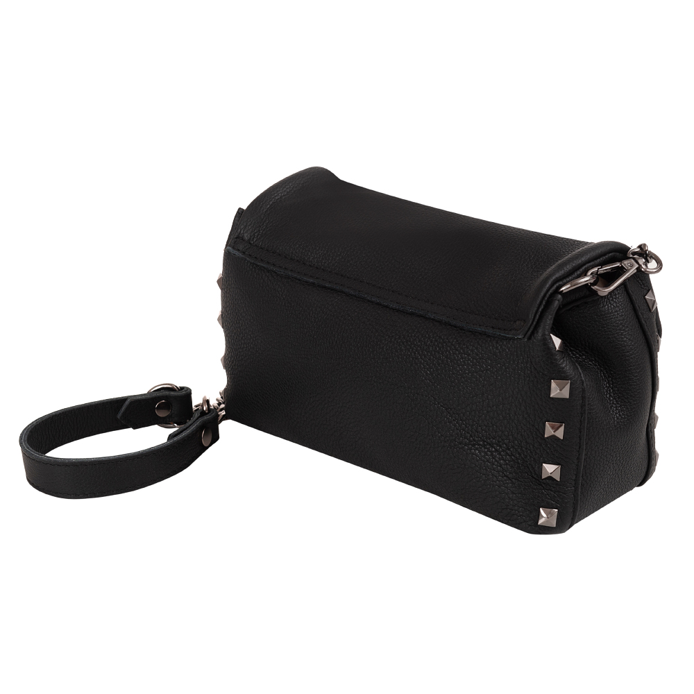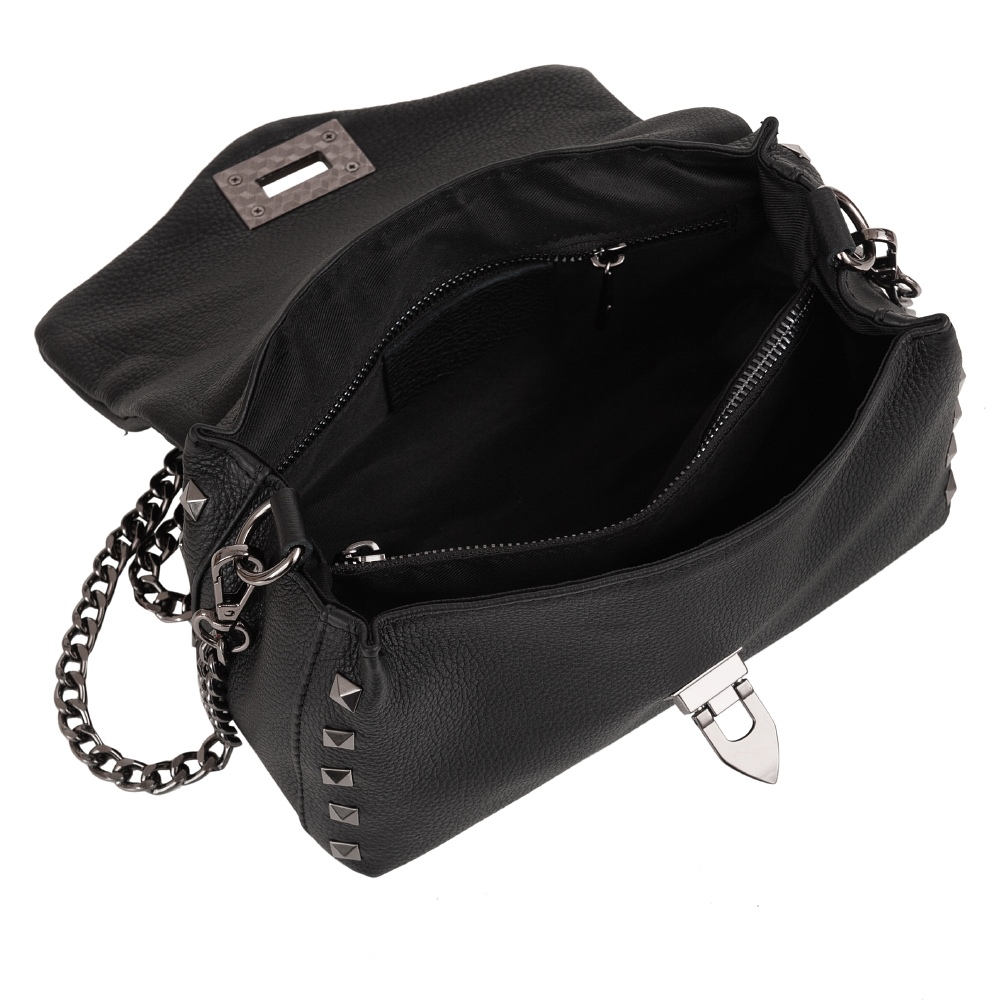 Włoska pojemna skórzana torebka listonoszka wykonana z wysokogatunkowej miękkiej naturalnej skóry licowej. Skóra mocna, mięsista. Zamykana na klapę. Torebka dwukomorowa, wewnątrz 2 x kieszonka na zamek. Wnętrze wykończone trwałą, czarną materiałową podszewką. Długi łańcuszek (120cm) w kolorze inox umożliwia wygodne noszenie na ramieniu lub przez ramię. Modne dżety po bokach torebki nadają jej stylu grunge.