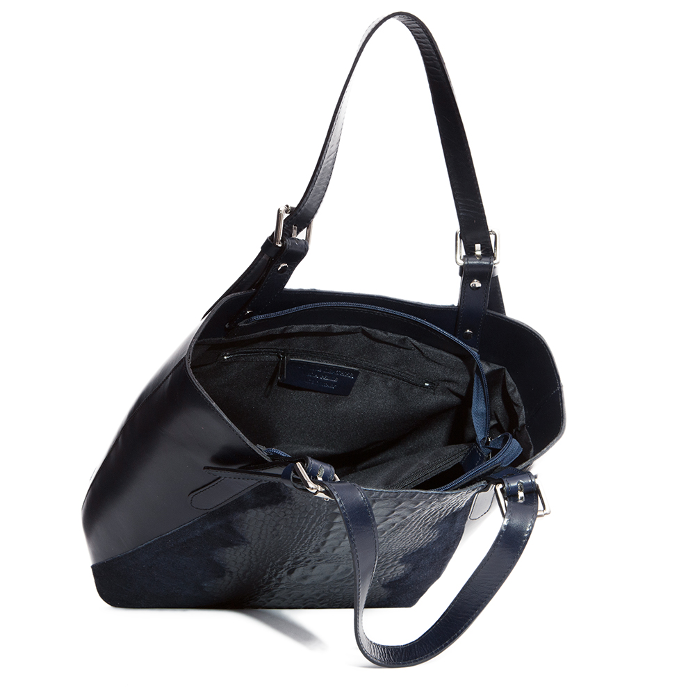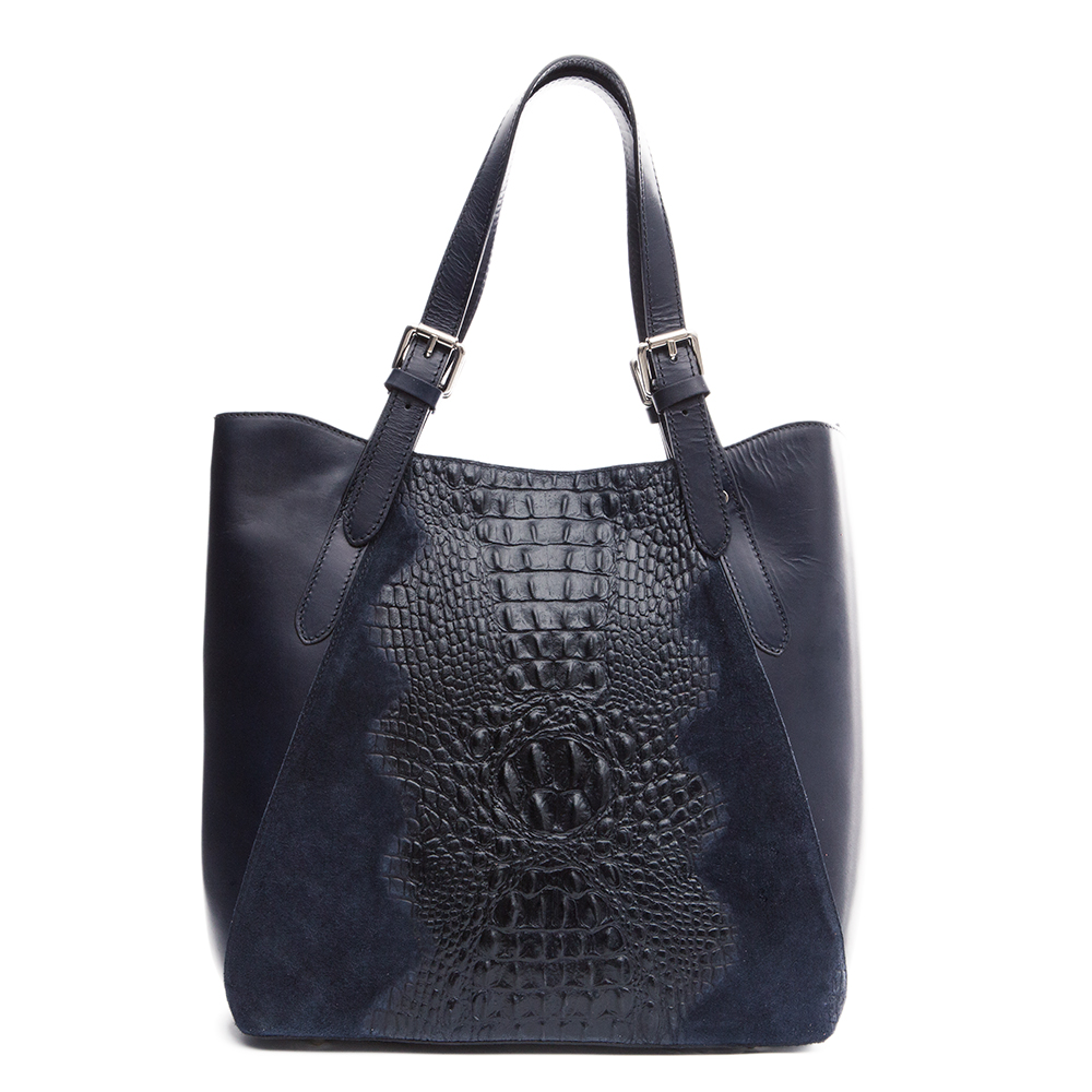 VERA PELLE włoska modna skórzana A4 torebka wykonana z wysokogatunkowej naturalnej skóry licowej łączonej z zamszem naturalnym z motywem krokodyla. Wygodny dostęp do środka. Torebka dwukomorowa, od góry zamykana na suwak. Wewnątrz kieszonka na telefon + kieszonka na zamek + duża kieszeń na środku dzieląca torebkę na 2 komory. Torebka od środka wykończona porządną podszewką. Elementy wykończenia w kolorze srebrnym. Z tyłu kieszeń na suwak. Uszy z możliwością regulacji długości. Dno usztywnione i podbite nóżkami, aby nie niszczył się spód.