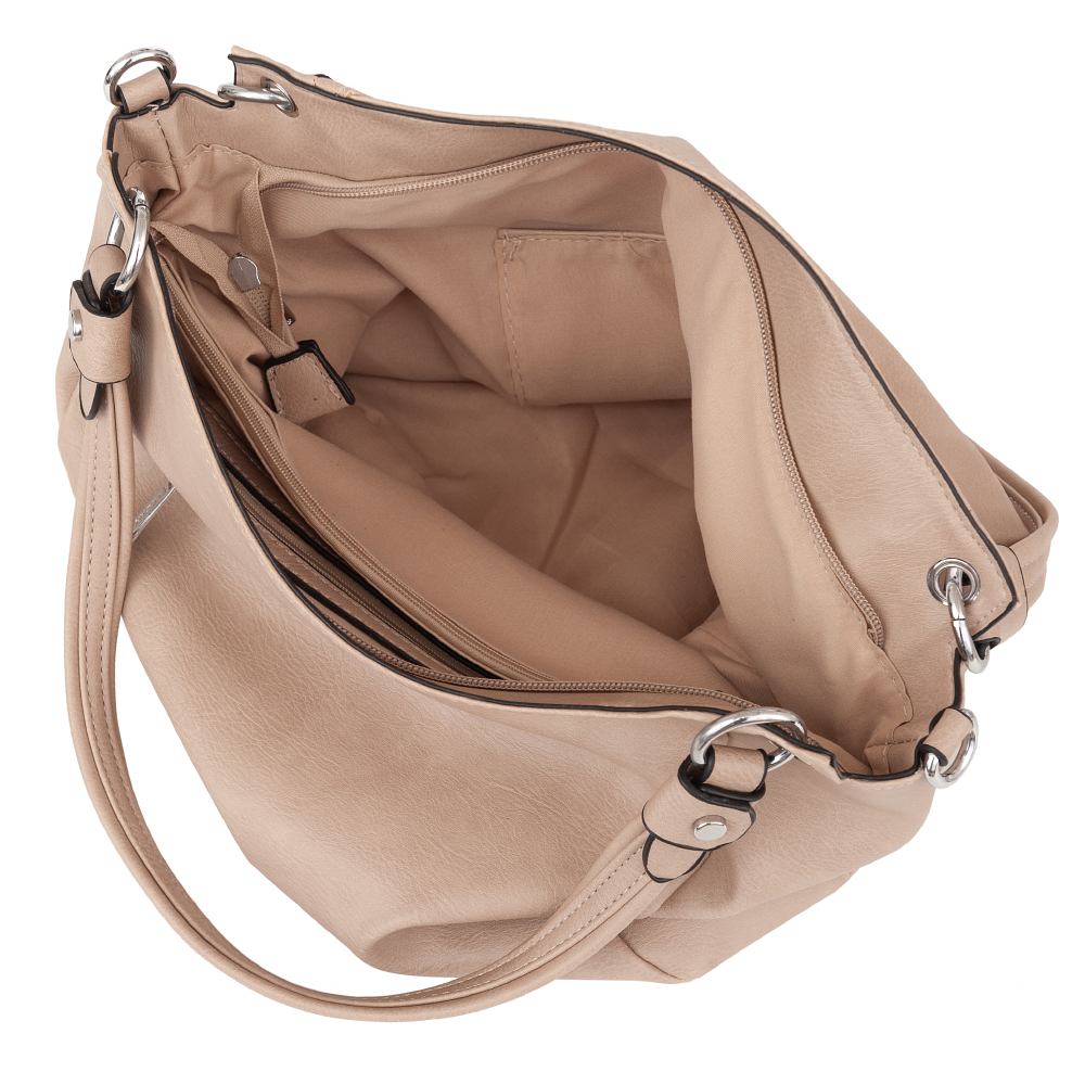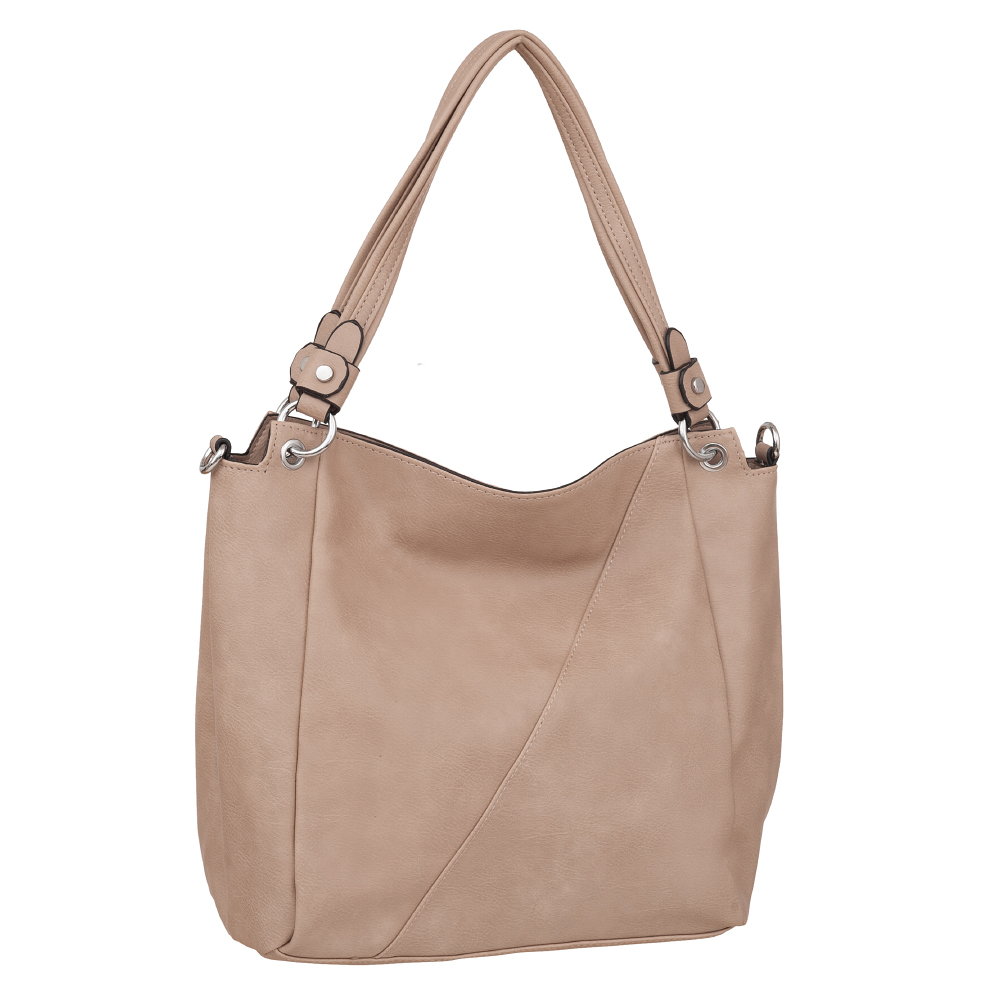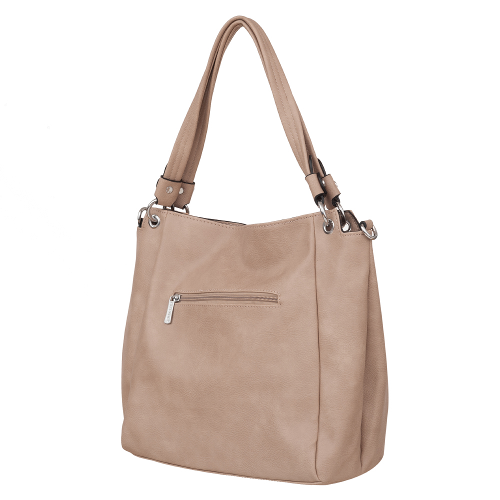 Modna torebka wykonana z wysokogatunkowej miękkiej gładkiej skóry ekologicznej najwyższej jakości. Zamykana z góry na zamek na całej szerokości. Torebka dwukomorowa, przedzielona na środku, zorganizowana + wewnątrz kieszonka na zamek, jedna na telefon + duża kieszeń na zamek w środku dzieląca torebkę na dwie części + wsuwna kieszonka na drobiazgi. Wnętrze wykończone trwałą, bawełnianą mocną podszewką. Dodatkowo z tyłu torebki kieszonka na zamek. Torebka od spodu usztywniona. Elementy wykończenia w kolorze srebrnym. W komplecie długi regulowany pasek na ramię o długości max. 130 cm.