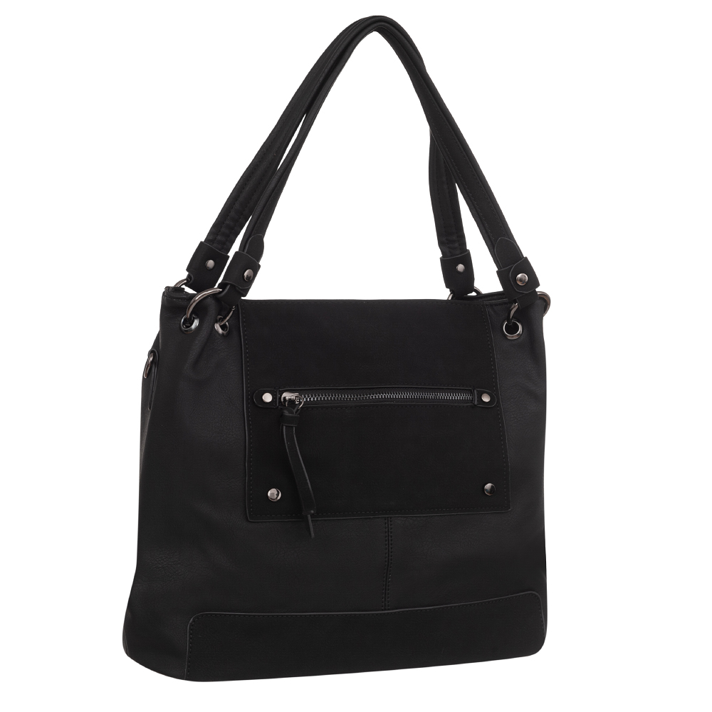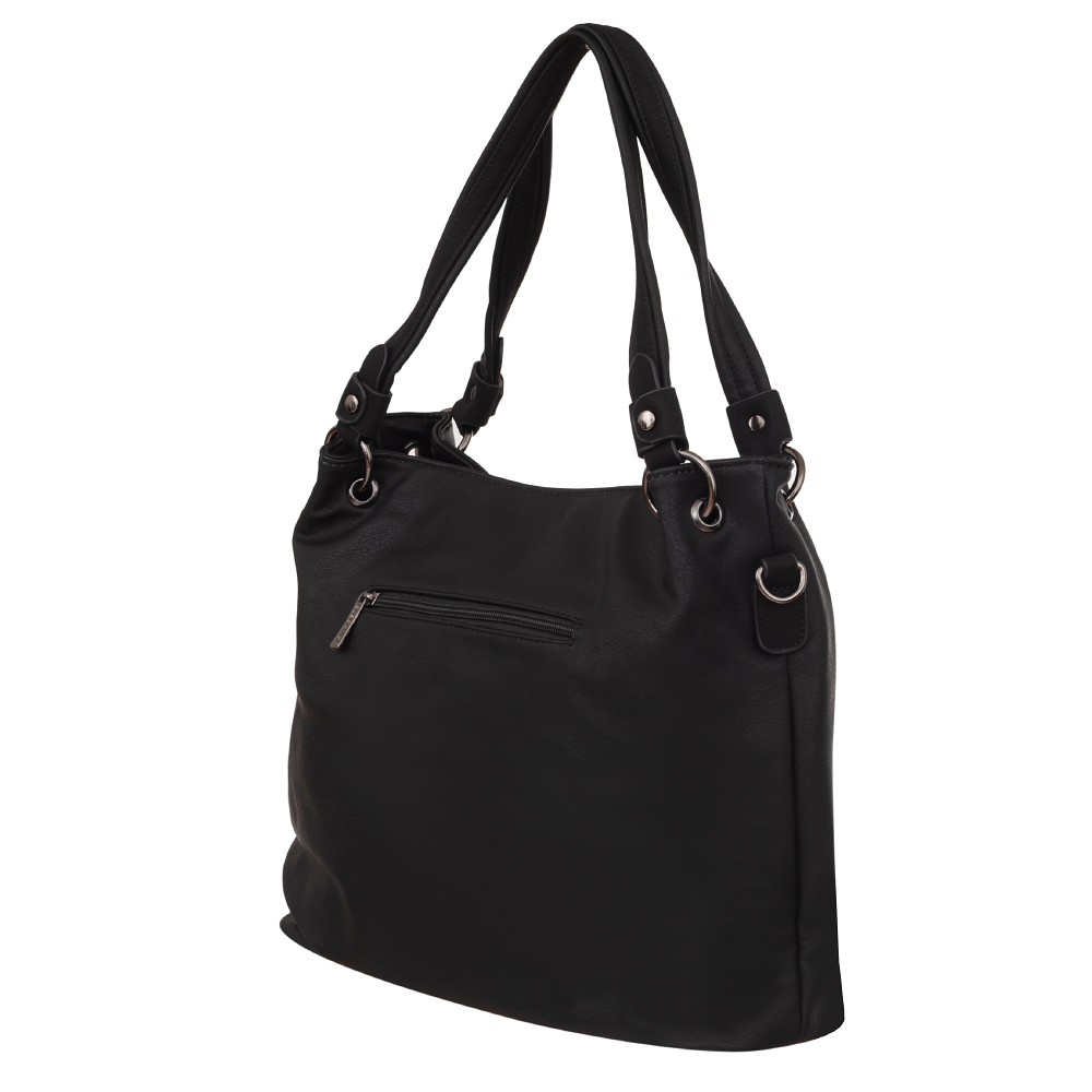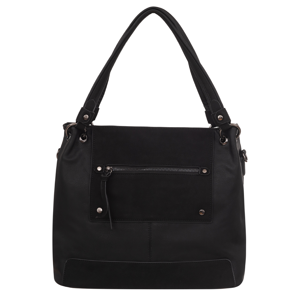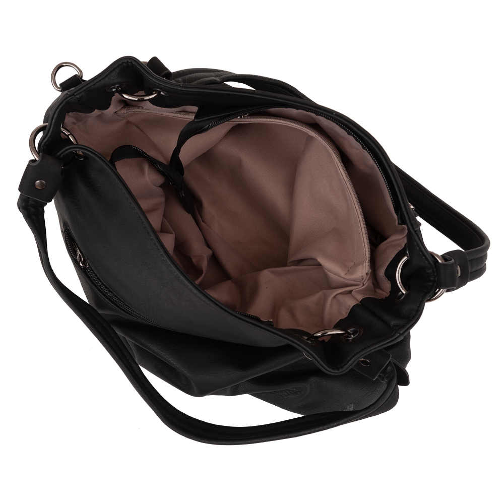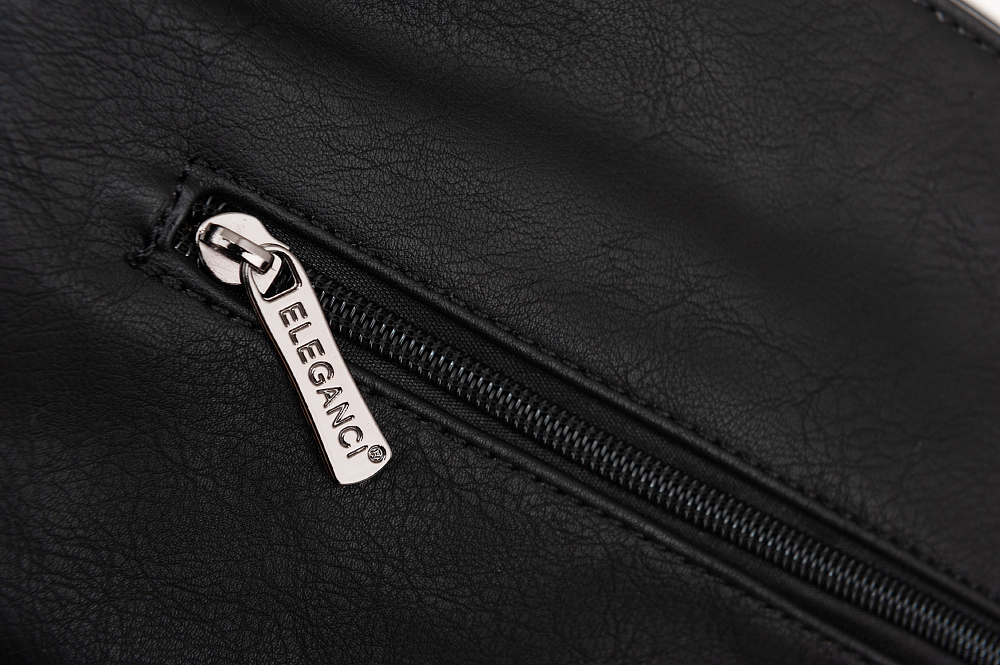 Modna torebka wykonana z wysokogatunkowej skóry ekologicznej najwyższej jakości. Zamykana z góry na zamek na całej szerokości. Torebka jednokomorowa, przedzielona na środku dużą kieszenią na zamek, zorganizowana + wewnątrz kieszonka na zamek, jedna na telefon + wsuwna kieszonka na drobiazgi. Wnętrze wykończone trwałą, bawełnianą mocną podszewką. Dodatkowo z przodu i z tyłu torebki kieszonka na zamek. Torebka od spodu usztywniona. Elementy wykończenia w kolorze srebrnym. W komplecie długi regulowany pasek na ramię o długości max. 130 cm.
