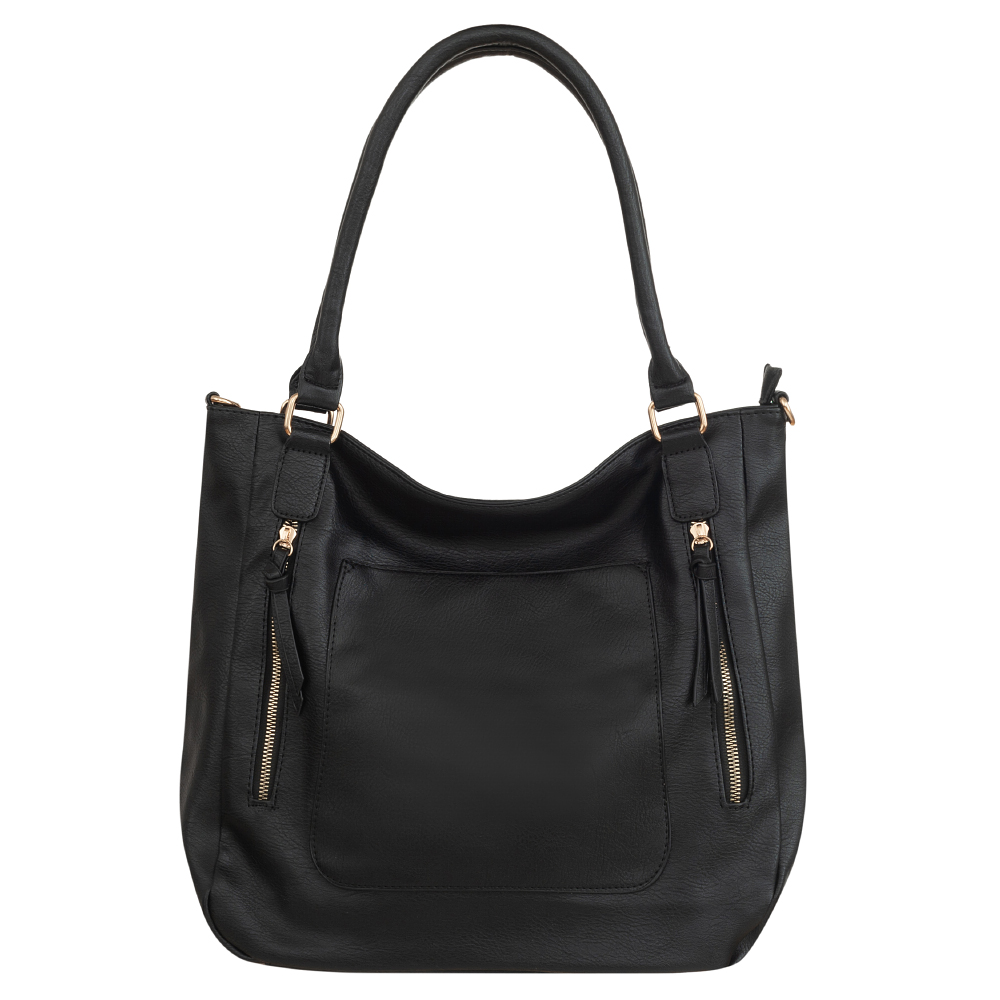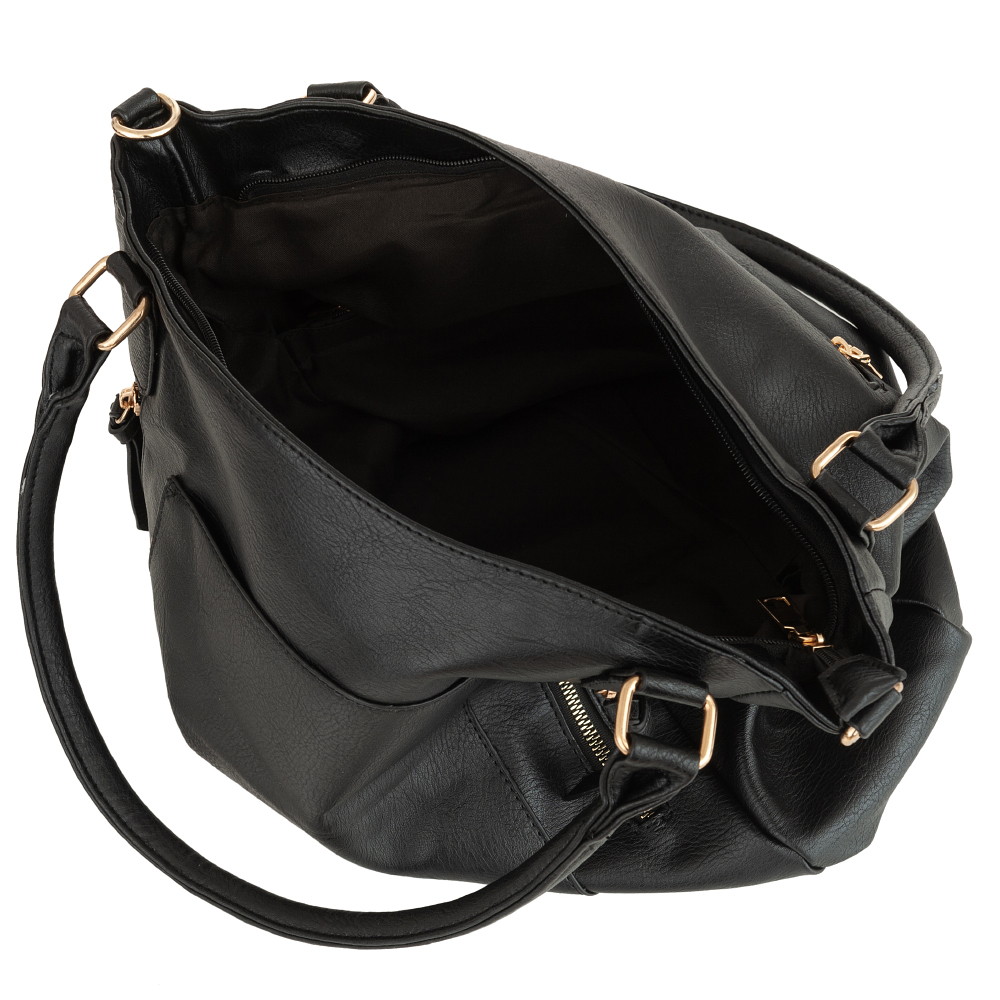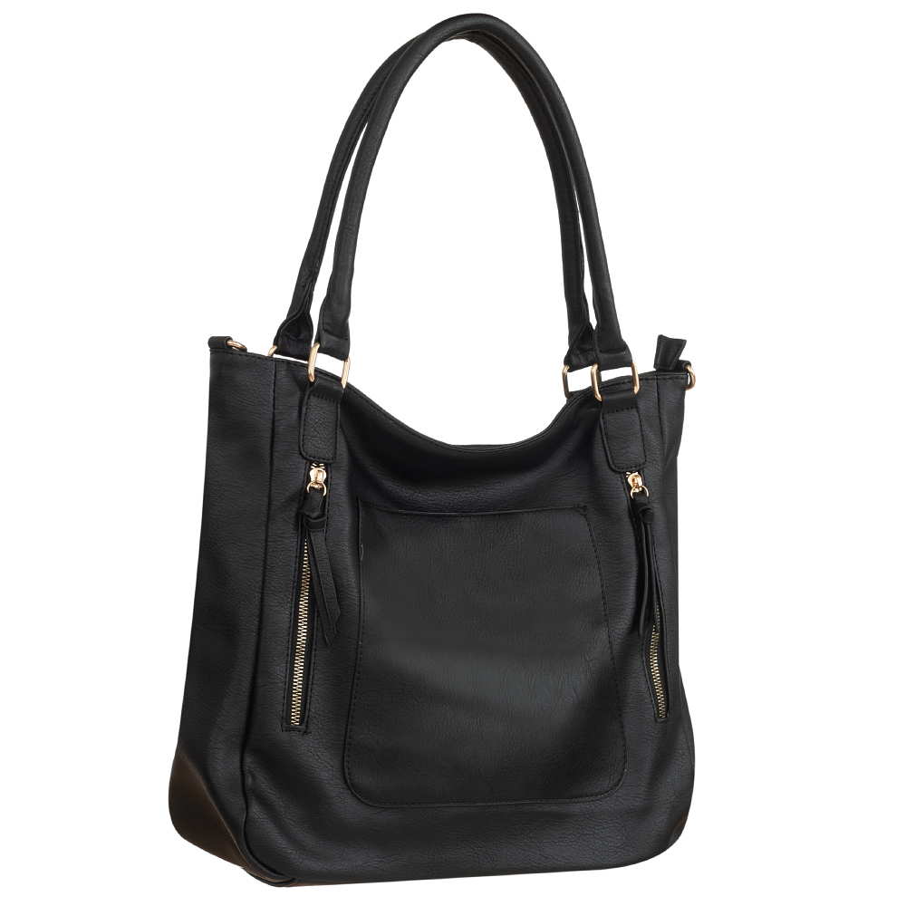MUST HAVE - Modna, klasyczna torebka w miejskim stylu wykonana z wysokogatunkowej skóry ekologicznej wysokiej jakości. Z przodu dwie pionowe kieszonki na zamek + jedna wsuwna na środku. Zamykana z góry na zamek na całej szerokości torebki. Torba jednokomorowa, zorganizowana w środku + wewnątrz 2 x kieszeń na zamek, jedna na telefon + dodatkowa kieszeń na drobiazgi. Wnętrze wykończone trwałą materiałową podszewką. Dodatkowo z tyłu torebki kieszonka na zamek. Torebka od spodu delikatnie usztywniona. Elementy wykończenia w kolorze złotym. W komplecie długi regulowany pasek na ramię o długości max. 129 cm.
