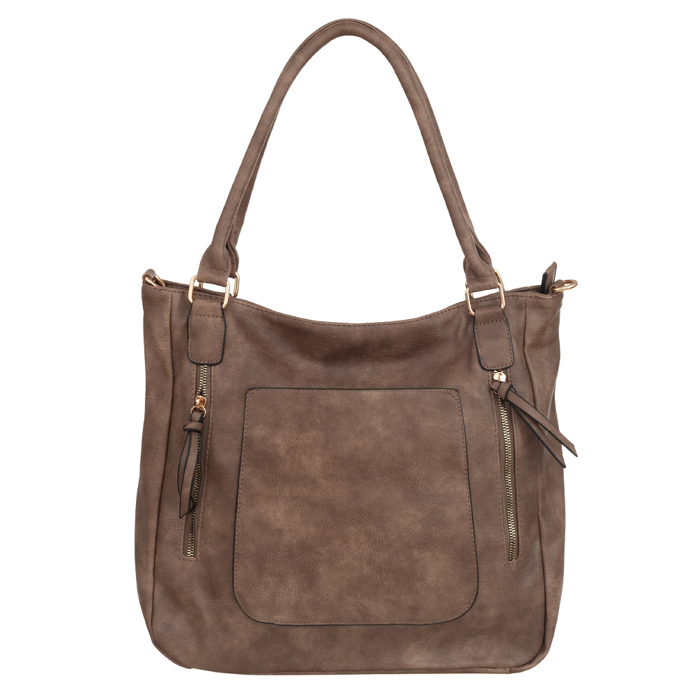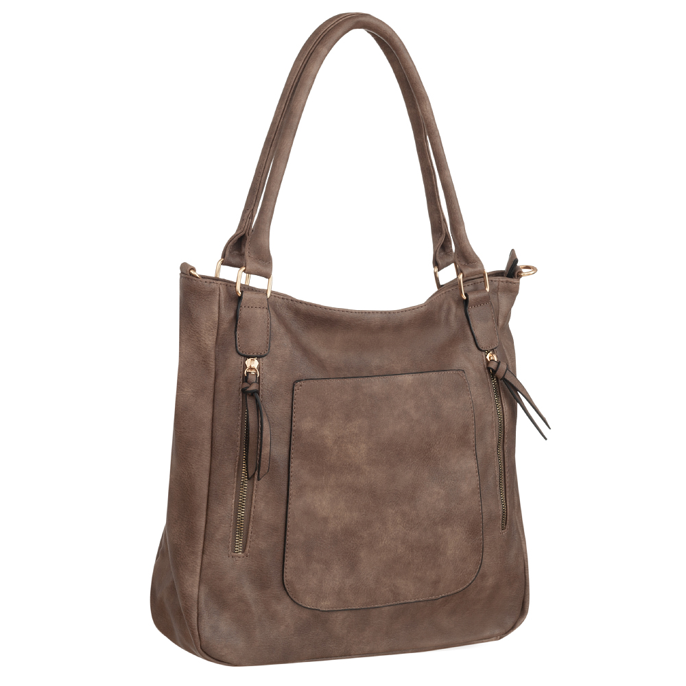 MUST HAVE - Modna, klasyczna torebka w miejskim stylu wykonana z wysokogatunkowej skóry ekologicznej wysokiej jakości. Z przodu dwie pionowe kieszonki na zamek + jedna wsuwna na środku. Zamykana z góry na zamek na całej szerokości torebki. Torba jednokomorowa, zorganizowana w środku + wewnątrz 2 x kieszeń na zamek, jedna na telefon + dodatkowa kieszeń na drobiazgi. Wnętrze wykończone trwałą materiałową podszewką. Dodatkowo z tyłu torebki kieszonka na zamek. Torebka od spodu delikatnie usztywniona. Elementy wykończenia w kolorze złotym. W komplecie długi regulowany pasek na ramię o długości max. 129 cm.
