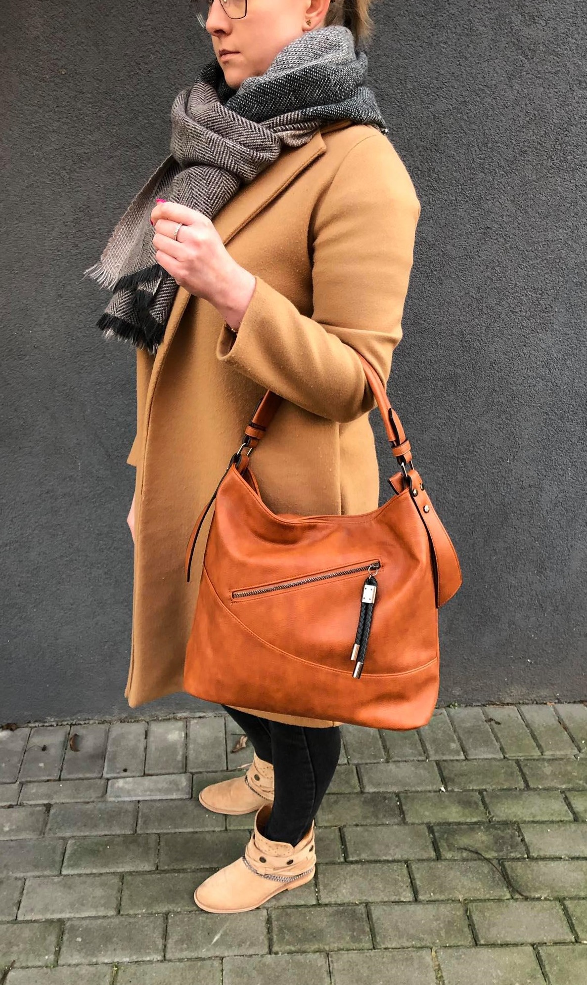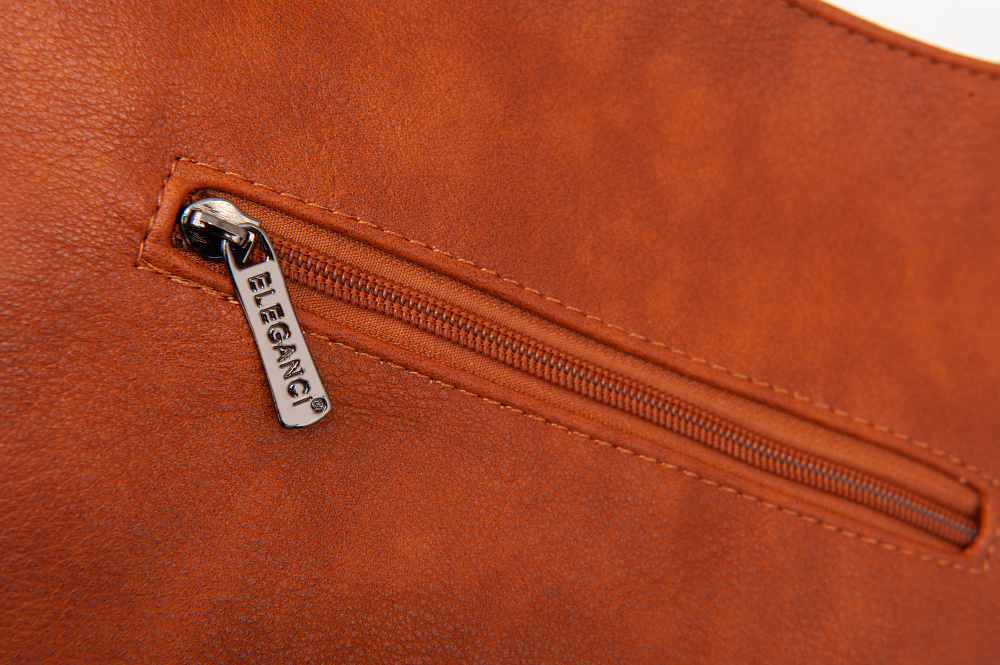 Modna torebka wykonana z wysokogatunkowej miękkiej gładkiej skóry ekologicznej najwyższej jakości. Zamykana z góry na zamek na całej szerokości. Torebka jednokomorowa przedzielona na środku dużą kieszenią na zamek, zorganizowana + wewnątrz kieszonka na zamek, jedna na telefon + duża kieszeń na zamek w środku dzieląca torebkę na dwie części + wsuwna kieszonka na drobiazgi. Wnętrze wykończone trwałą, bawełnianą mocną podszewką. Dodatkowo z tyłu torebki kieszonka na zamek + ukośna kieszonka na zamek z przodu. Torebka od spodu usztywniona. Elementy wykończenia w kolorze srebrnym. W komplecie długi regulowany pasek na ramię o długości max. 130 cm.