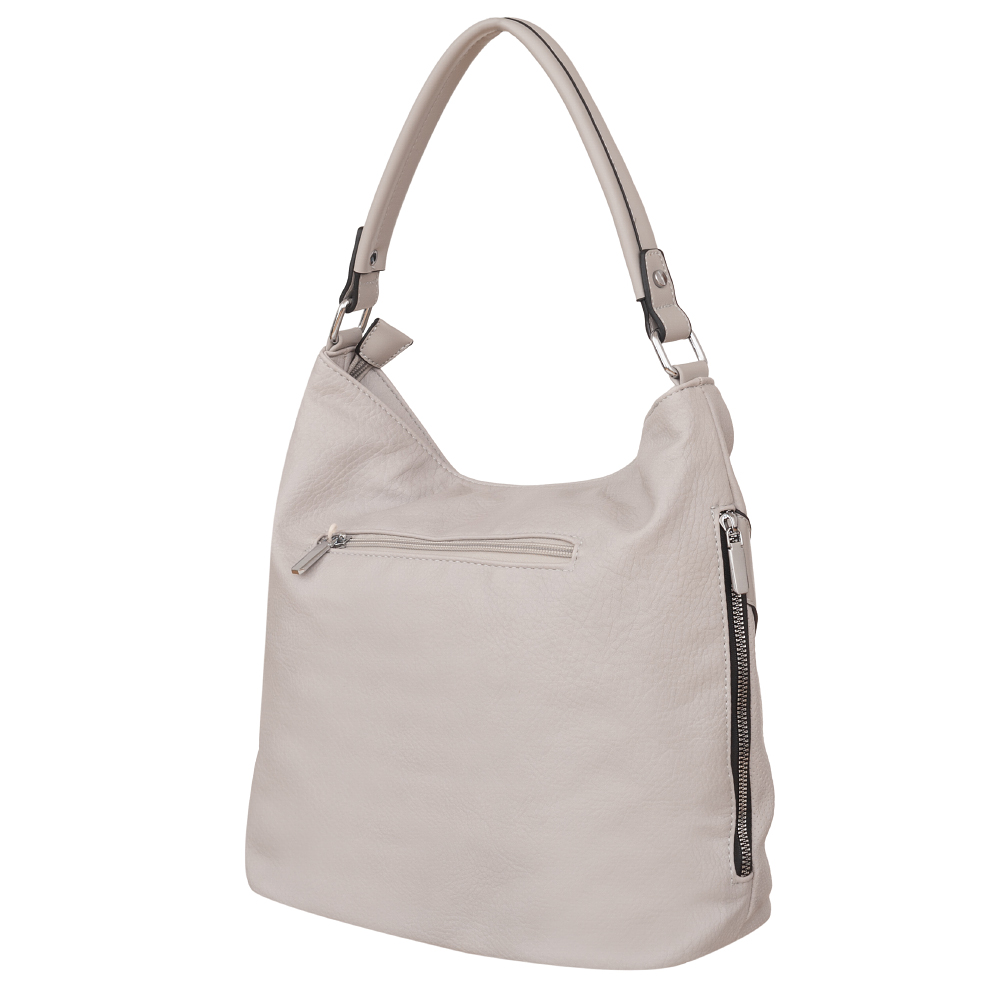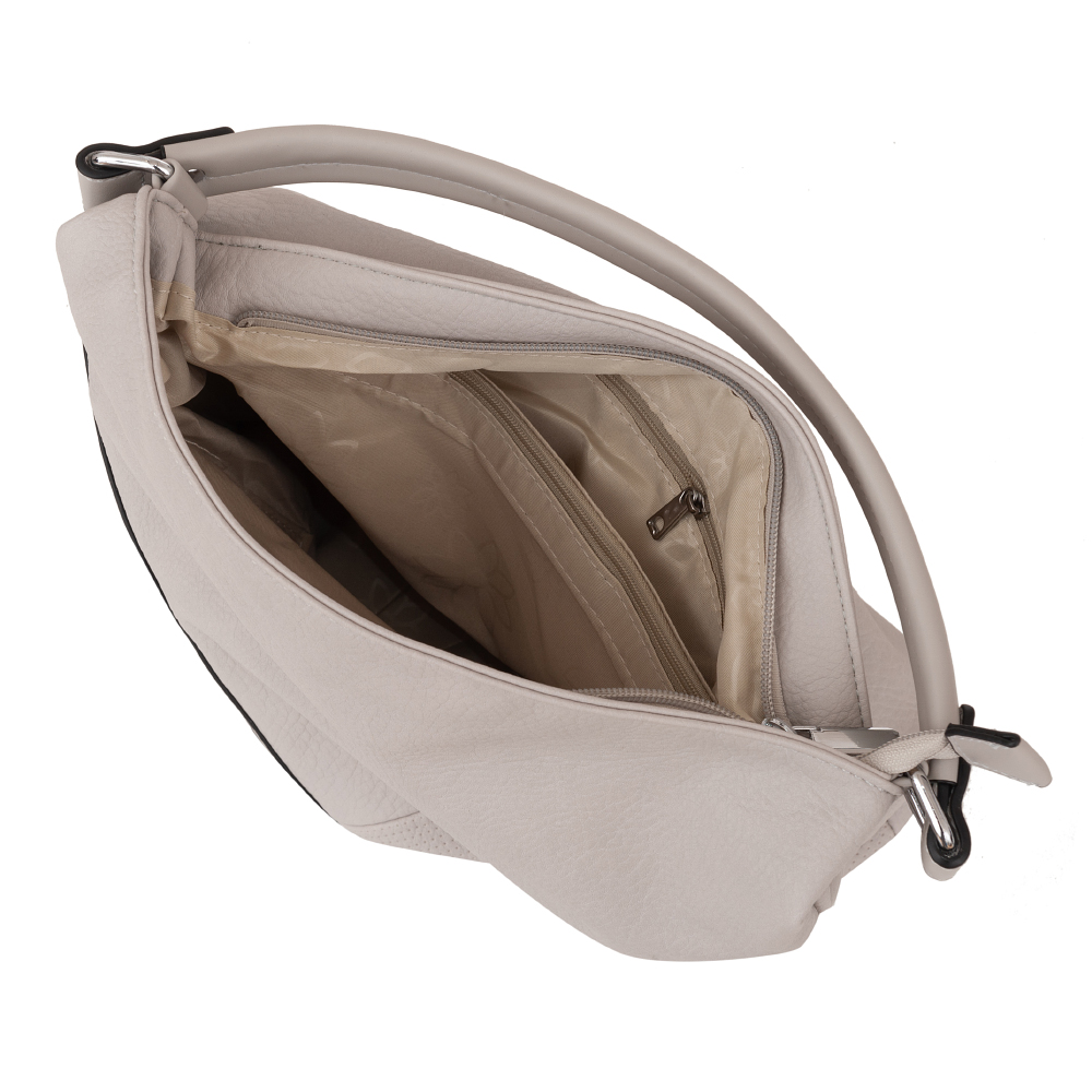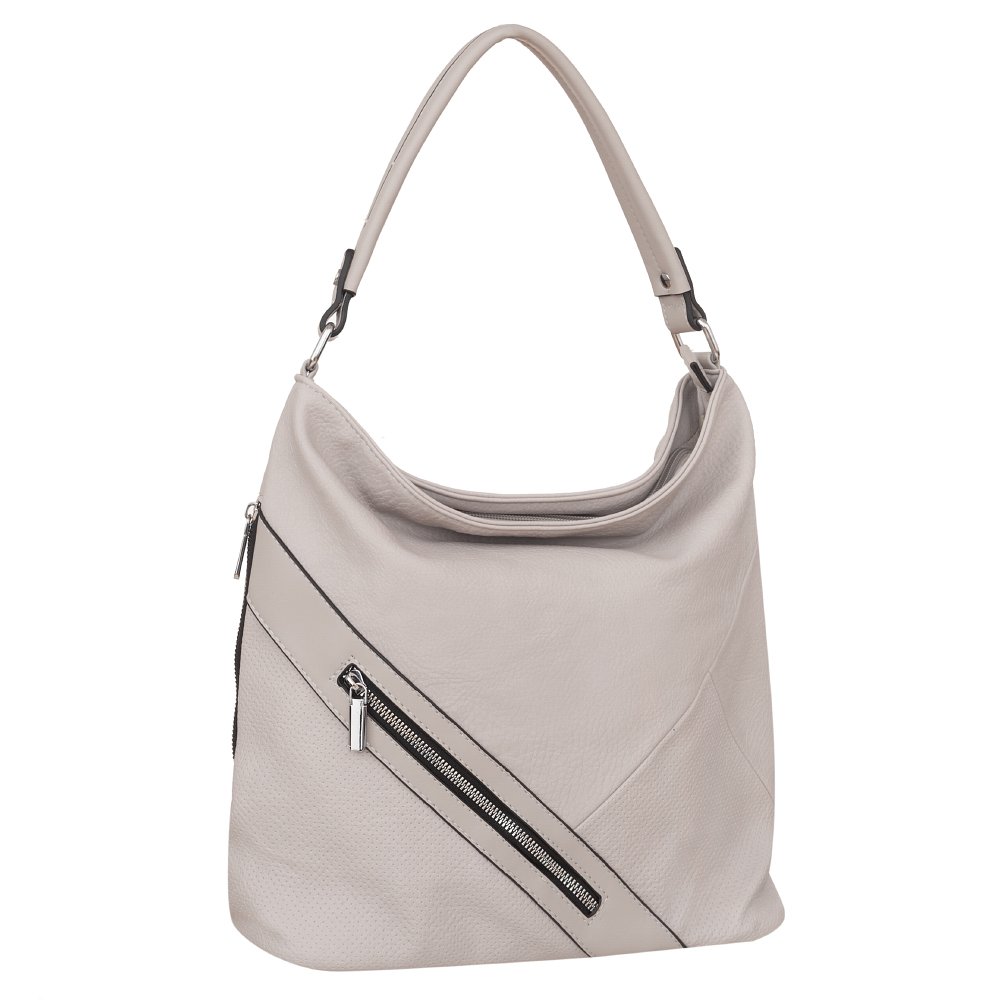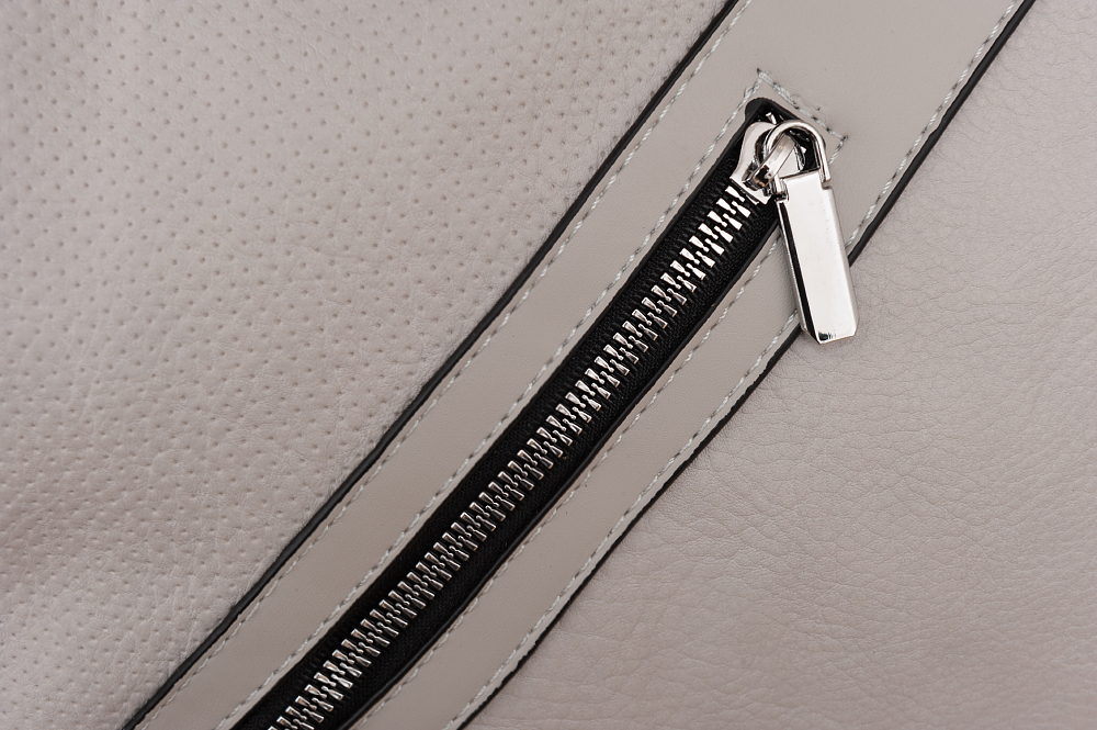 Modna, klasyczna A4 torebka wykonana z wysokogatunkowej miękkiej gładkiej skóry ekologicznej wysokiej jakości. 3 różne faktury skóry z przodu dodają torebce oryginalności. Zamykana z góry na zamek na całej szerokości. Torebka jednokomorowa, zorganizowana w środku + wewnątrz kieszonka na zamek, jedna na telefon + duża kieszeń na zamek w środku dzieląca torebkę na dwie części + wsuwna kieszonka na drobiazgi. Wnętrze wykończone trwałą, materiałową czarną podszewką. Dodatkowo z tyłu torebki kieszonka na zamek + pionowa kieszeń na boku torebki na zamek + kieszonka z przodu na zamek. Torebka od spodu usztywniona. Elementy wykończenia w kolorze srebrnym. W komplecie długi regulowany pasek na ramię o długości max. 129 cm.