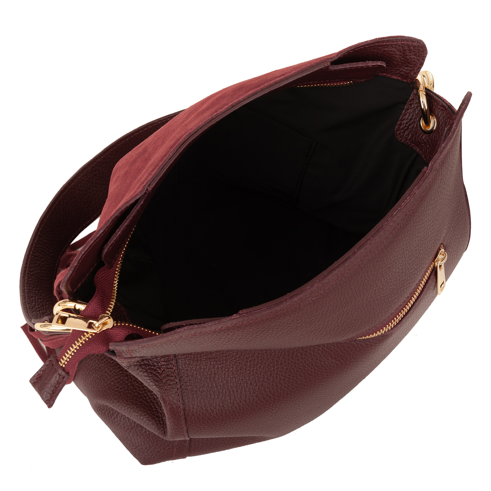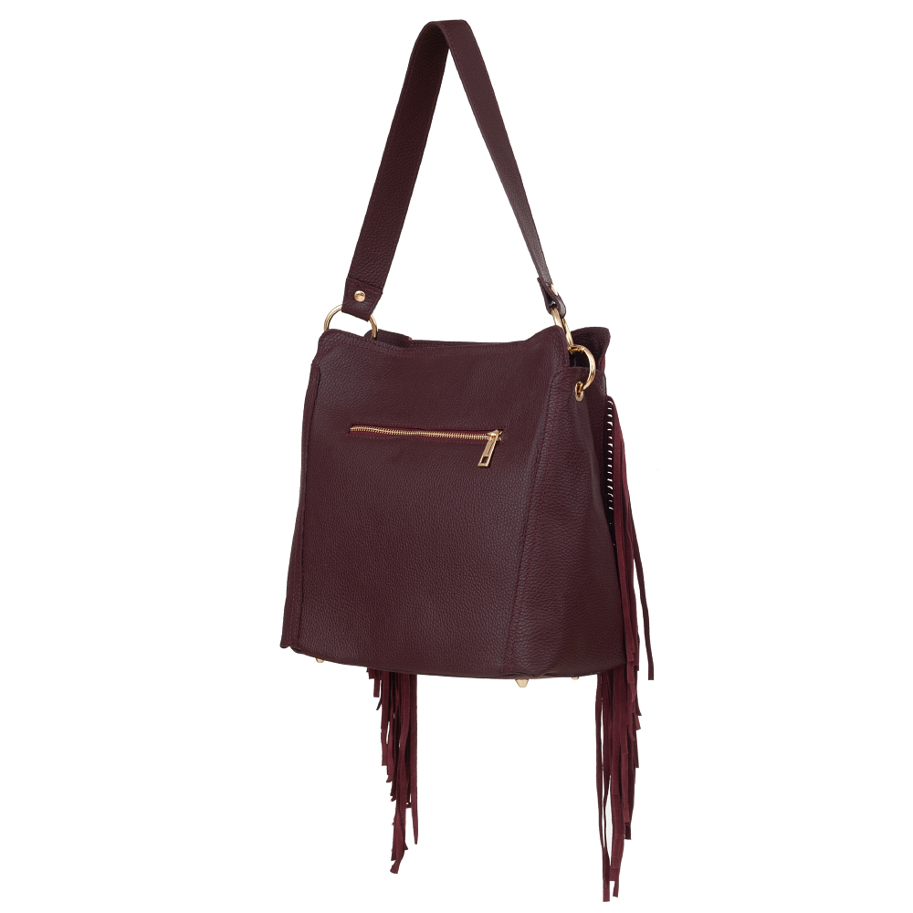 VERA PELLE - Włoska skórzana torebka wykonana z wysokogatunkowej naturalnej skóry licowej łączonej z zamszowym przodem i frędzlami. Bardzo oryginalny i praktyczny model. Zamykana z góry na zamek. Mocna, materiałowa podszewka. W środku 2 x kieszonka wsuwna + miejsce na telefon + kieszeń na zamek. Z tyłu kieszeń na zamek. Elementy wykończenia w kolorze złotym. Modny pęk frędzli po bokach. Pasek o szerokości 3,7 cm zapewni wygodne noszenie na ramieniu. Możliwość całkowitego wypięcia krótszego ucha i noszenie torebki jak listonoszkę na długim pasku. W komplecie dodatkowy regulowany pasek do max 120 cm. Torebka od spodu usztywniona i podbita metalowymi nóżkami.