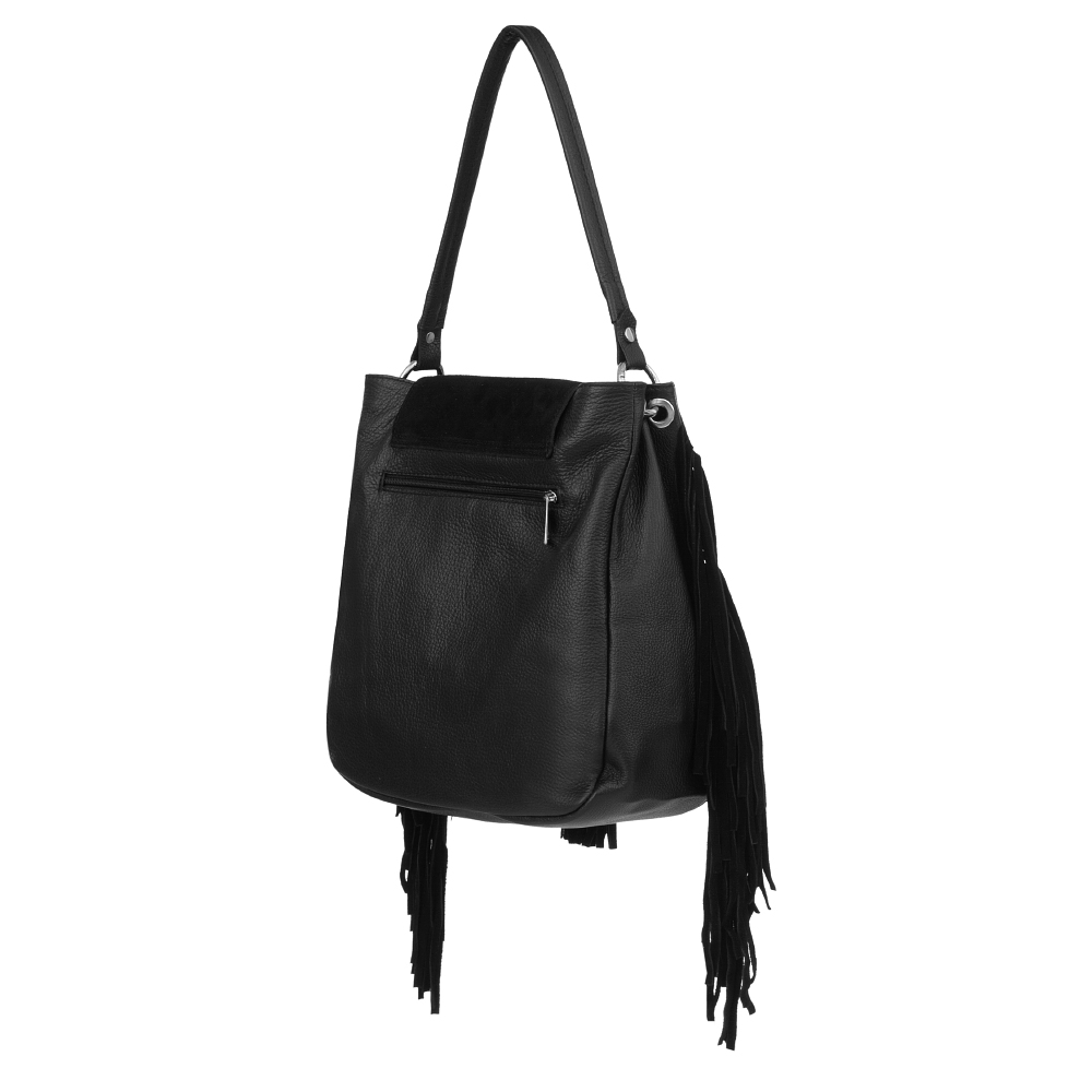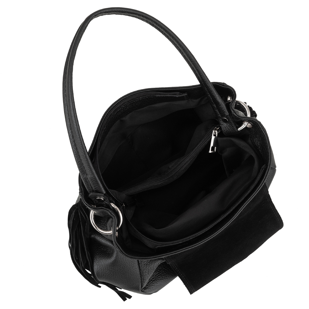 VERA PELLE - Włoska skórzana torebka wykonana z wysokogatunkowej naturalnej skóry licowej łączonej z zamszową klapą i frędzlami. Bardzo oryginalny i praktyczny model. Zamykana z góry na zamek + klapa z magnesem. W środku mocna, materiałowa podszewka. W środku 2 x kieszonka na zamek + miejsce na telefon. Z tyłu kieszeń na zamek. Elementy wykończenia w kolorze srebrnym. Modny pęk frędzli z przodu torebki przy klapie. Swobodnie można nosić ją w dłoni, przedramieniu jak i na ramieniu. W komplecie dodatkowy regulowany pasek do max 120 cm.