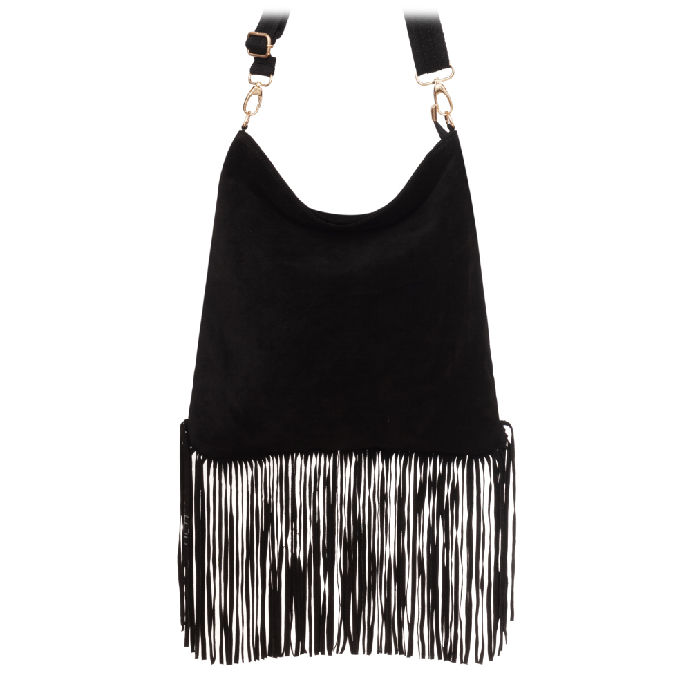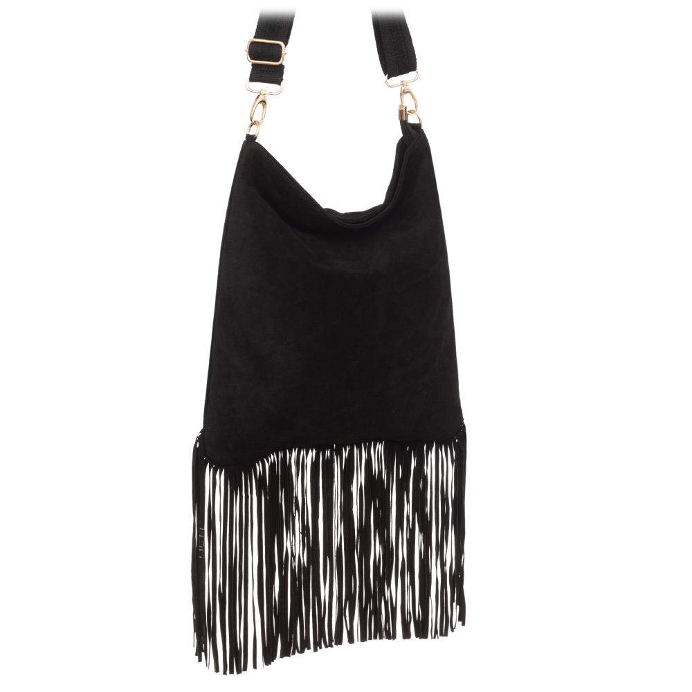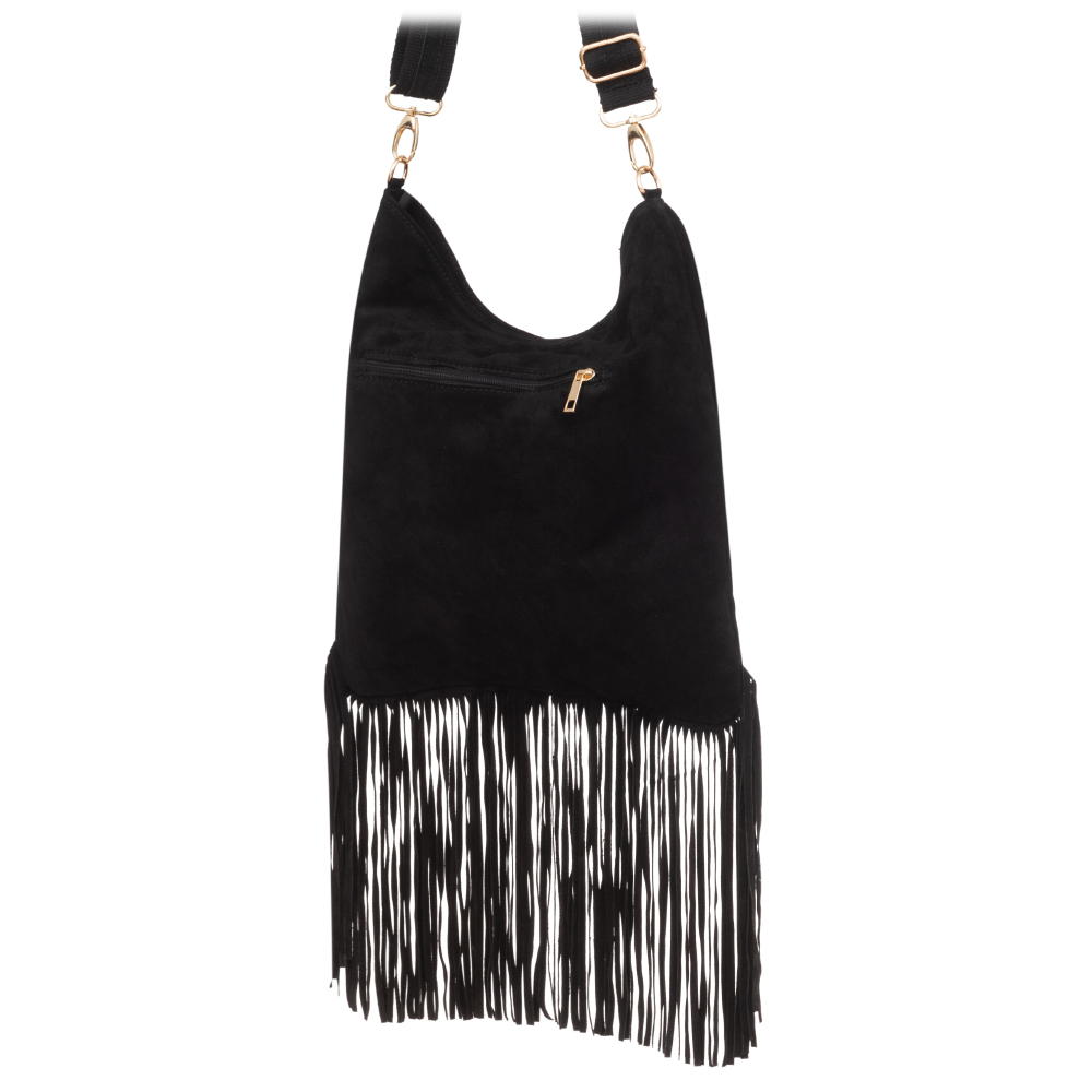 VERA PELLE - Włoska skórzana torebka listonoszka wykonana z wysokogatunkowej naturalnej skóry zamszowej z frędzlami. Bardzo oryginalny i praktyczny model. Zamykana z góry na zamek. Mocna, materiałowa podszewka. W środku kieszeń na zamek + z tyłu kieszonka na zamek. Elementy wykończenia w kolorze złotym. Modne frędzle w stylu boho hippie. Parciano-skórzany pasek o szerokości 4 cm zapewni wygodne noszenie na ramieniu. Możliwość całkowitego wypięcia.
