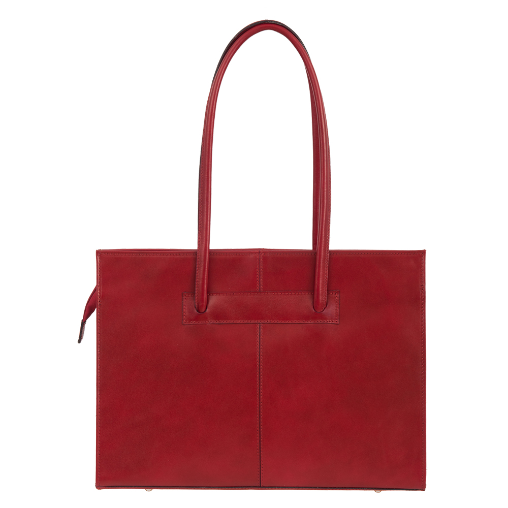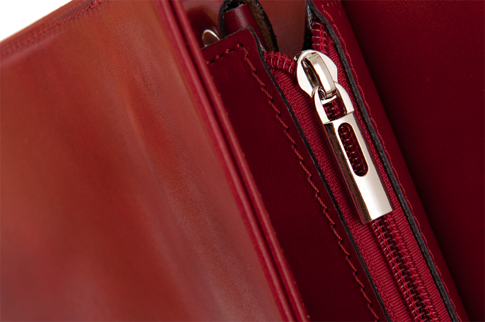 Włoska klasyczna A4 skórzana teczka / aktówka wykonana z wysokogatunkowej naturalnej gładkiej skóry licowej. Zamykana z góry na suwak. Torebka dwukomorowa przedzieloną na środku dużą kieszenią na suwak na całej szerokości. Wewnątrz jedna kieszonka na zamek, jedna na telefon + miejsce na długopisy, wizytówki. Wnętrze wykończone trwałą, czarną podszewką. Od spodu usztywniona oraz podbita nóżkami, co chroni ją przeciw uszkodzeniom i zadrapaniom. Elementy wykończenia w kolorze srebrnym. Dzięki długim uszom można swobodnie nosić na ramieniu.
