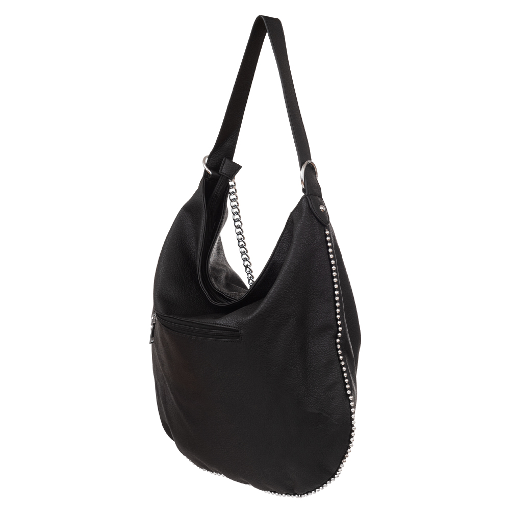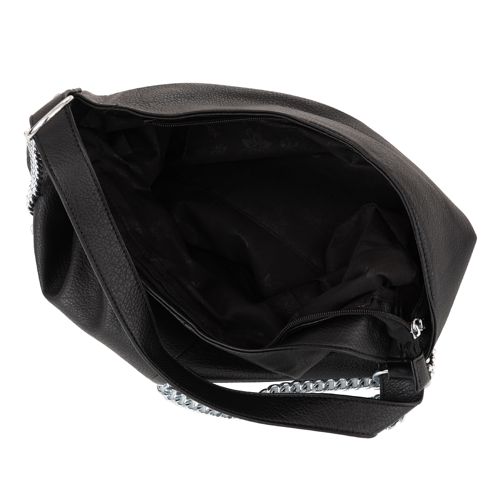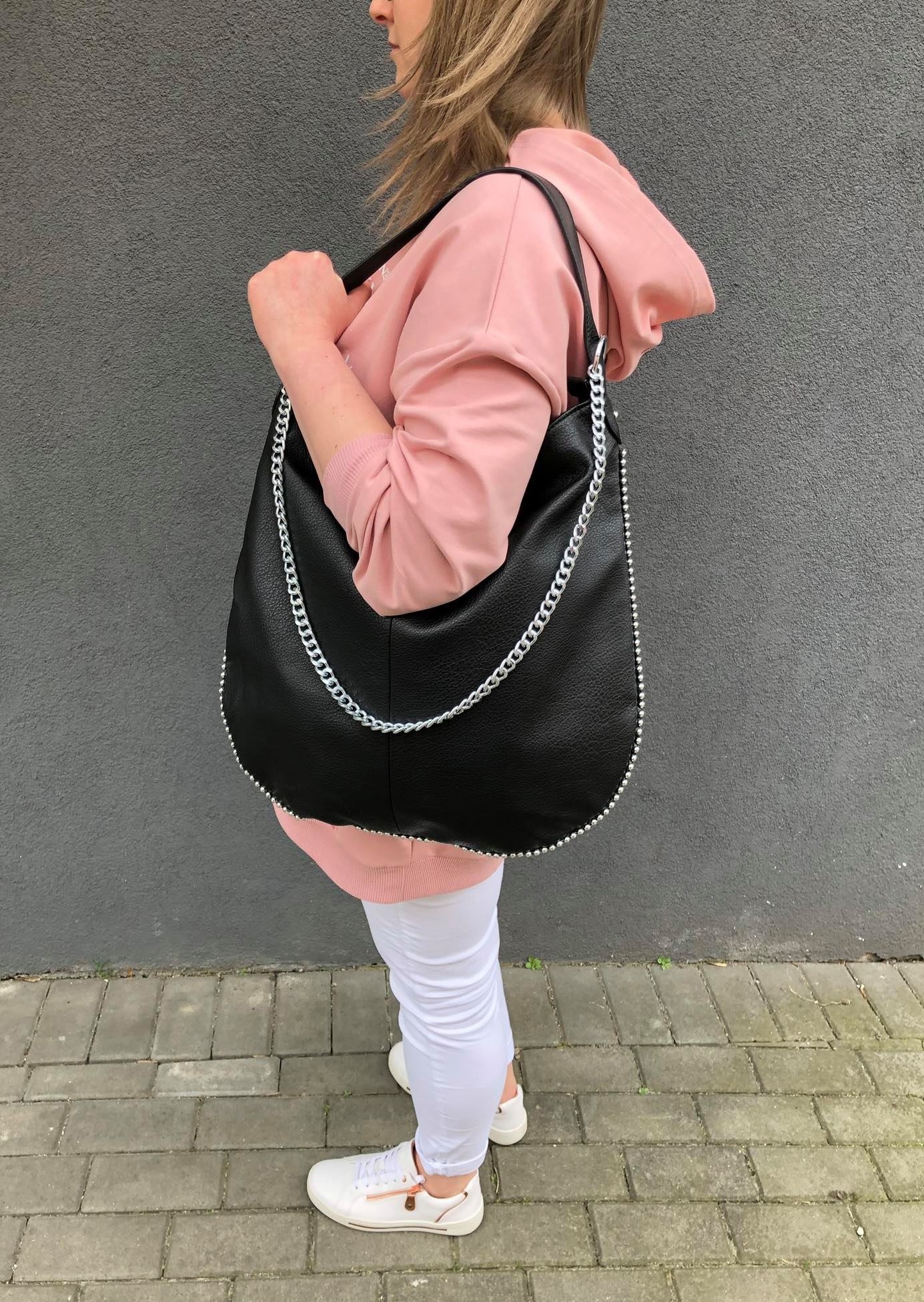 Oryginalna torebka w miejskim stylu, ozdobiona modnym łańcuszkiem. Wokół lamówki koronka z koralików dodaje jej oryginalnego charakteru. Wykonana z wysokogatunkowej miękkiej skóry ekologicznej najwyższej jakości. Torebka jednokomorowa + wewnątrz 2 x kieszonka na zamek + kieszonka na telefon + wsuwna kieszonka na drobiazgi. Z tyłu kieszeń na zamek. Wnętrze wykończone mocną bawełnianą podszewką. Elementy wykończenia w kolorze srebrnym. W komplecie dodatkowy pasek z regulacją długości.