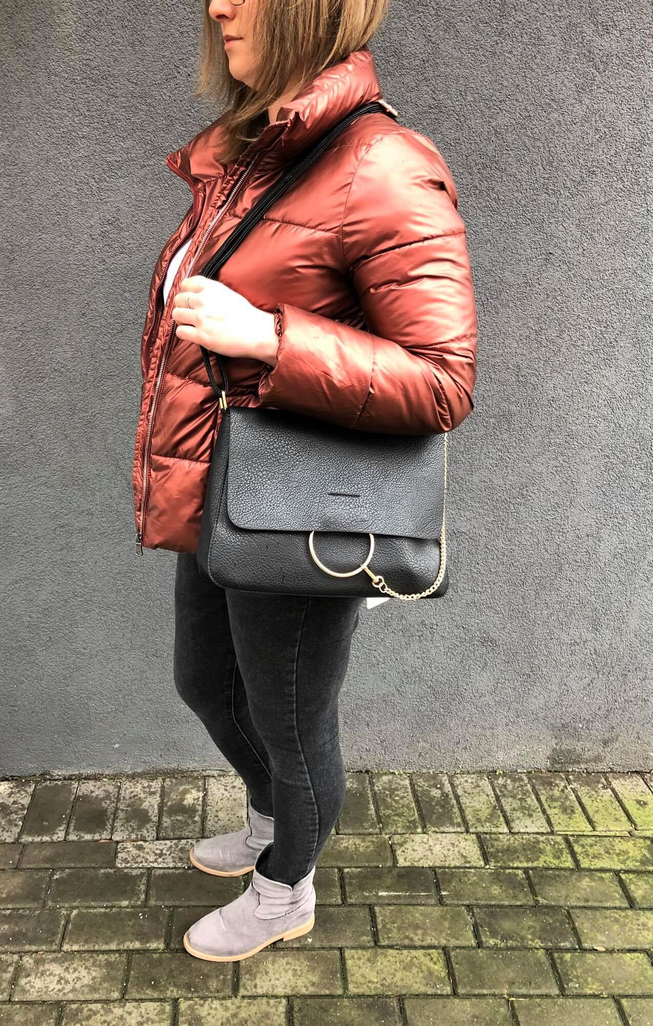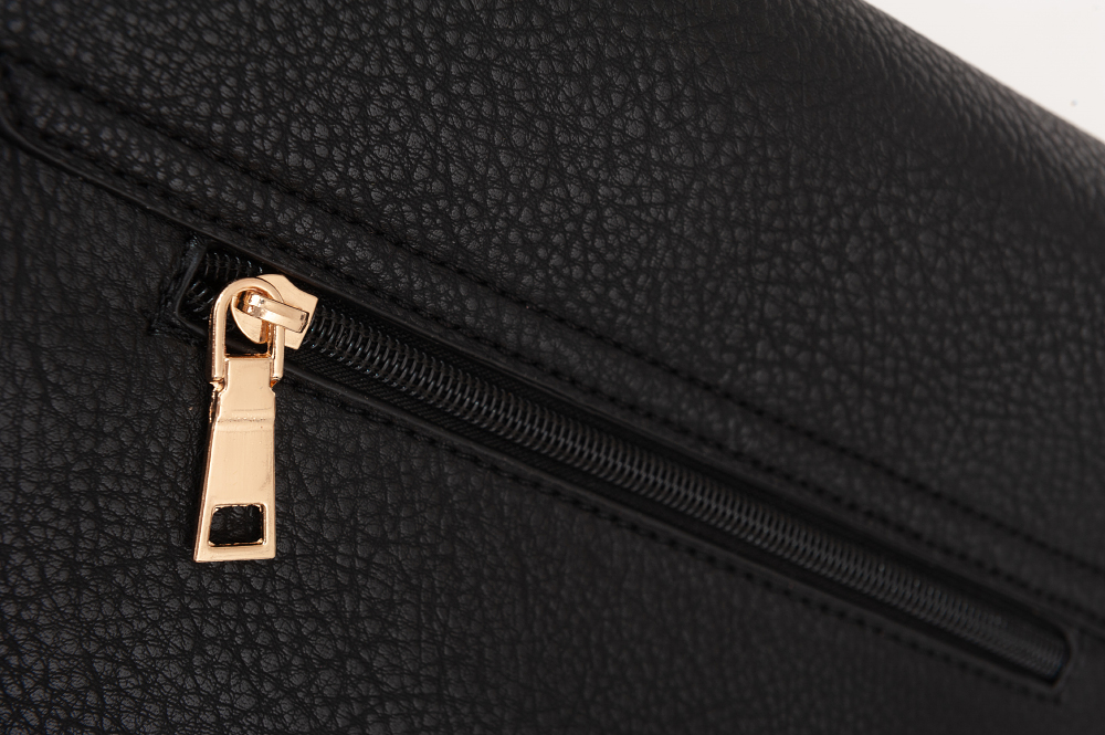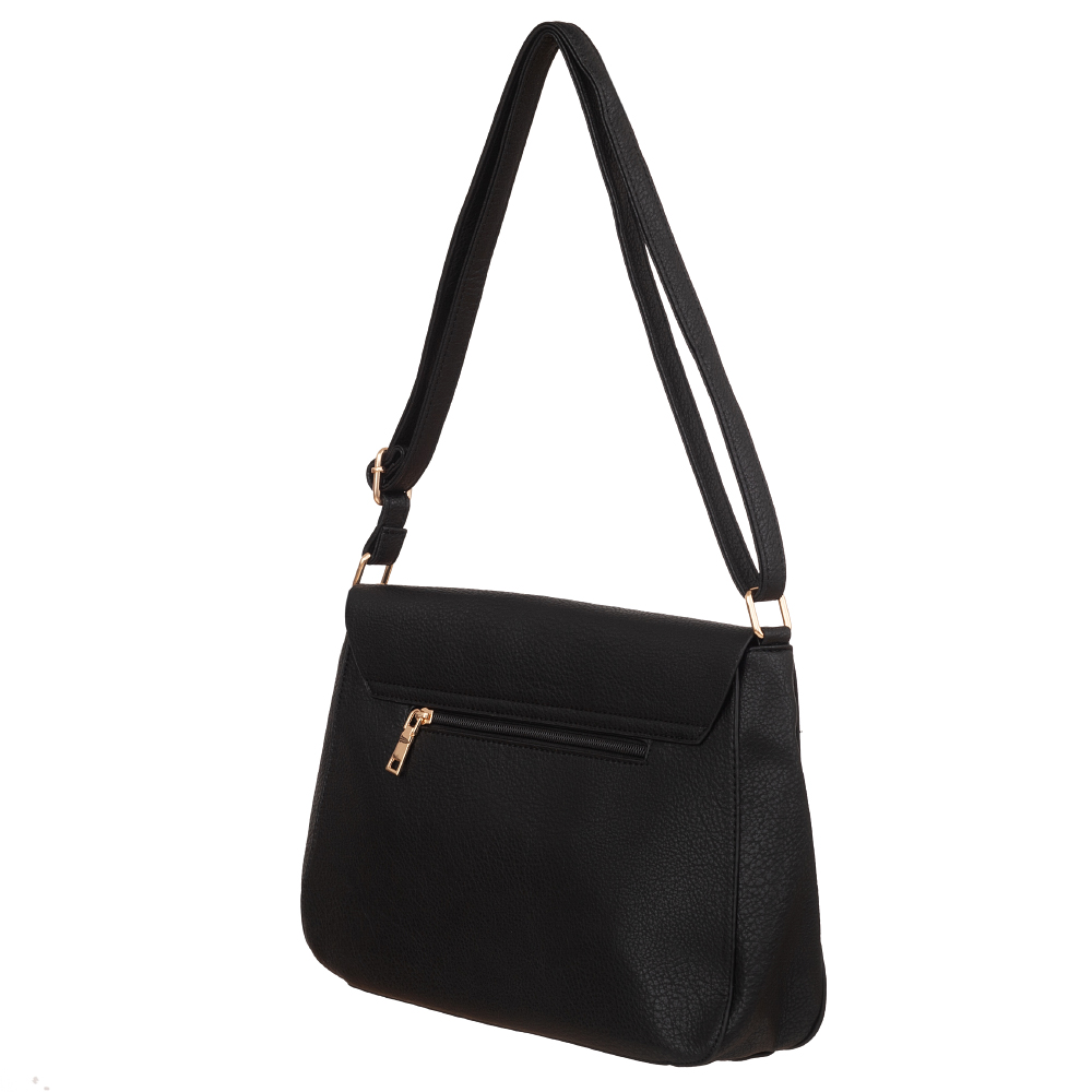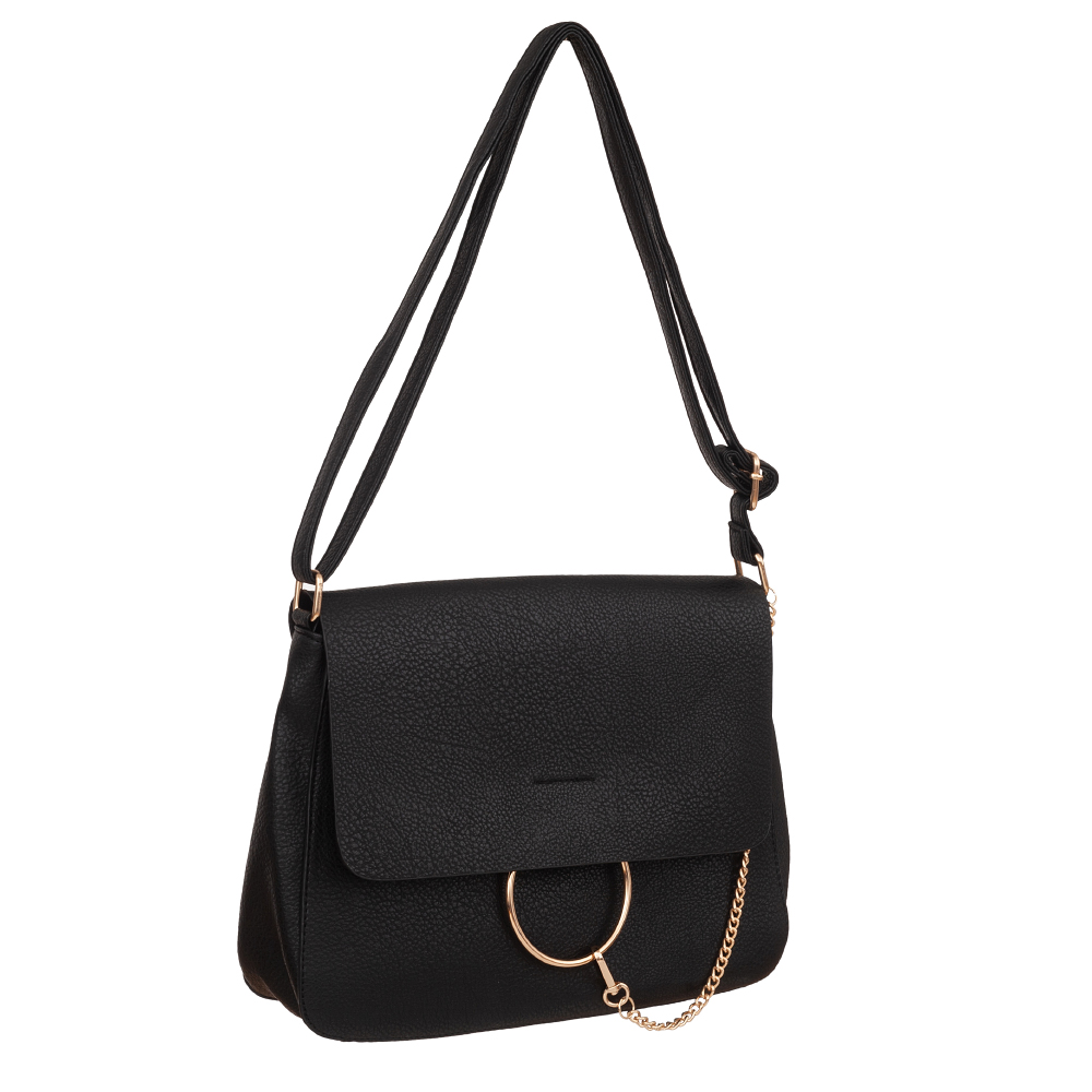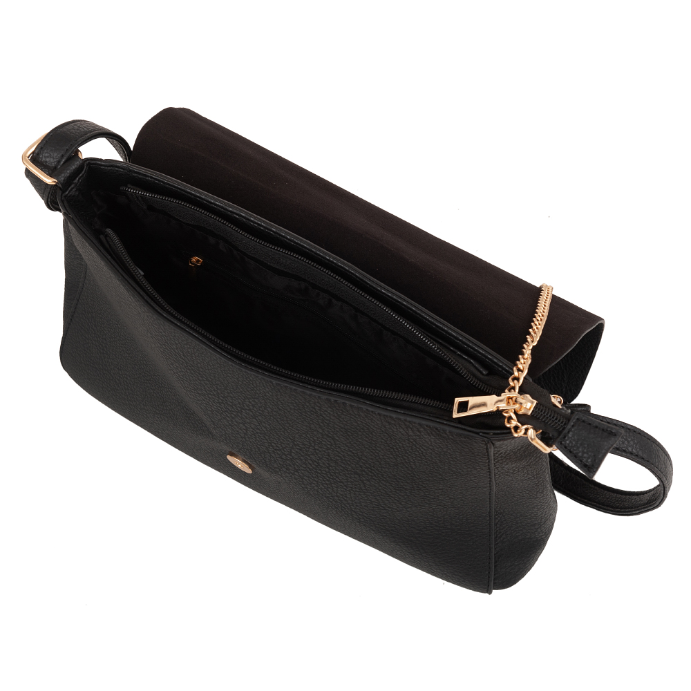 Czarna torebka listonoszka w miejskim stylu wykonana z wysokogatunkowej skóry ekologicznej wysokiej jakości. Zamykana z góry na zamek na całej szerokości torebki + klapa na magnes. Z przodu przewieszony złoty łańcuch. Torba jednokomorowa zorganizowana w środku (wewnątrz kieszonka na zamek, jedna na telefon) + dodatkowa kieszeń na zamek z tyłu. Wnętrze wykończone trwałą materiałową bawełnianą podszewką. Elementy wykończenia w kolorze złotym. Długi regulowany pasek na ramię o długości max. 135 cm.