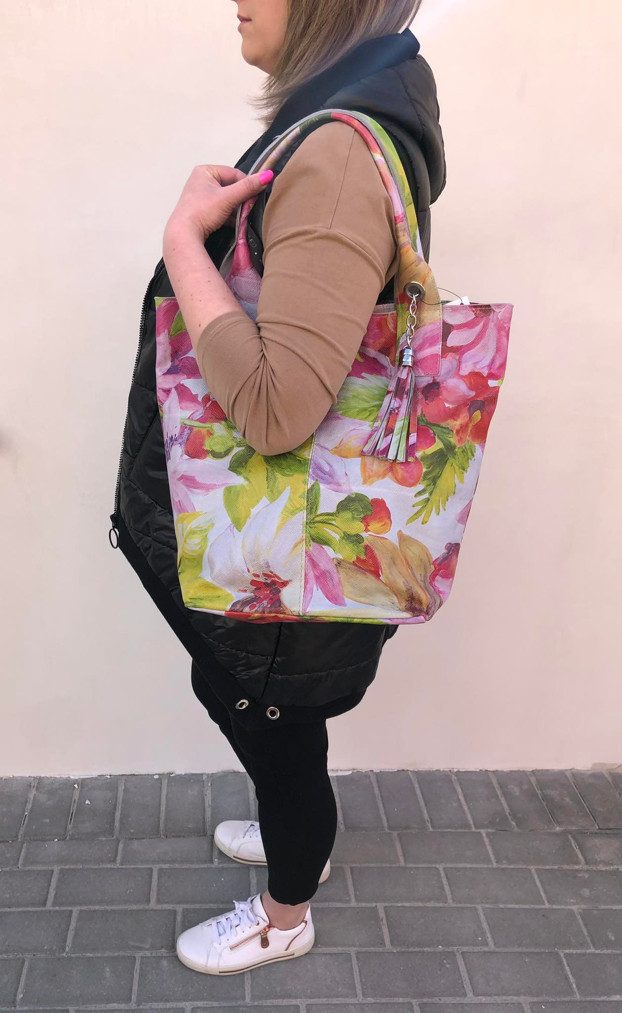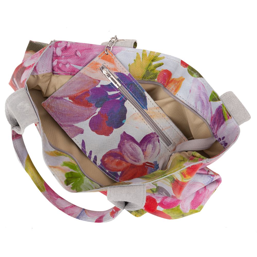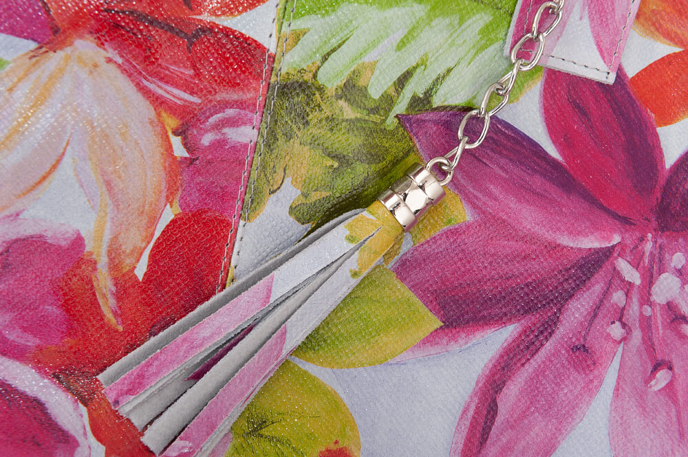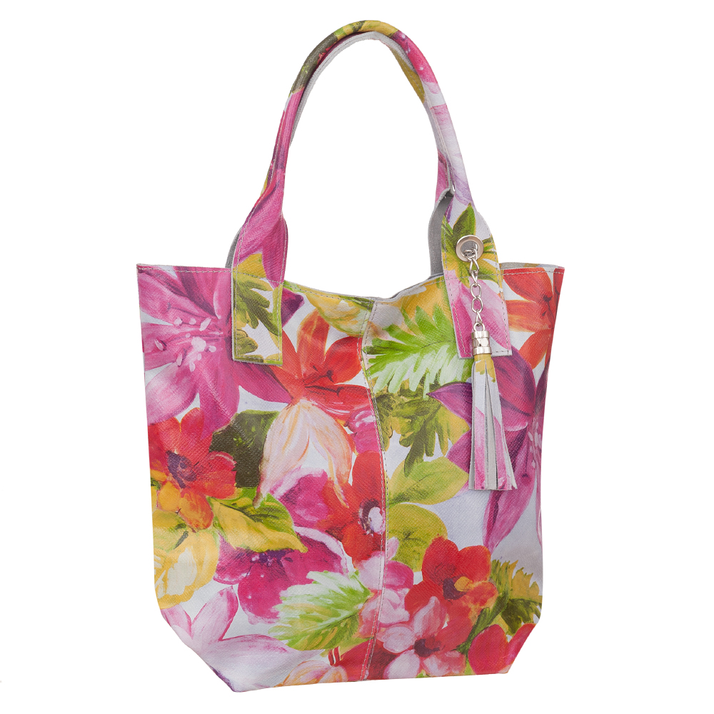 VERA PELLE Włoska skórzana torebka worek wykonana z wysokogatunkowej mocnej naturalnej skóry z motywem kwiatów. Bardzo oryginalny i praktyczny model. Zamykana z góry na zamek na całej szerokości. W środku mocna, materiałowa podszewka. Kieszonka na suwak + saszetka na suwak w środku + miejsce na telefon. Elementy metalowe wykończenia w kolorze srebrnym. Modny pęk frędzli z przodu torebki. Swobodnie można nosić ją w dłoni, przedramieniu jak i na ramieniu.