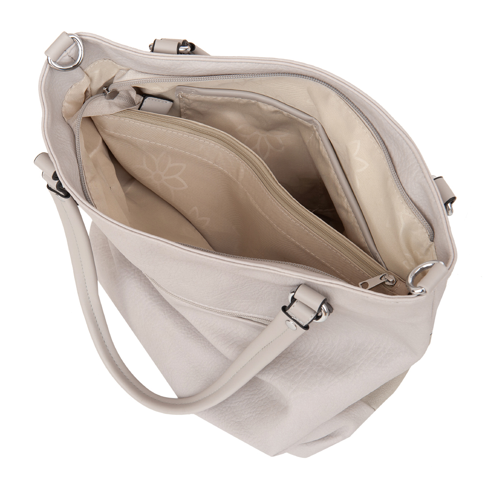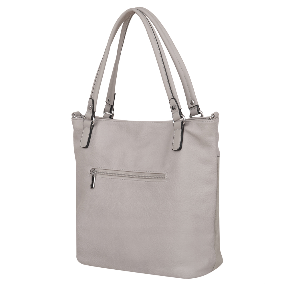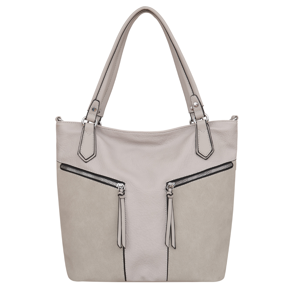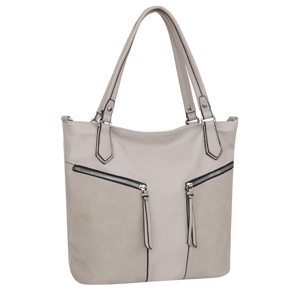 Modna, klasyczna torebka wykonana z wysokogatunkowej skóry ekologicznej wysokiej jakości. Z przodu dwie różne odcienie skóry tworzą oryginalną całość. Zamykana z góry na zamek na całej szerokości. Torebka jednokomorowa, zorganizowana w środku, przedzielona na środku dużą kieszenią na zamek + wewnątrz kieszonka na zamek, jedna na telefon + dodatkowa kieszeń na drobiazgi, klucze. Wnętrze wykończone trwałą materiałową podszewką. Dodatkowo z tyłu torebki kieszonka na zamek + 2 x ukośna kieszeń z przodu. Torebka od spodu delikatnie usztywniona. Elementy wykończenia w kolorze srebrnym. W komplecie długi regulowany pasek na ramię o długości max. 133 cm.