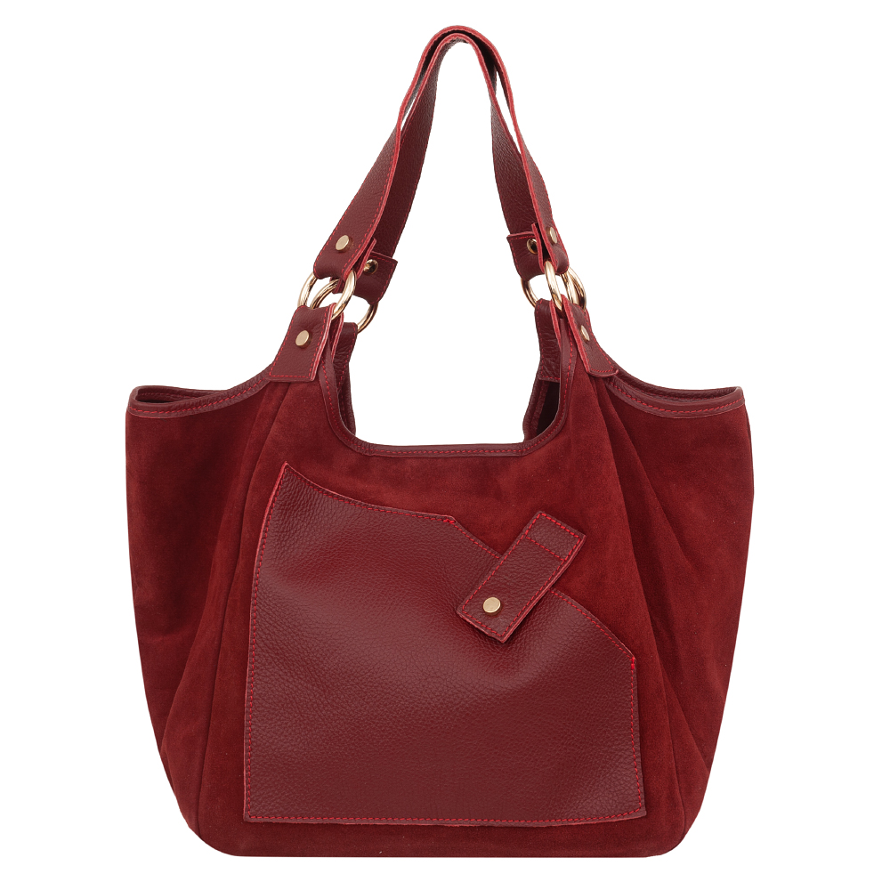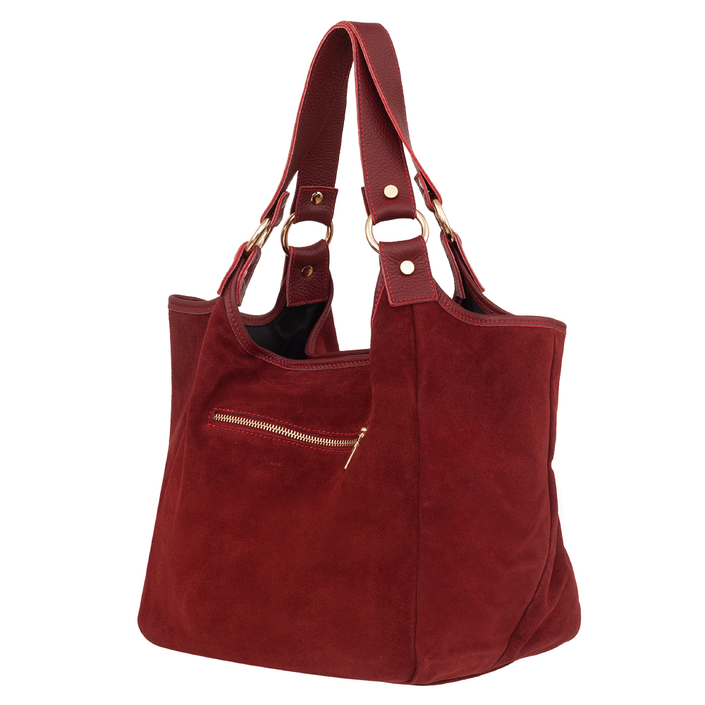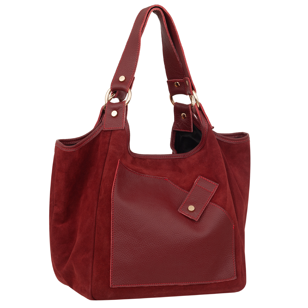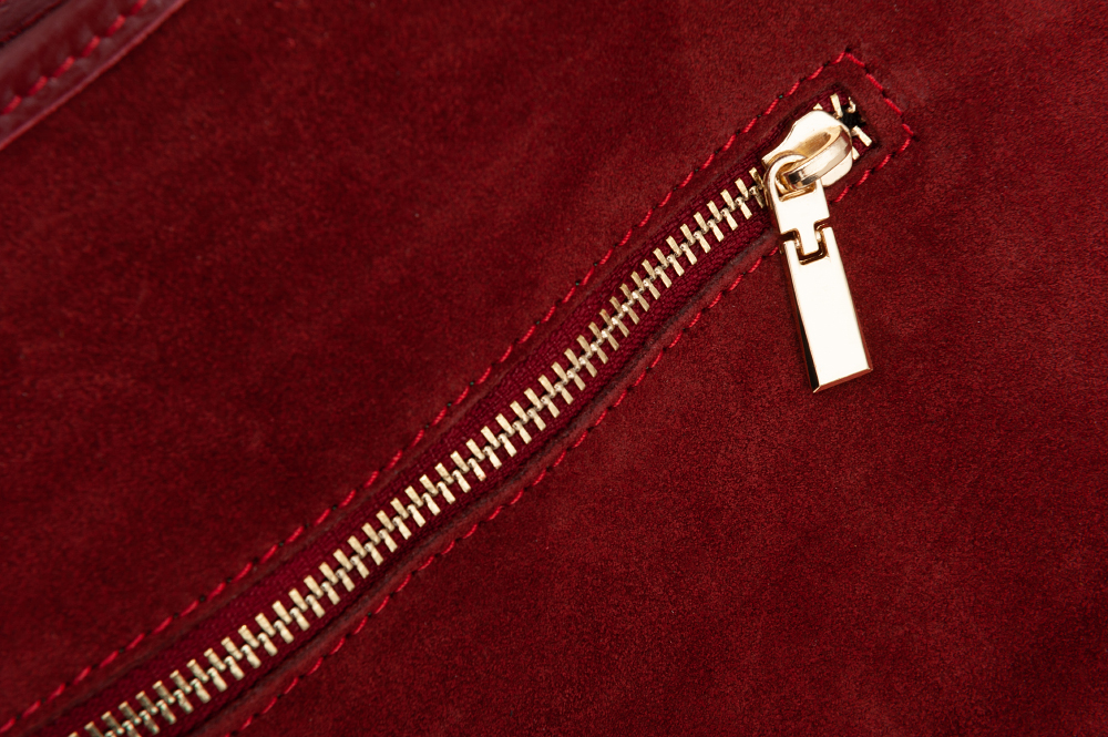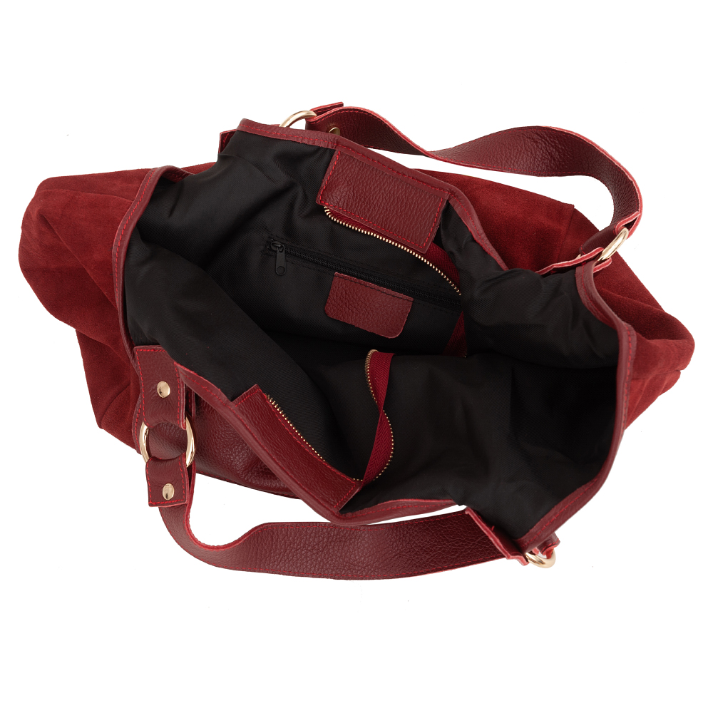 VERA PELLE włoska modna i pojemna skórzana A4 torebka wykonana z wysokogatunkowej naturalnej skóry zamszowej łącznej ze skórą licową. Wygodny dostęp do środka. Torebka jednokomorowa, od góry zamykana na krótki zamek. Wewnątrz kieszonka na zamek + duża kieszeń z przodu na magnes + kieszonka na zamek z tyłu torebki. Torebka od środka wykończona porządną materiałową podszewką w kolorze dopasowanym do skóry. Elementy wykończenia w kolorze złotym. Wygodne szerokie uszy zapewnią wygodę noszenia. W komplecie dodatkowo długi regulowany pasek.