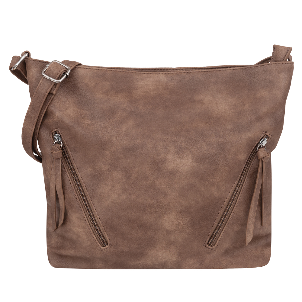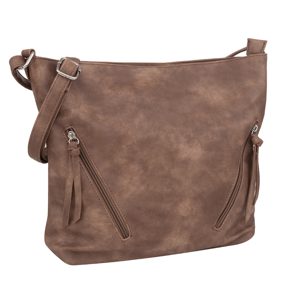 MUST HAVE - Modna, klasyczna torebka listonoszka w miejskim stylu wykonana z wysokogatunkowej skóry ekologicznej wysokiej jakości. Zamykana z góry na zamek na całej szerokości torebki. Torba jednokomorowa, zorganizowana w środku + wewnątrz kieszonka na zamek, jedna na telefon + dodatkowa kieszeń na zamek z tyłu. Z przodu dwie pionowe kieszonki na zamek. Wnętrze wykończone trwałą materiałową bawełnianą podszewką. Elementy wykończenia w kolorze srebrnym. Długi regulowany pasek na ramię o długości max. 130 cm.