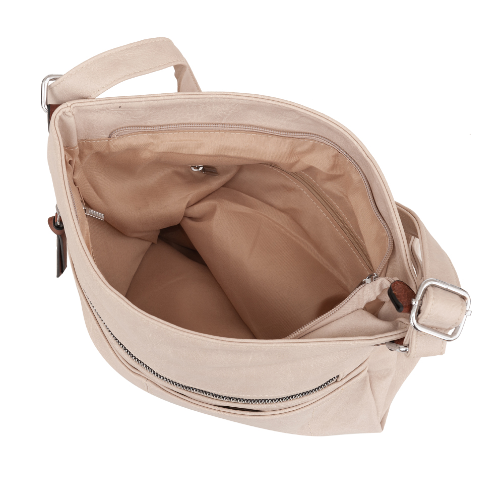 Oryginalna torebka listonoszka w miejskim stylu wykonana z wysokogatunkowej skóry ekologicznej. Zamykana z góry na zamek, torebka jednokomorowa, zorganizowana w środku + wewnątrz 2 x kieszonka na zamek, jedna na telefon + dodatkowa kieszeń na zamek z tyłu. Z przodu dwie pionowe kieszonki na rzep + kieszonka na zamek. Wnętrze wykończone trwałą materiałową bawełnianą podszewką. Elementy wykończenia w kolorze srebrnym. Długi regulowany pasek na ramię o długości max. 135 cm.