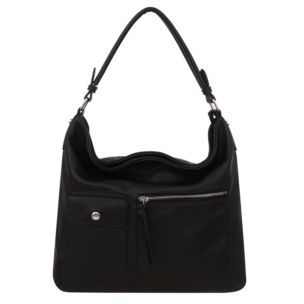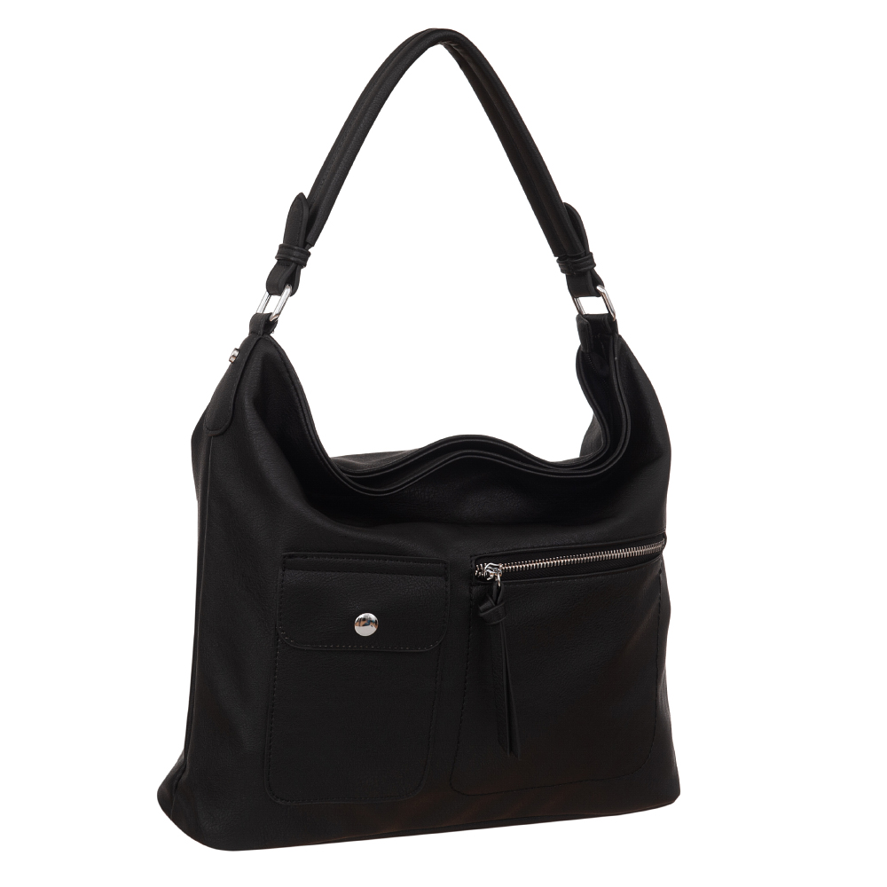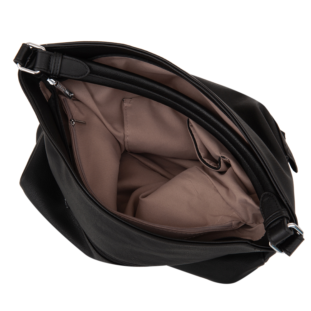 Modna torebka wykonana z wysokogatunkowej miękkiej gładkiej skóry ekologicznej najwyższej jakości. Zamykana z góry na zamek na całej szerokości. Torebka jednokomorowa, przedzielona na środku, zorganizowana + wewnątrz kieszonka na zamek, jedna na telefon + duża kieszeń na zamek w środku dzieląca torebkę na dwie części + wsuwna kieszonka na drobiazgi. Wnętrze wykończone trwałą, bawełnianą mocną podszewką. Dodatkowo z przodu i z tyłu torebki kieszonka na zamek. Torebka od spodu usztywniona. Elementy wykończenia w kolorze srebrnym. W komplecie długi regulowany pasek na ramię o długości max. 130 cm.