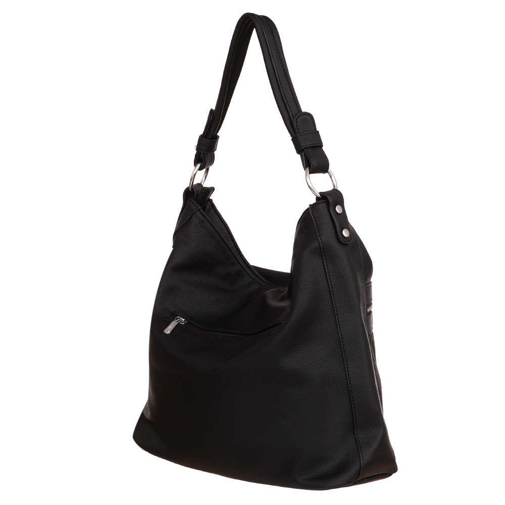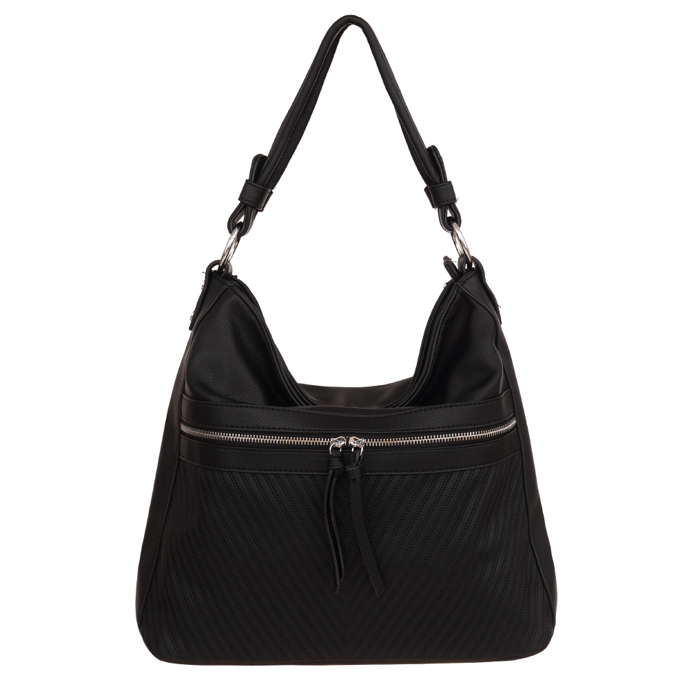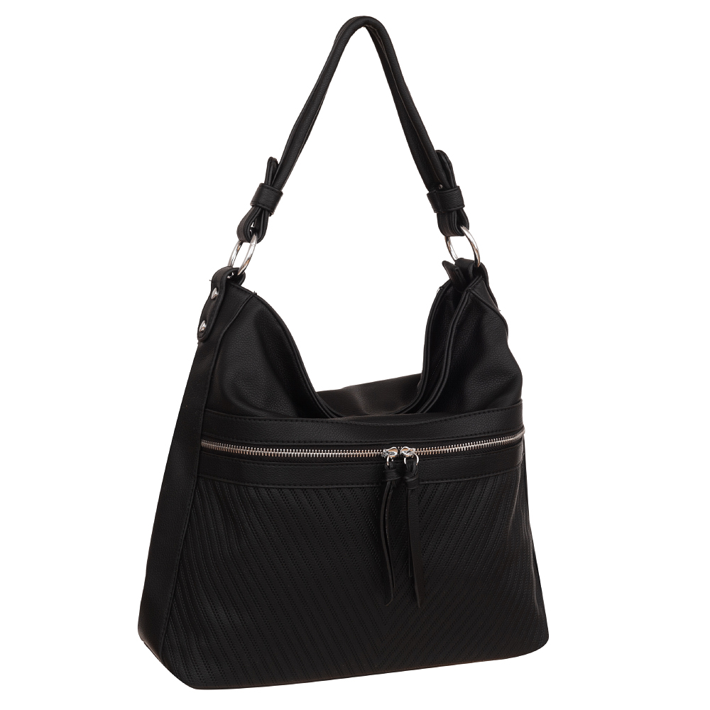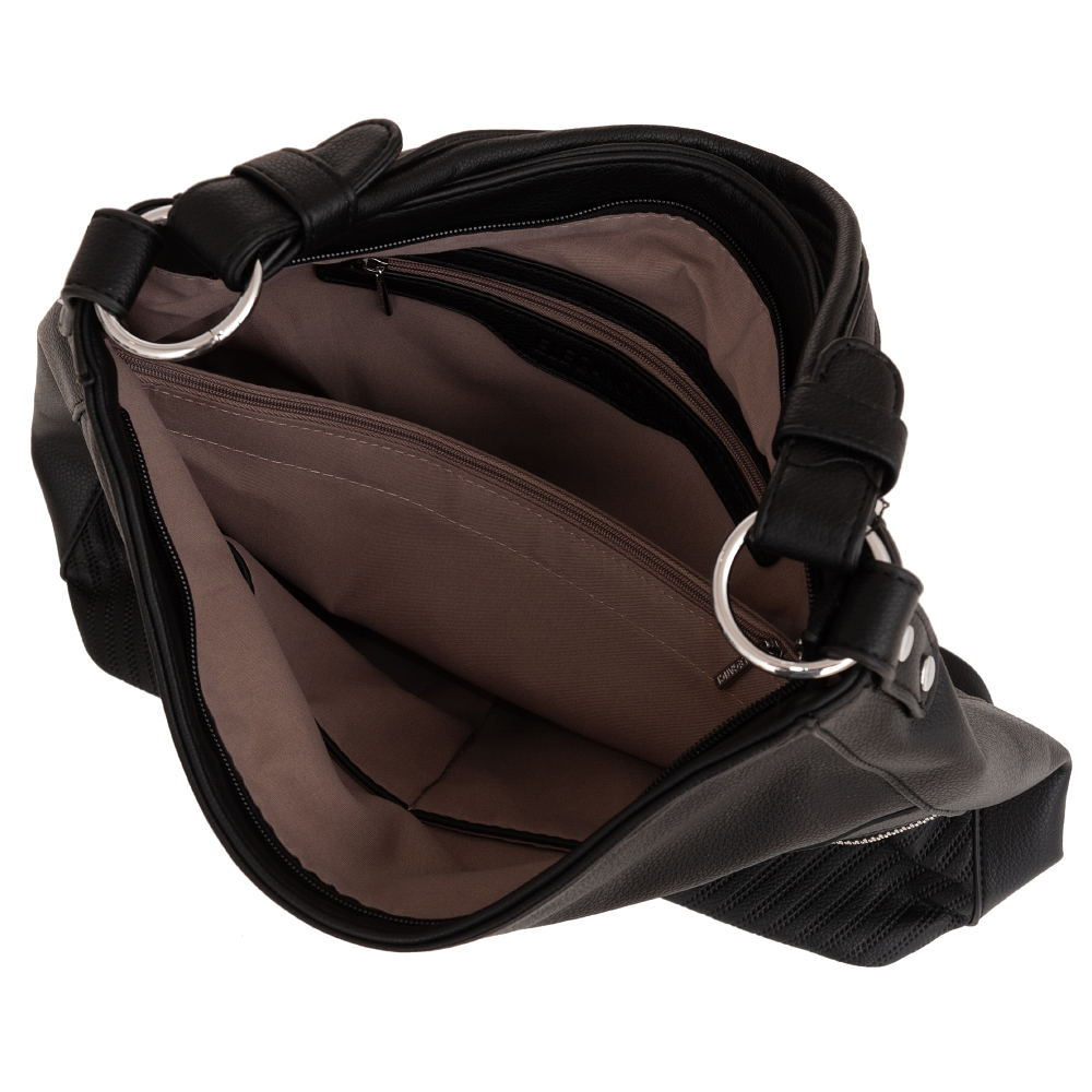 Modna torebka wykonana z wysokogatunkowej miękkiej gładkiej skóry ekologicznej najwyższej jakości. Zamykana z góry na zamek na całej szerokości. Torebka jednokomorowa, przedzielona na środku dużą kieszenią na zamek, zorganizowana + wewnątrz kieszonka na zamek, jedna na telefon + duża kieszeń na zamek + wsuwna kieszonka na drobiazgi. Wnętrze wykończone trwałą, bawełnianą mocną podszewką. Dodatkowo z przodu i z tyłu torebki kieszonka na zamek. Torebka od spodu usztywniona. Elementy wykończenia w kolorze srebrnym. W komplecie długi regulowany pasek na ramię o długości max. 130 cm.