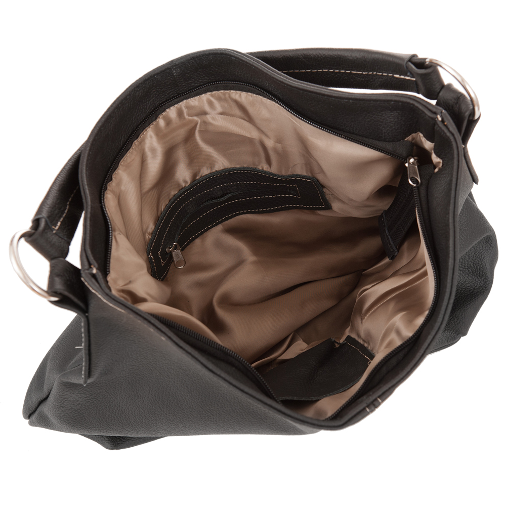 Skórzana, miękka A4 torebka wykonana w całości ze skóry naturalnej licowej. Zamykana z góry na suwak. Torebka dwukomorowa przedzielona na środku dużą kieszenią na zamek. Wewnątrz jedna kieszonka na zamek oraz jedna na telefon. Dodatkowo z tyłu kieszonka na suwak. Wnętrze wykończone trwałą, materiałową podszewką. Dodatkowy pasek z możliwością regulacji długości od 65 cm do 130 cm. Metalowe elementy w kolorze srebrnym. Dno torebki usztywnione.