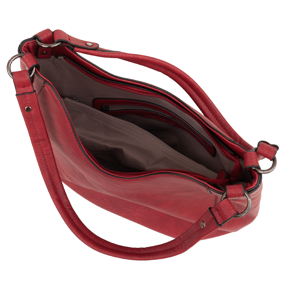 Modna, klasyczna A4 torebka wykonana z wysokogatunkowej gładkiej skóry ekologicznej wysokiej jakości. Zamykana z góry na zamek na całej szerokości. Torebka dwukomorowa, zorganizowana w środku i przedzielona dużą kieszenią na zamek. Wewnątrz 2 kieszonki na zamek, jedna na telefon + dodatkowa kieszeń na drobiazgi. Wnętrze wykończone trwałą, materiałową podszewką. Dodatkowo z tyłu torebki kieszonka na suwak. Torebka od spodu delikatnie usztywniona. Elementy wykończenia w kolorze srebrnym (inox). W komplecie długi regulowany pasek na ramię o długości max. 129 cm.