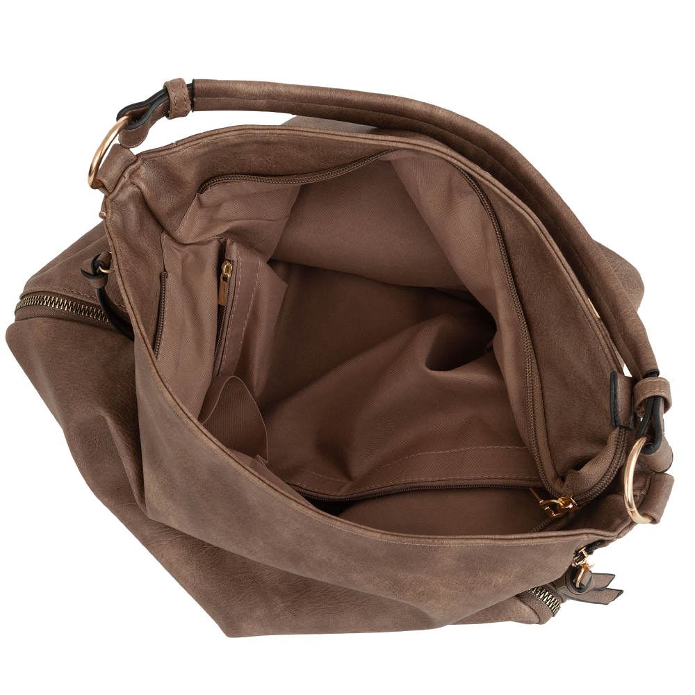 MUST HAVE - Modna, klasyczna torebka w miejskim stylu wykonana z wysokogatunkowej skóry ekologicznej wysokiej jakości. Z przodu dwie pionowe kieszonki. Zamykana z góry na zamek na całej szerokości torebki. Torba jednokomorowa, zorganizowana w środku + wewnątrz kieszonka na zamek, jedna na telefon + dodatkowa kieszeń na drobiazgi. Wnętrze wykończone trwałą materiałową podszewką. Dodatkowo z tyłu torebki kieszonka na zamek. Torebka od spodu delikatnie usztywniona. Elementy wykończenia w kolorze złotym. W komplecie długi regulowany pasek na ramię o długości max. 129 cm.