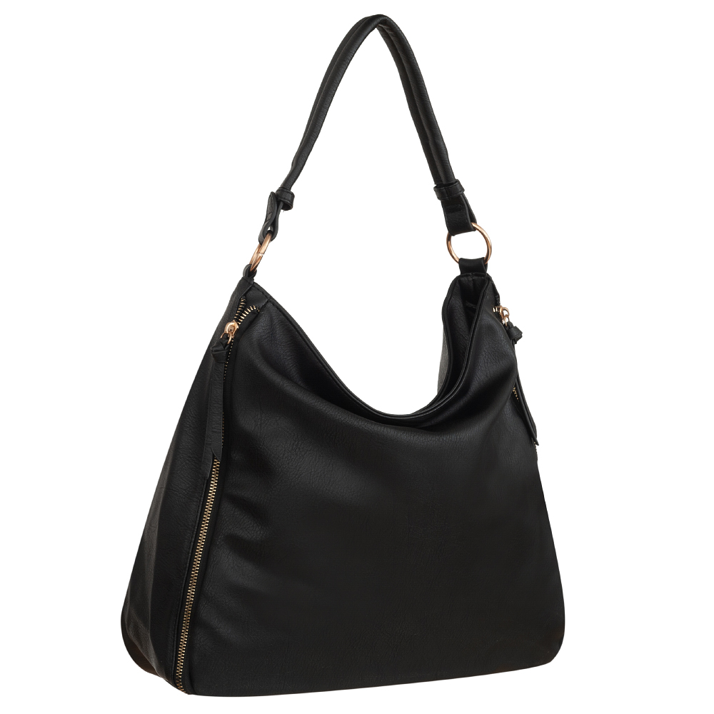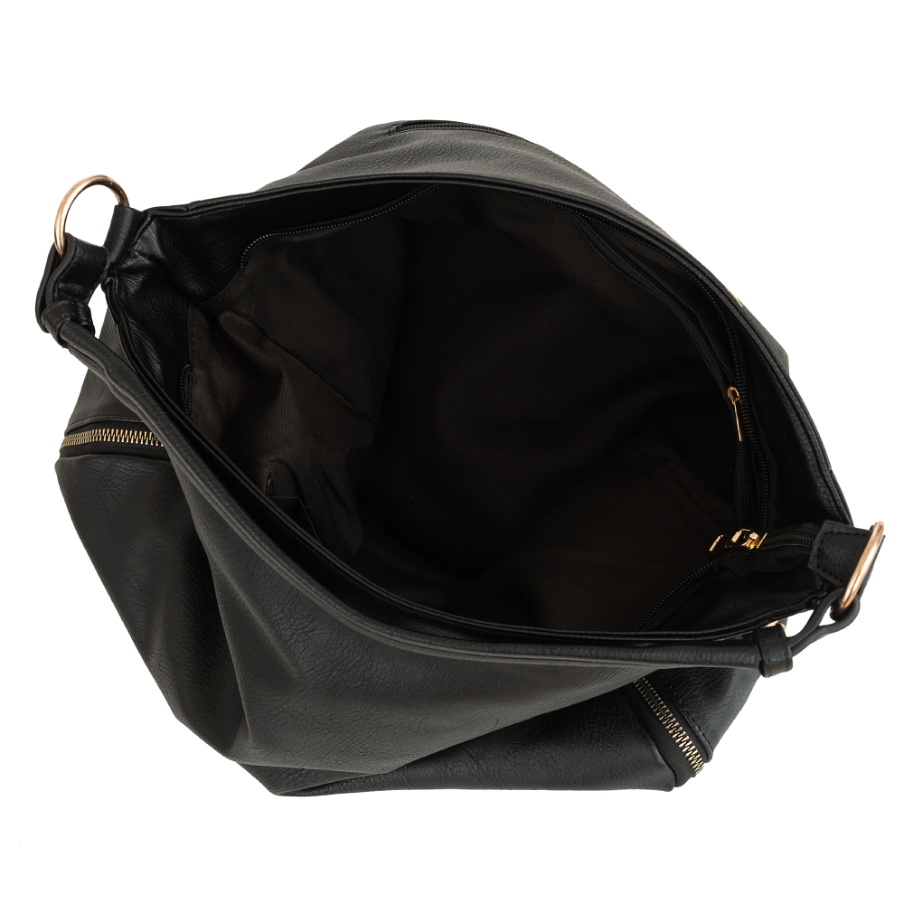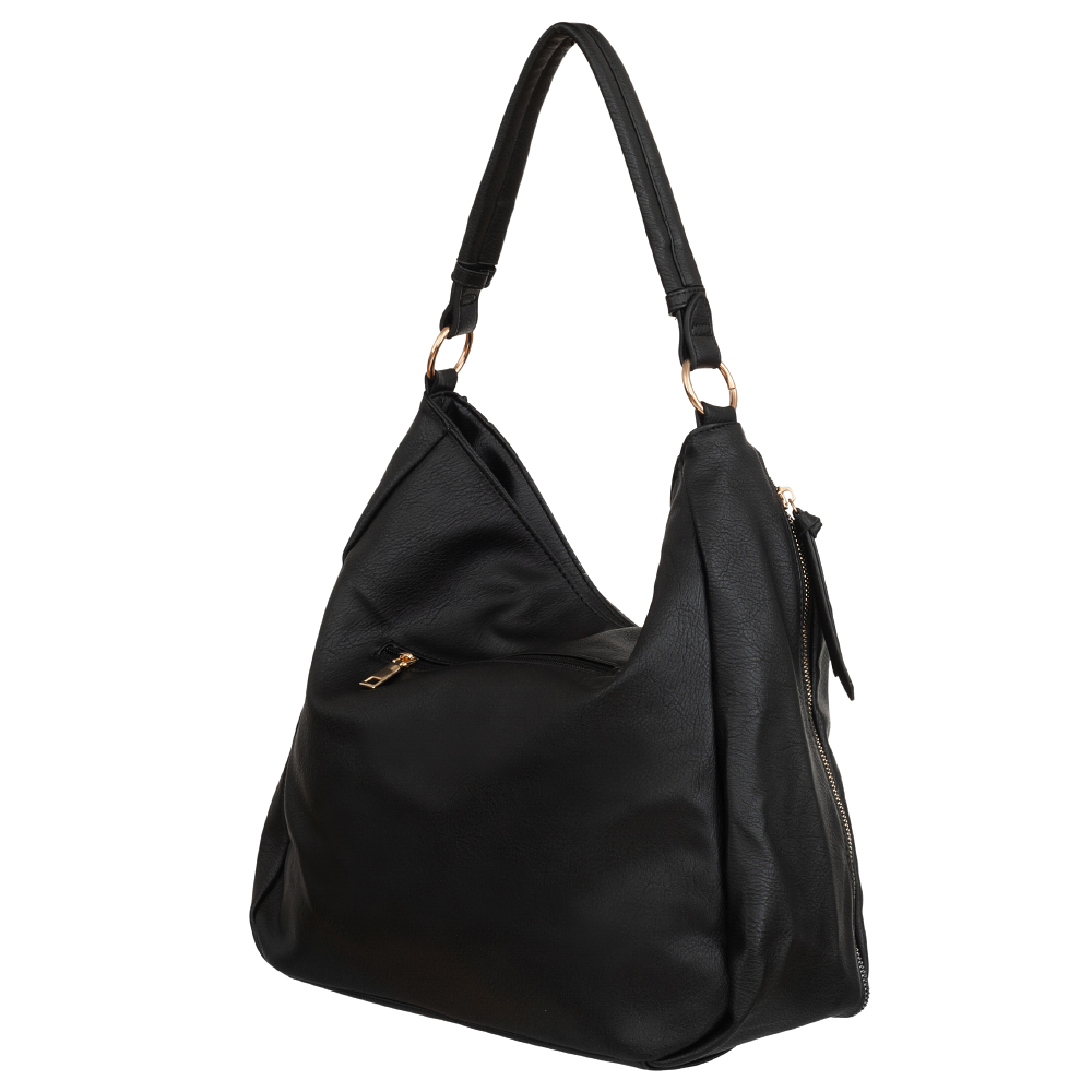 MUST HAVE - Modna, klasyczna torebka w miejskim stylu wykonana z wysokogatunkowej skóry ekologicznej wysokiej jakości. Z przodu dwie pionowe kieszonki. Zamykana z góry na zamek na całej szerokości torebki. Torba jednokomorowa, zorganizowana w środku + wewnątrz kieszonka na zamek, jedna na telefon + dodatkowa kieszeń na drobiazgi. Wnętrze wykończone trwałą materiałową podszewką. Dodatkowo z tyłu torebki kieszonka na zamek. Torebka od spodu delikatnie usztywniona. Elementy wykończenia w kolorze złotym. W komplecie długi regulowany pasek na ramię o długości max. 129 cm.
