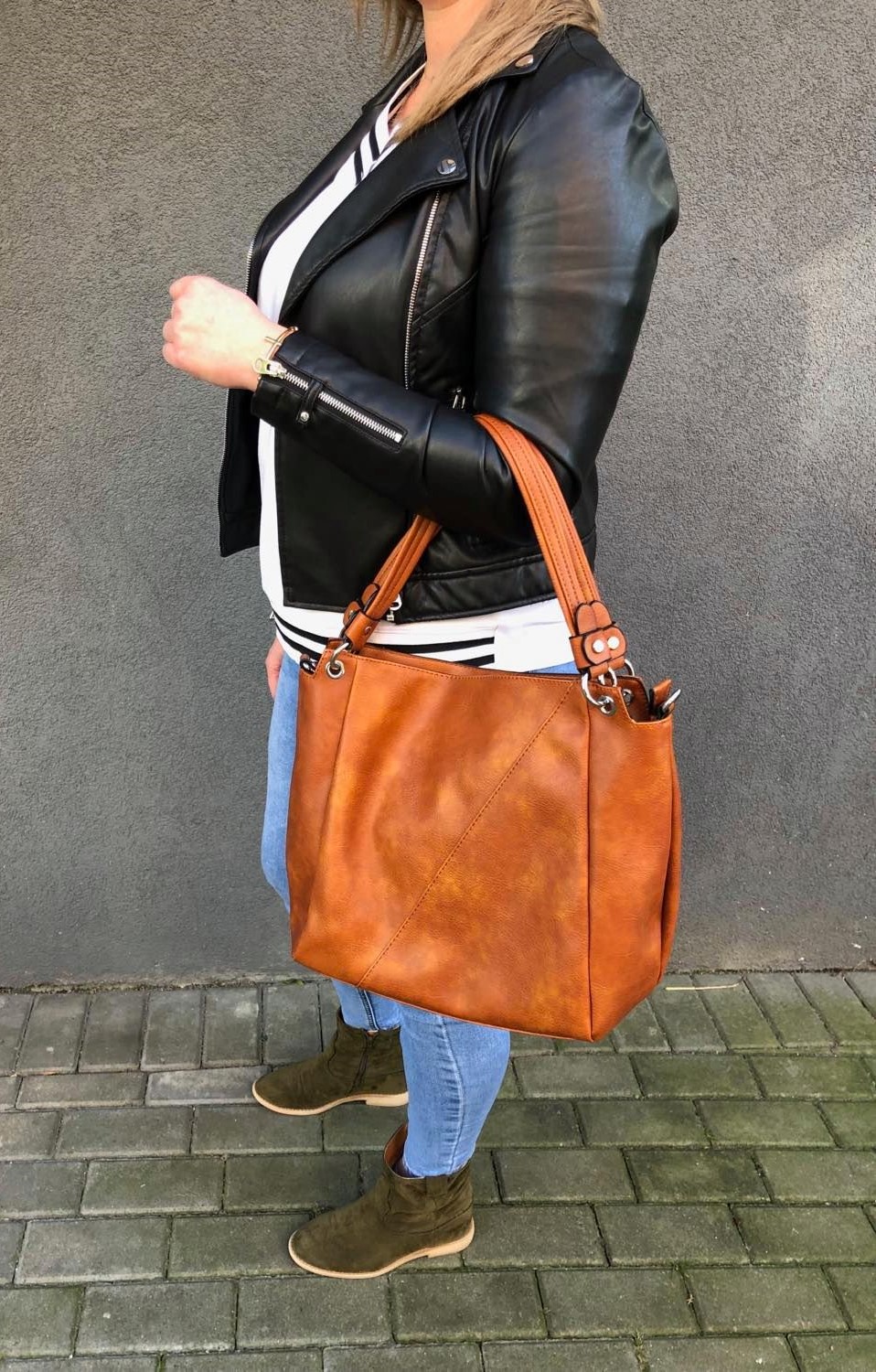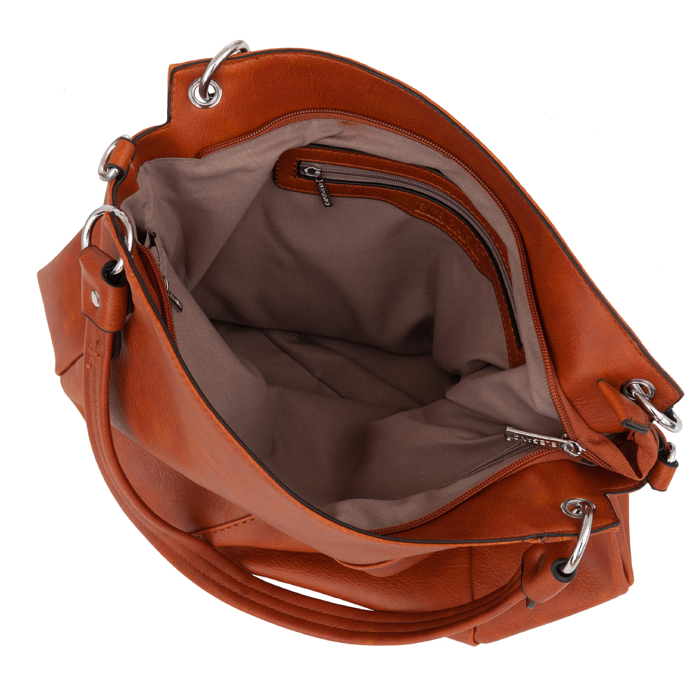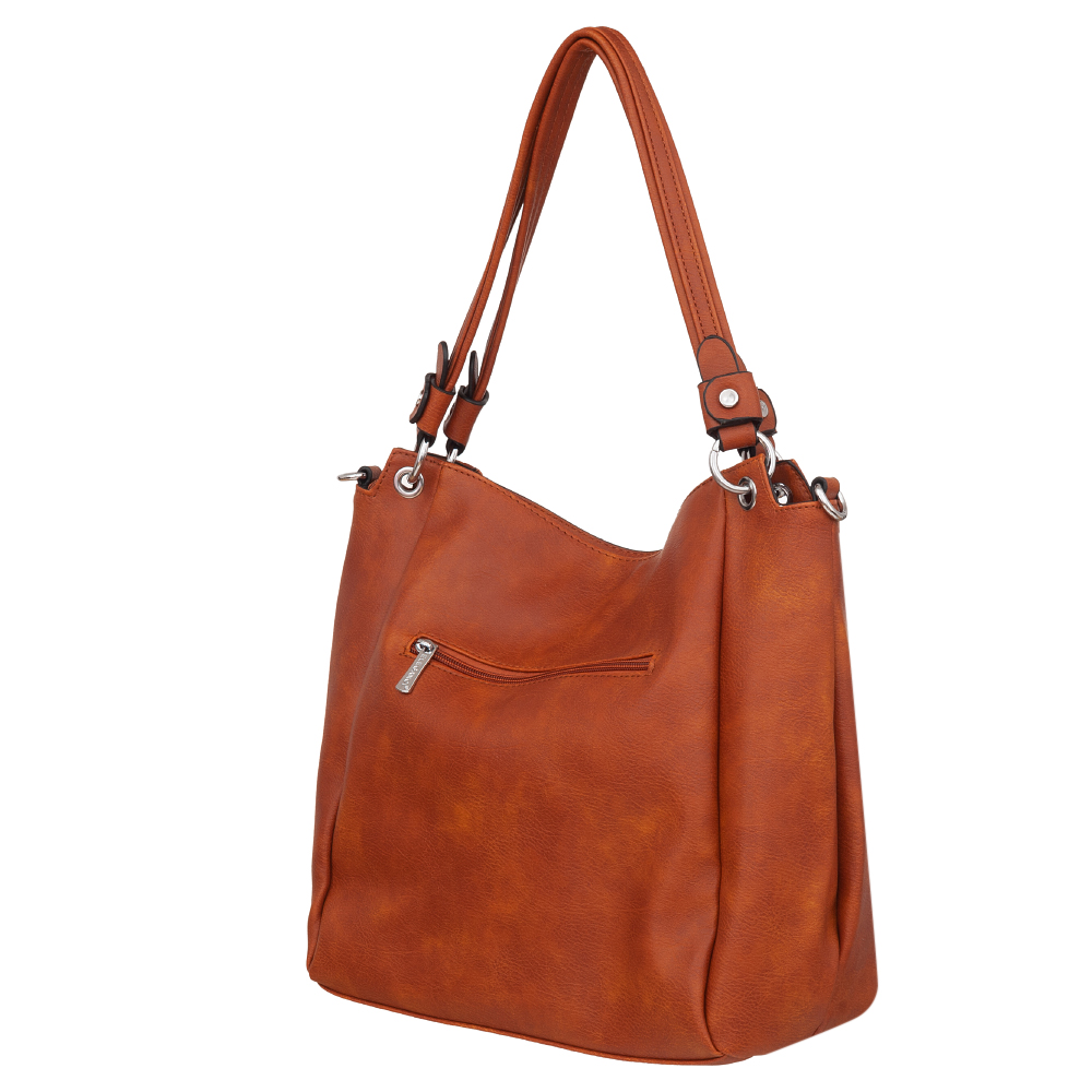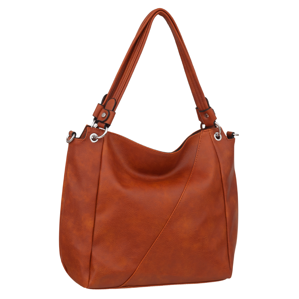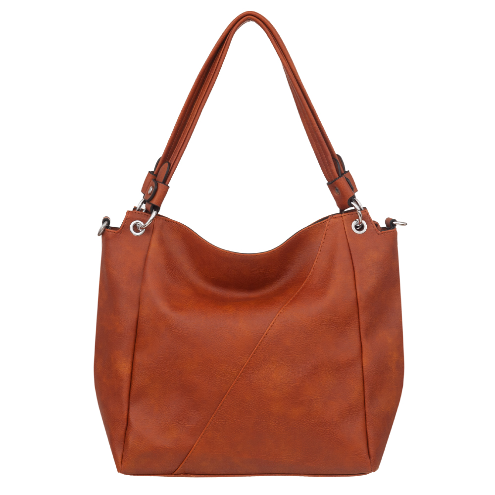 Modna torebka wykonana z wysokogatunkowej miękkiej gładkiej skóry ekologicznej najwyższej jakości. Zamykana z góry na zamek na całej szerokości. Torebka dwukomorowa, przedzielona na środku, zorganizowana + wewnątrz kieszonka na zamek, jedna na telefon + duża kieszeń na zamek w środku dzieląca torebkę na dwie części + wsuwna kieszonka na drobiazgi. Wnętrze wykończone trwałą, bawełnianą mocną podszewką. Dodatkowo z tyłu torebki kieszonka na zamek. Torebka od spodu usztywniona. Elementy wykończenia w kolorze srebrnym. W komplecie długi regulowany pasek na ramię o długości max. 130 cm.