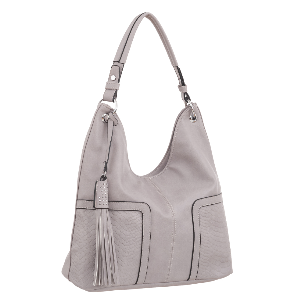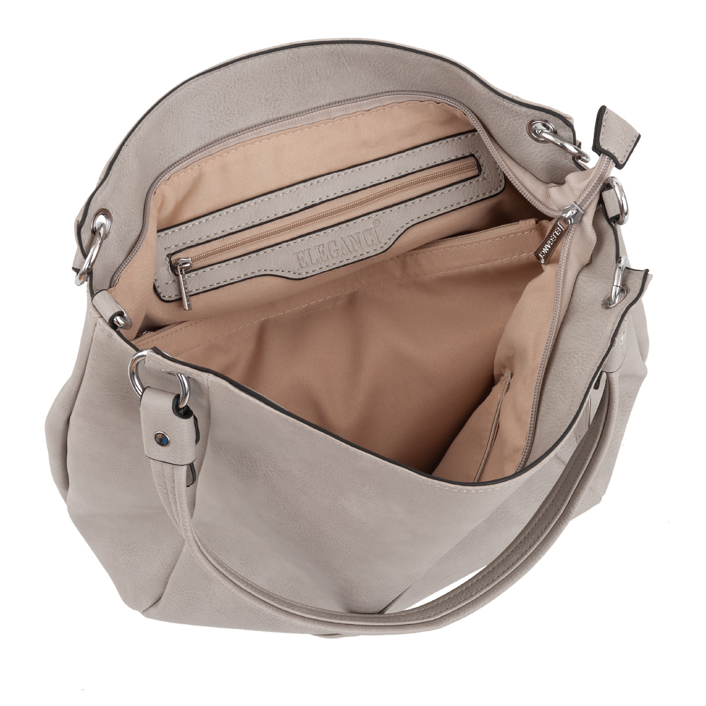 Modna torebka wykonana z wysokogatunkowej miękkiej gładkiej skóry ekologicznej najwyższej jakości. Zamykana z góry na zamek na całej szerokości. Torebka jednokomorowa przedzielona na środku dużą kieszenią na zamek, zorganizowana + wewnątrz kieszonka na zamek, jedna na telefon + duża kieszeń na zamek w środku dzieląca torebkę na dwie części + wsuwna kieszonka na drobiazgi. Wnętrze wykończone trwałą, bawełnianą mocną podszewką. Dodatkowo z tyłu torebki kieszonka na zamek. Torebka od spodu usztywniona. Elementy wykończenia w kolorze srebrnym. W komplecie długi regulowany pasek na ramię o długości max. 130 cm.