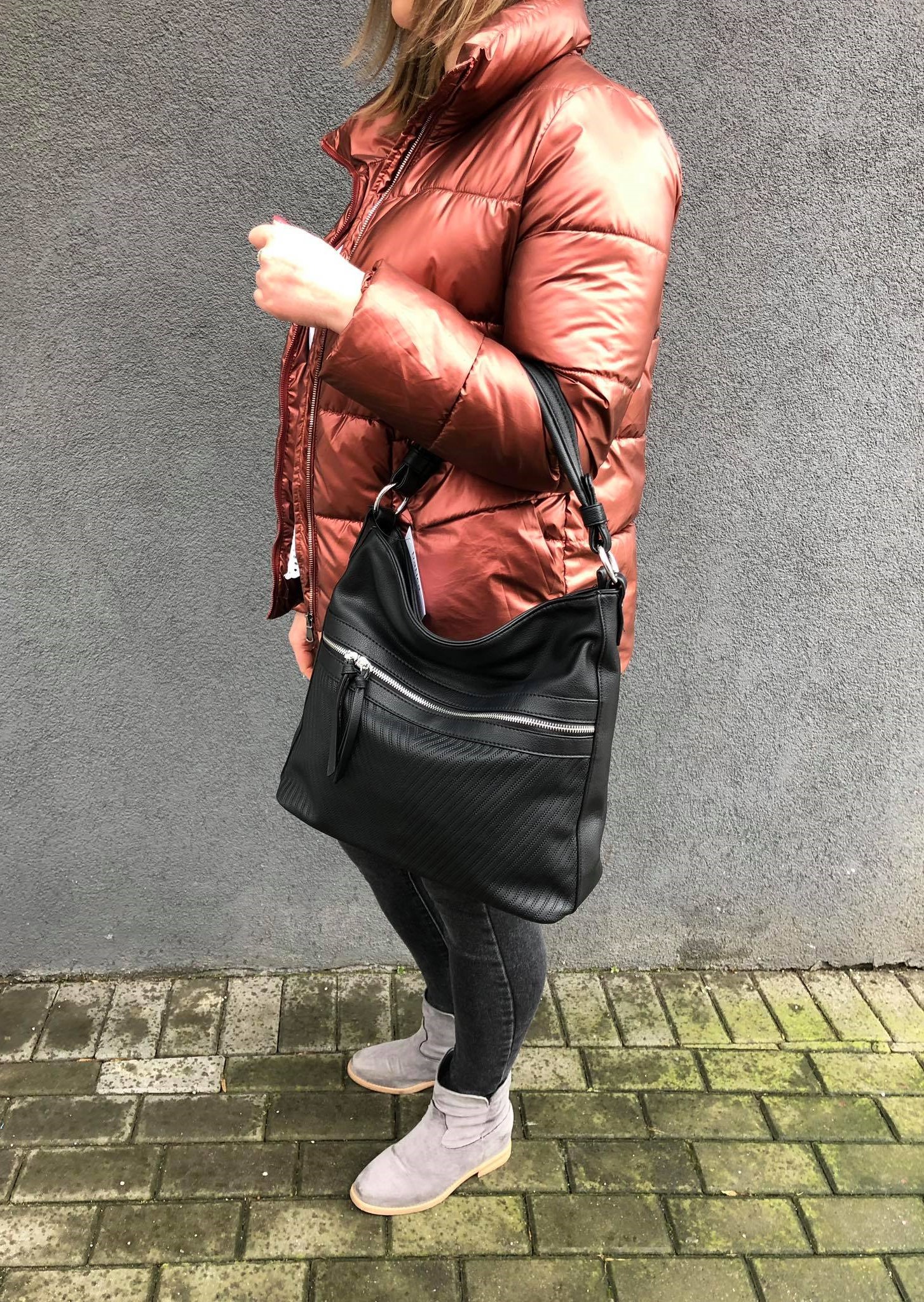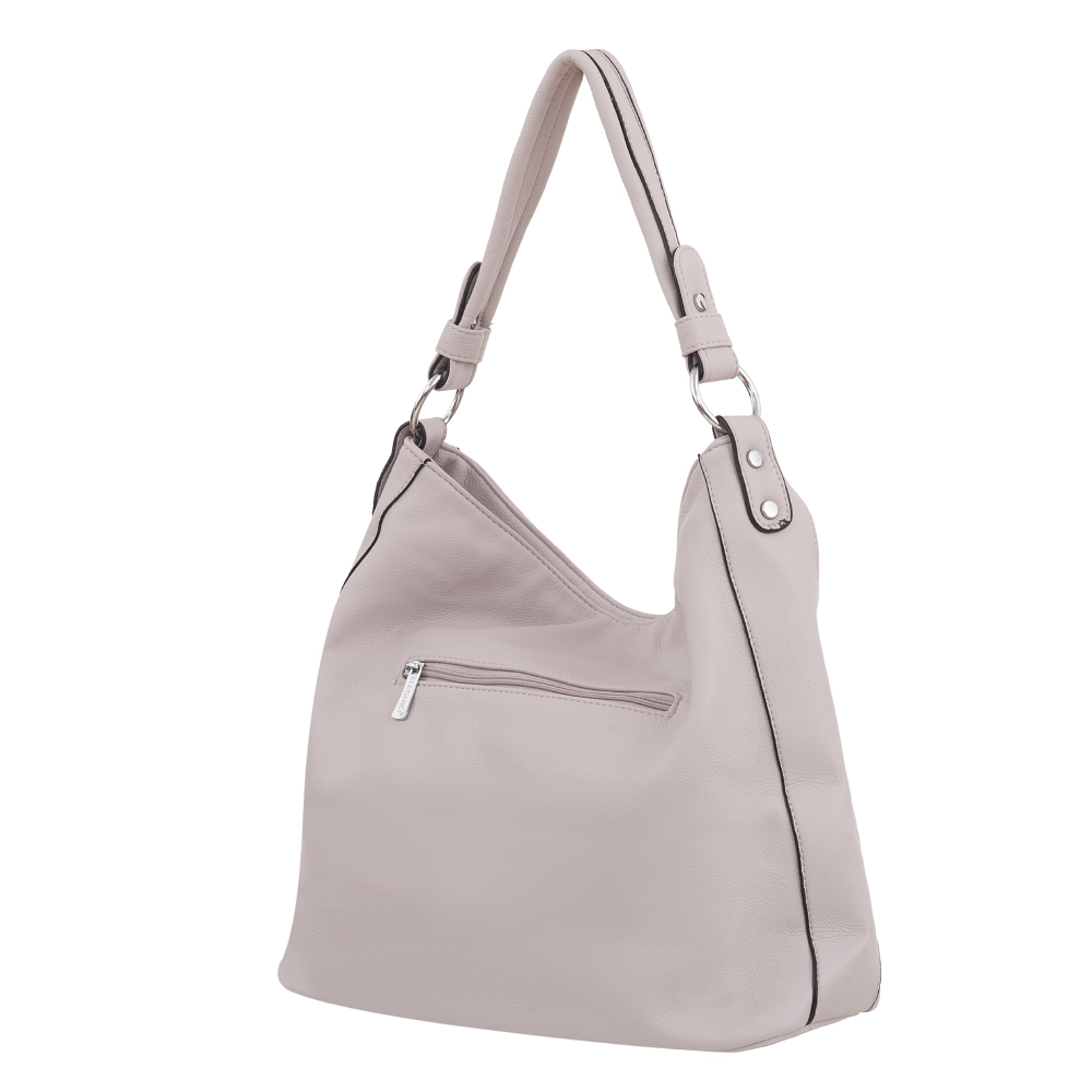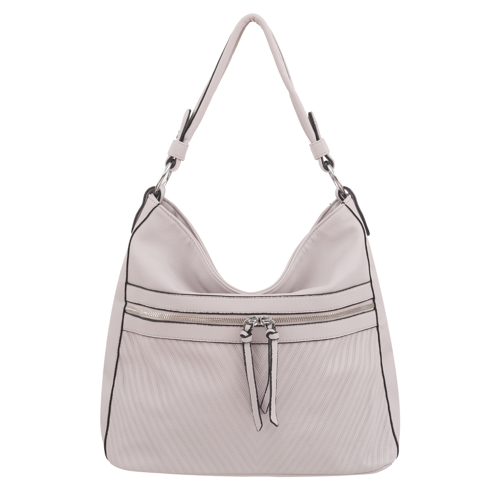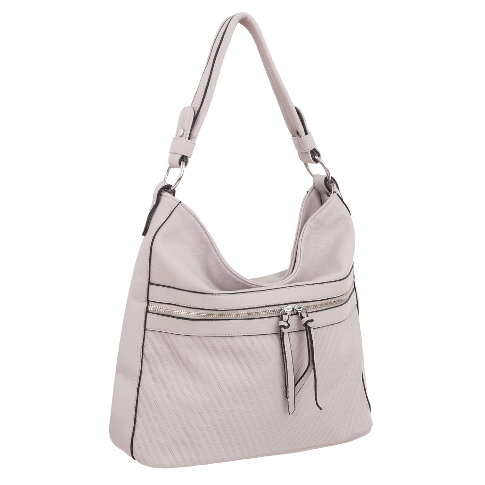 Modna torebka wykonana z wysokogatunkowej miękkiej gładkiej skóry ekologicznej najwyższej jakości. Zamykana z góry na zamek na całej szerokości. Torebka jednokomorowa, przedzielona na środku dużą kieszenią na zamek, zorganizowana + wewnątrz kieszonka na zamek, jedna na telefon + duża kieszeń na zamek + wsuwna kieszonka na drobiazgi. Wnętrze wykończone trwałą, bawełnianą mocną podszewką. Dodatkowo z przodu i z tyłu torebki kieszonka na zamek. Torebka od spodu usztywniona. Elementy wykończenia w kolorze srebrnym. W komplecie długi regulowany pasek na ramię o długości max. 130 cm.