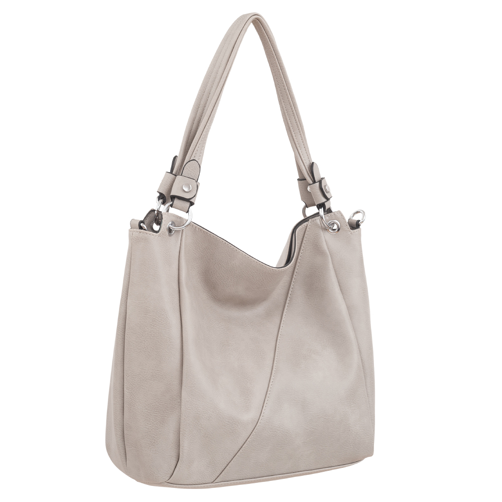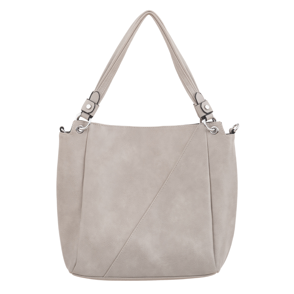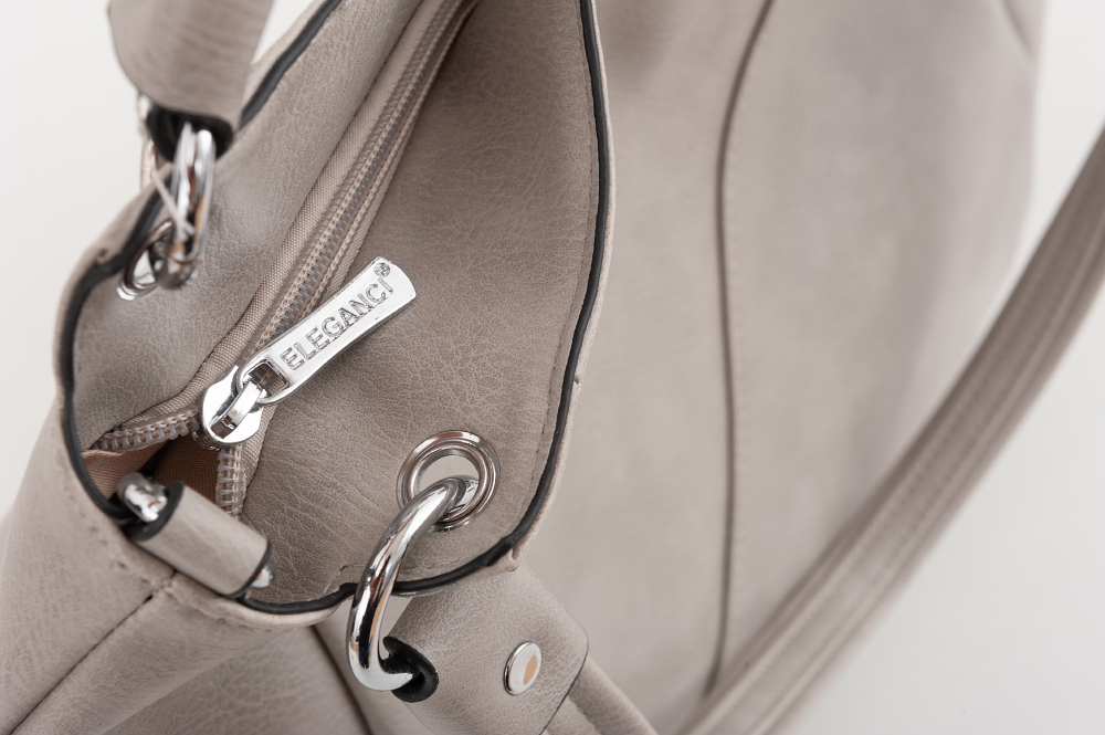 Modna torebka wykonana z wysokogatunkowej miękkiej gładkiej skóry ekologicznej najwyższej jakości. Zamykana z góry na zamek na całej szerokości. Torebka dwukomorowa, przedzielona na środku, zorganizowana + wewnątrz kieszonka na zamek, jedna na telefon + duża kieszeń na zamek w środku dzieląca torebkę na dwie części + wsuwna kieszonka na drobiazgi. Wnętrze wykończone trwałą, bawełnianą mocną podszewką. Dodatkowo z tyłu torebki kieszonka na zamek. Torebka od spodu usztywniona. Elementy wykończenia w kolorze srebrnym. W komplecie długi regulowany pasek na ramię o długości max. 130 cm.