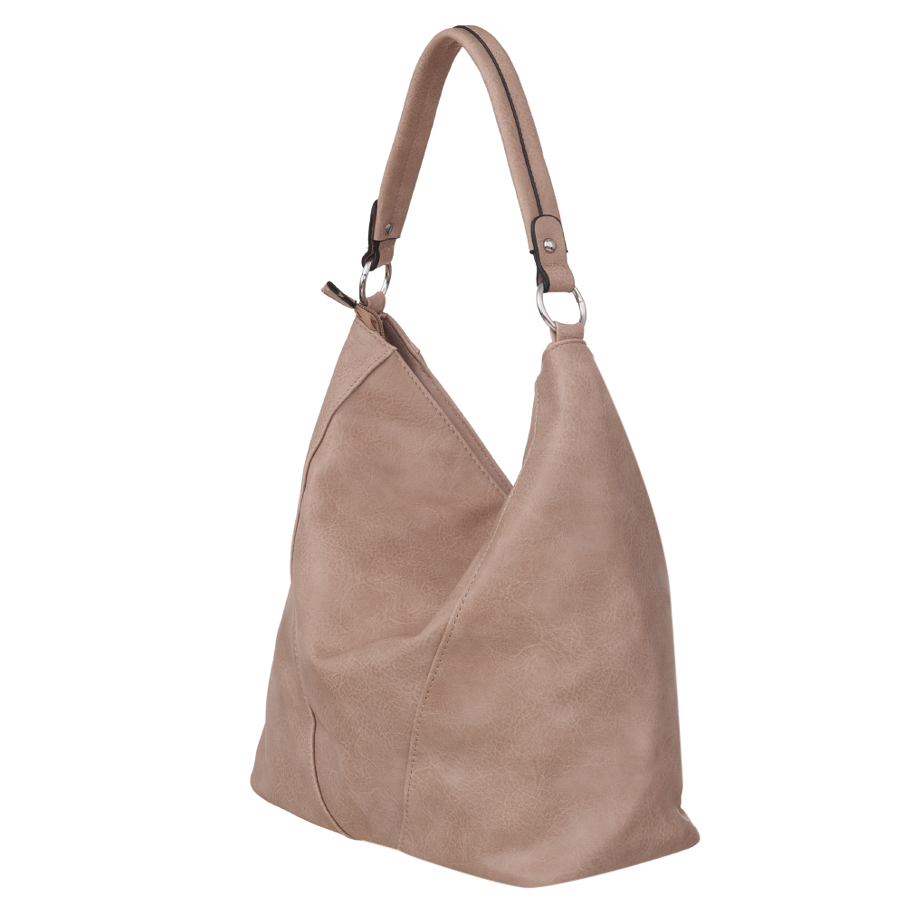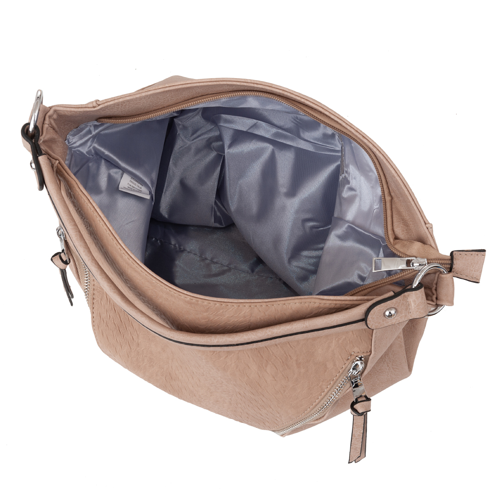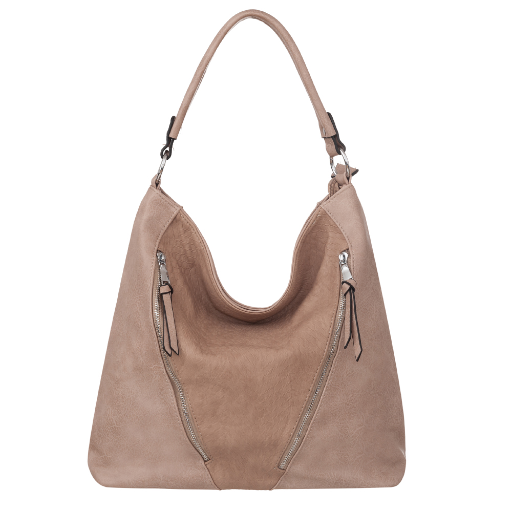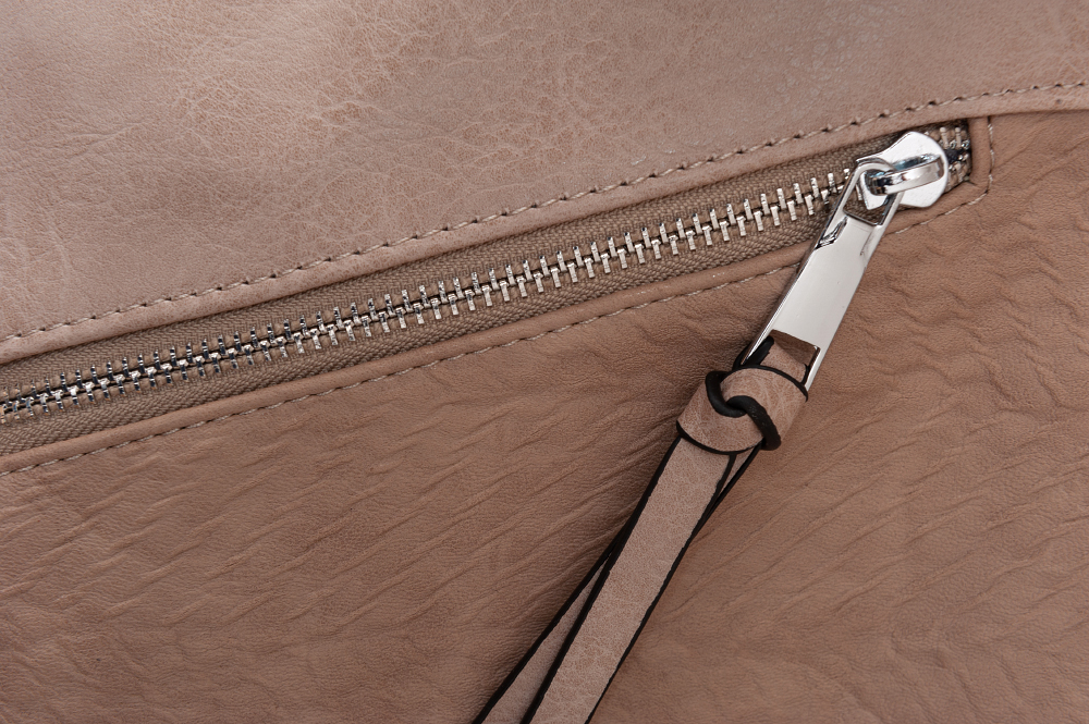 Modna, klasyczna torebka wykonana z wysokogatunkowej skóry ekologicznej wysokiej jakości. Z przodu dwie różne faktury materiału tworzą oryginalną całość. Zamykana z góry na zamek na całej szerokości. Torebka jednokomorowa, zorganizowana w środku + wewnątrz kieszonka na zamek, jedna na telefon + dodatkowa kieszeń na drobiazgi. Wnętrze wykończone trwałą podszewką. Dodatkowo z tyłu torebki kieszonka na zamek + 2 x ukośna kieszeń z przodu.. Torebka od spodu usztywniona. Elementy wykończenia w kolorze srebrnym. W komplecie długi regulowany pasek na ramię o długości max. 129 cm.