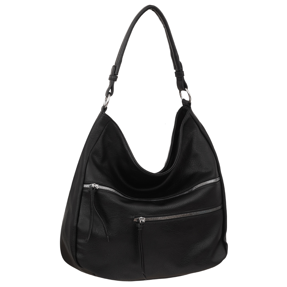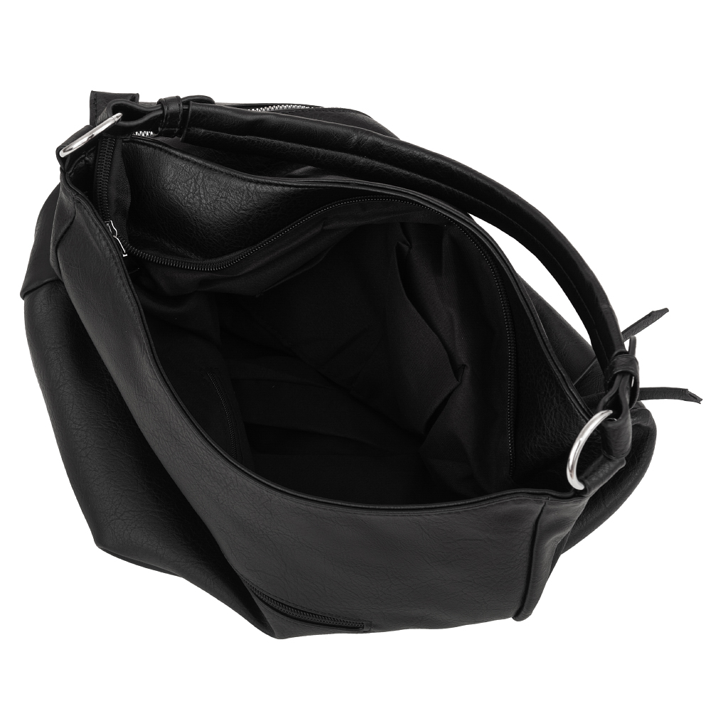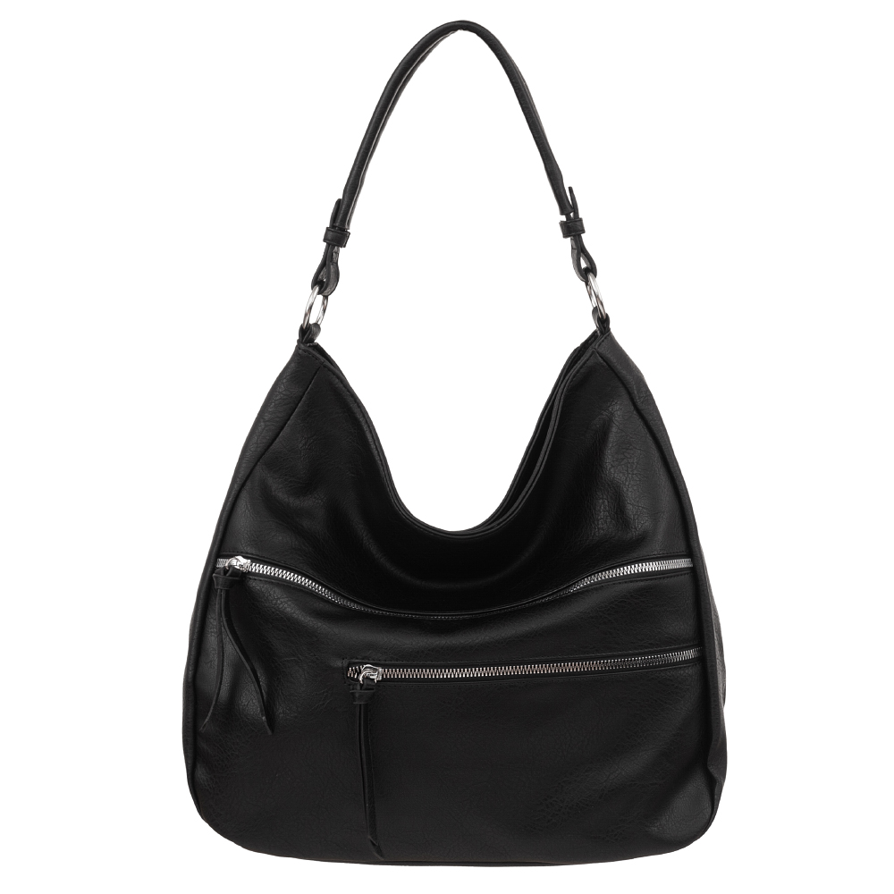 MUST HAVE - Modna, klasyczna torebka wykonana z wysokogatunkowej skóry ekologicznej wysokiej jakości. Z przodu dwie kieszonki. Zamykana z góry na zamek na całej szerokości torebki. Torba jednokomorowa, zorganizowana w środku + wewnątrz kieszonka na zamek, jedna na telefon + dodatkowa kieszeń na drobiazgi. Wnętrze wykończone trwałą materiałową podszewką. Dodatkowo z tyłu torebki kieszonka na zamek. Torebka od spodu delikatnie usztywniona. Elementy wykończenia w kolorze srebrnym. W komplecie długi regulowany pasek na ramię o długości max. 129 cm.