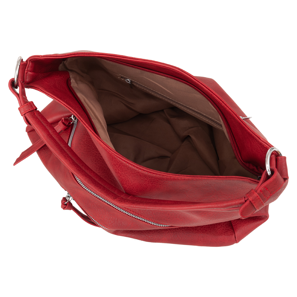 MUST HAVE - Modna, klasyczna torebka wykonana z wysokogatunkowej skóry ekologicznej wysokiej jakości. Z przodu dwie kieszonki. Zamykana z góry na zamek na całej szerokości torebki. Torba jednokomorowa, zorganizowana w środku + wewnątrz kieszonka na zamek, jedna na telefon + dodatkowa kieszeń na drobiazgi. Wnętrze wykończone trwałą materiałową podszewką. Dodatkowo z tyłu torebki kieszonka na zamek. Torebka od spodu delikatnie usztywniona. Elementy wykończenia w kolorze srebrnym. W komplecie długi regulowany pasek na ramię o długości max. 129 cm.