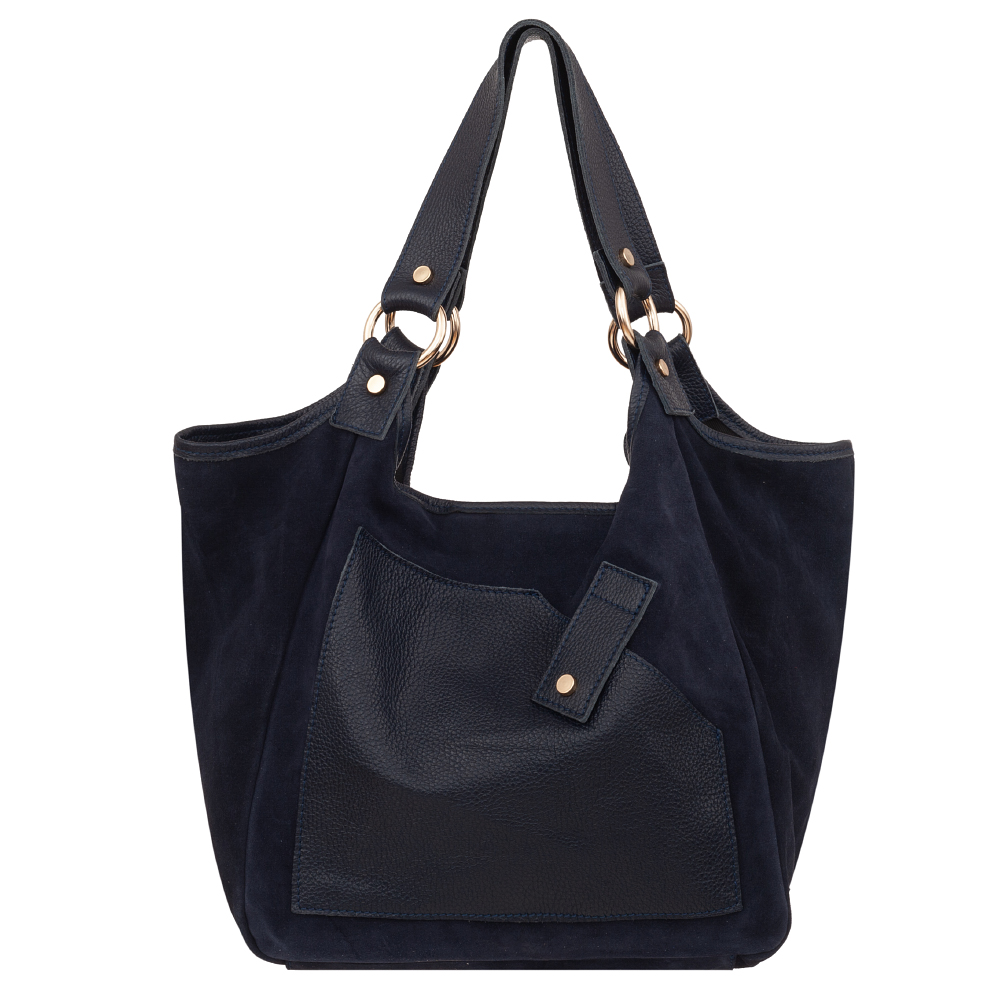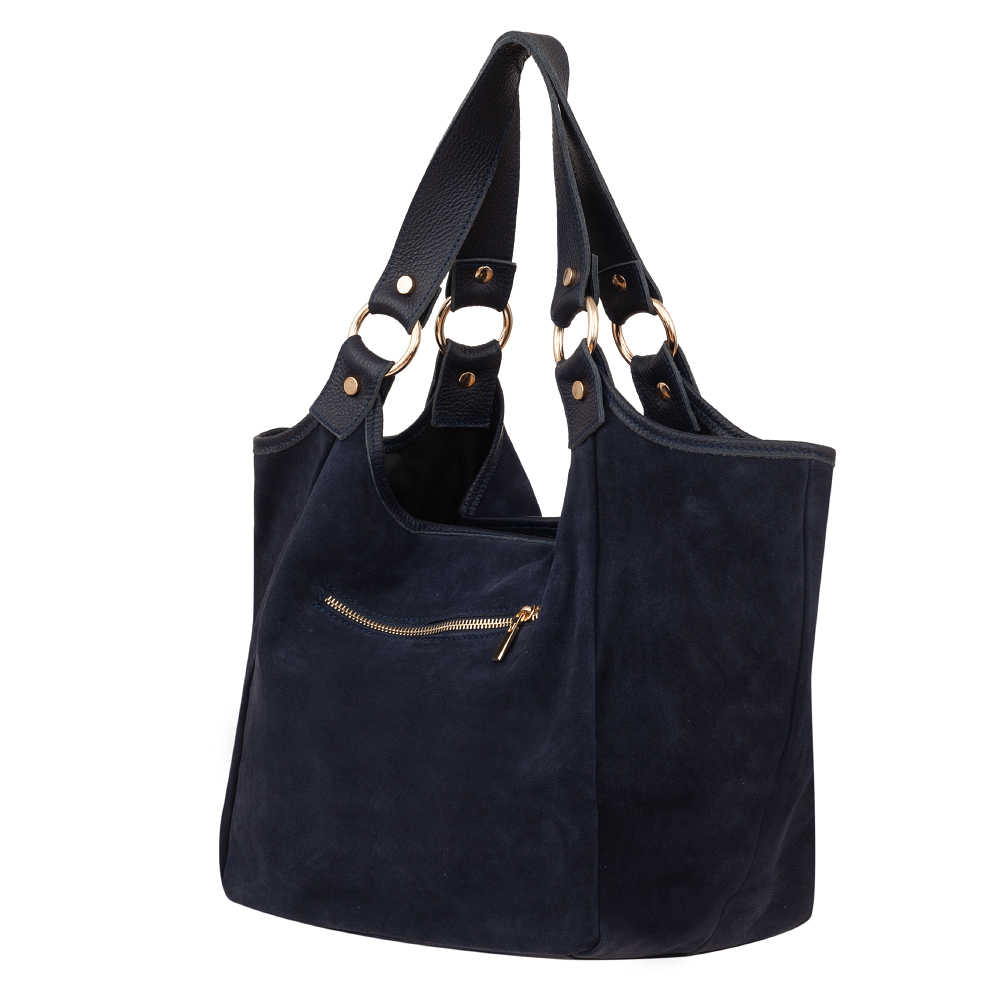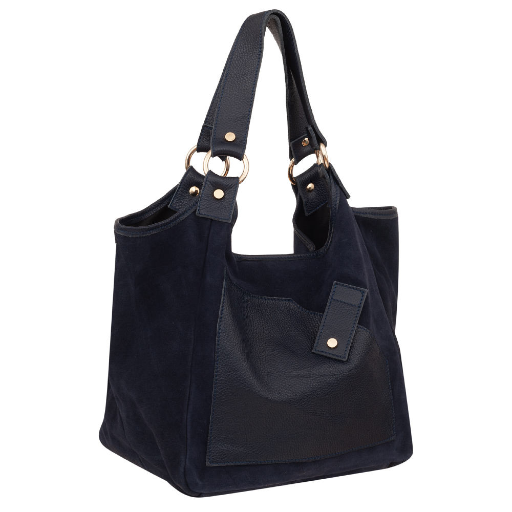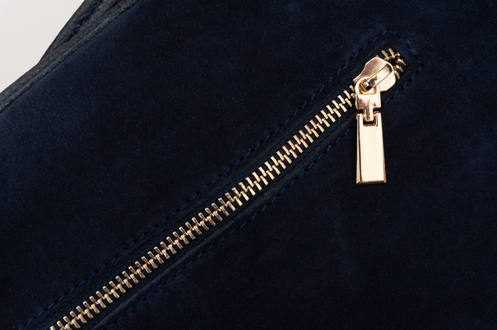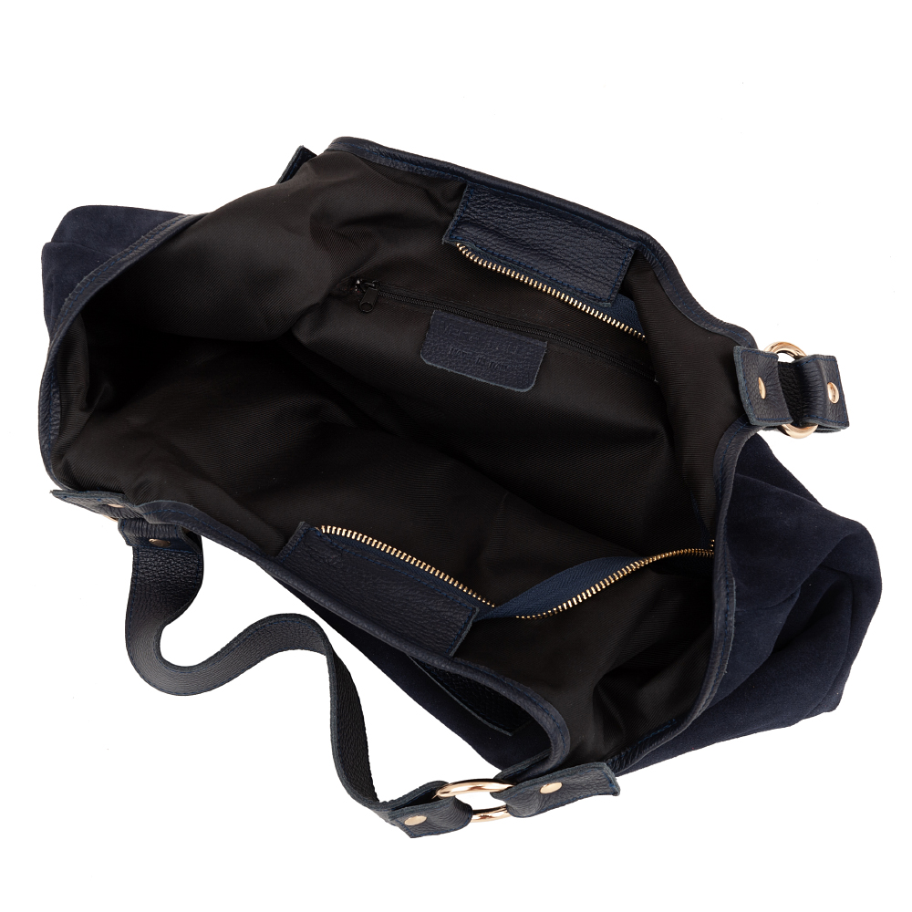 VERA PELLE włoska modna i pojemna skórzana A4 torebka wykonana z wysokogatunkowej naturalnej skóry zamszowej łącznej ze skórą licową. Wygodny dostęp do środka. Torebka jednokomorowa, od góry zamykana na krótki zamek. Wewnątrz kieszonka na zamek + duża kieszeń z przodu na magnes + kieszonka na zamek z tyłu torebki. Torebka od środka wykończona porządną materiałową podszewką w kolorze dopasowanym do skóry. Elementy wykończenia w kolorze złotym. Wygodne szerokie uszy zapewnią wygodę noszenia. W komplecie dodatkowo długi regulowany pasek.