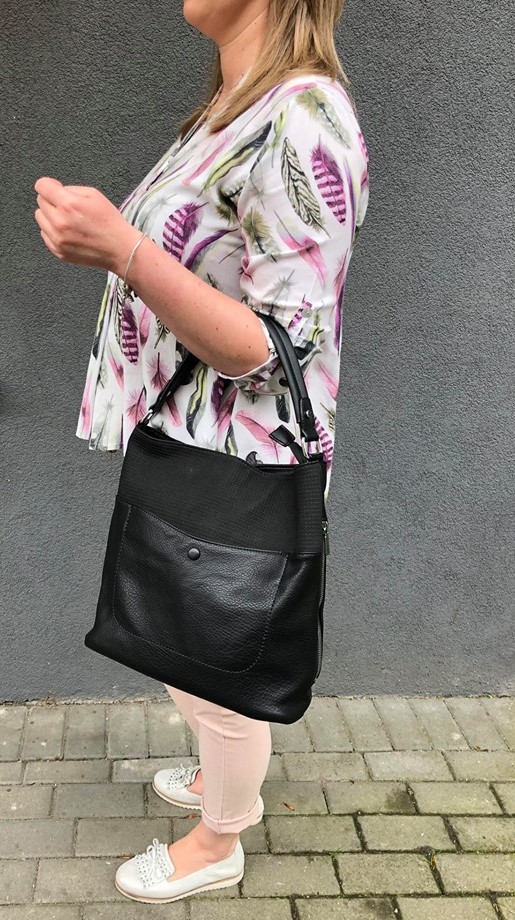 Modna, klasyczna A4 torebka wykonana z wysokogatunkowej miękkiej gładkiej skóry ekologicznej wysokiej jakości. 2 różne faktury skóry z przodu dodają torebce oryginalności.