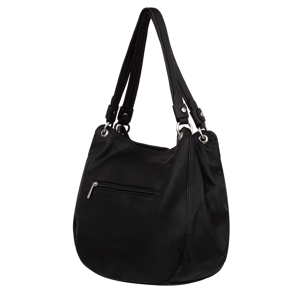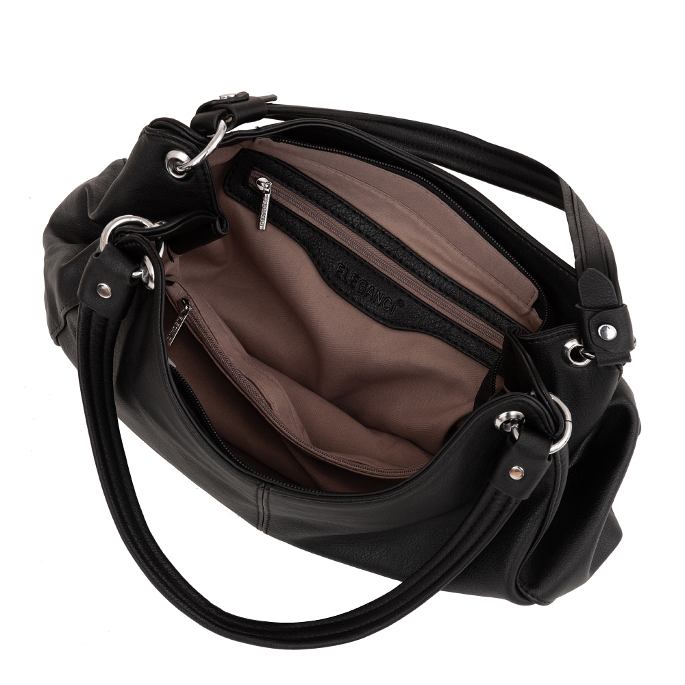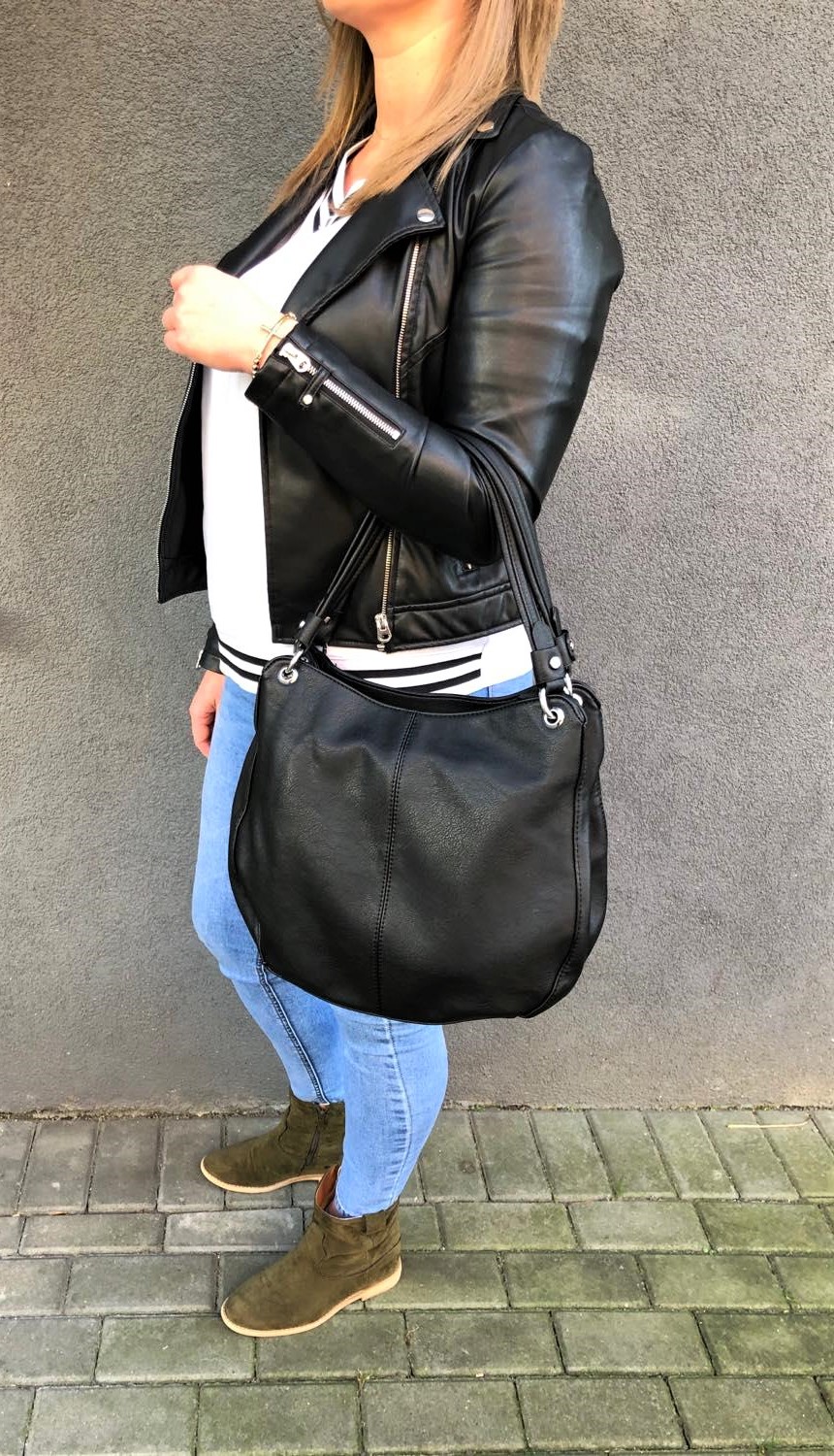 Modna torebka wykonana z wysokogatunkowej miękkiej gładkiej skóry ekologicznej najwyższej jakości. Zamykana z góry na zamek na całej szerokości. Torebka dwukomorowa, przedzielona na środku, zorganizowana + wewnątrz kieszonka na zamek, jedna na telefon + duża kieszeń na zamek w środku dzieląca torebkę na dwie części + wsuwna kieszonka na drobiazgi. Wnętrze wykończone trwałą, bawełnianą mocną podszewką. Dodatkowo z tyłu torebki kieszonka na zamek. Torebka od spodu usztywniona. Elementy wykończenia w kolorze srebrnym. W komplecie długi regulowany pasek na ramię o długości max. 130 cm.