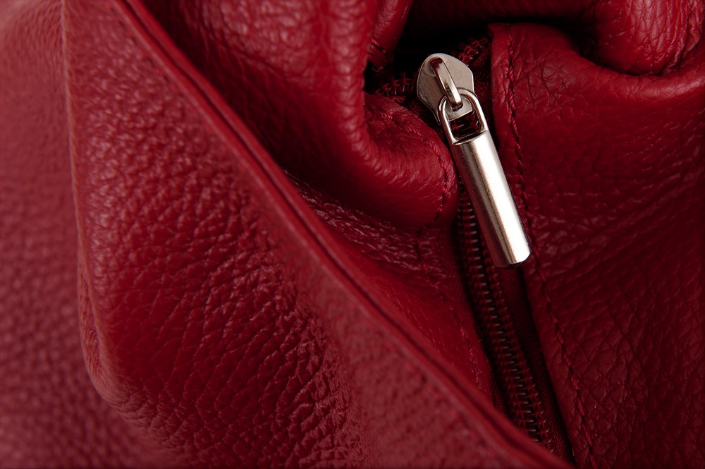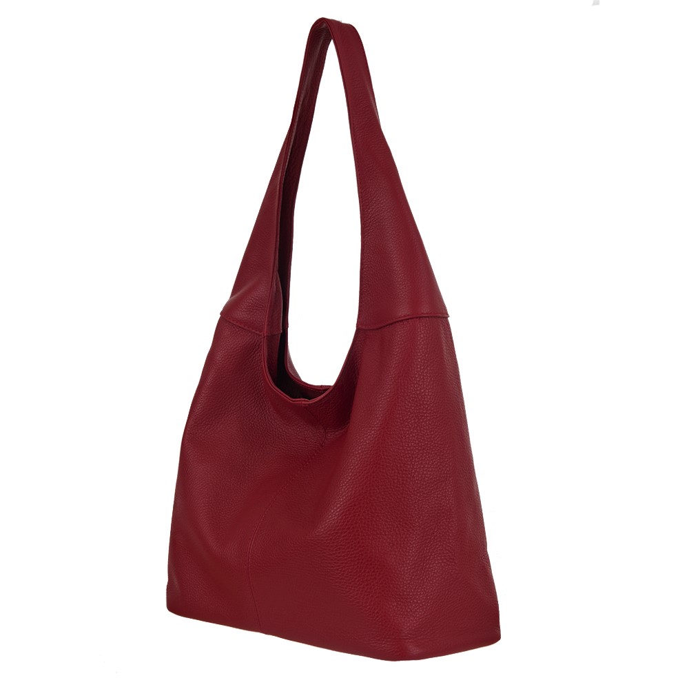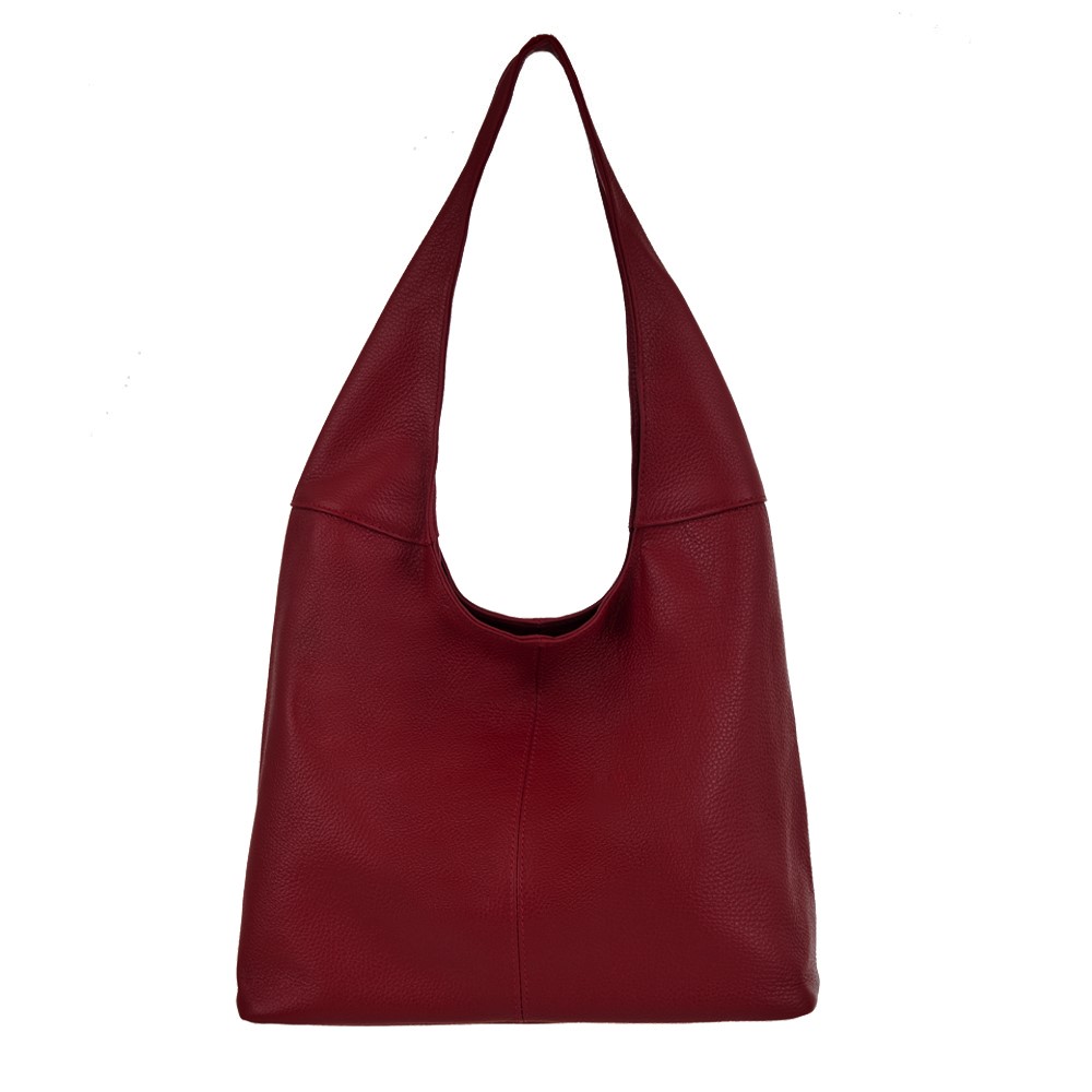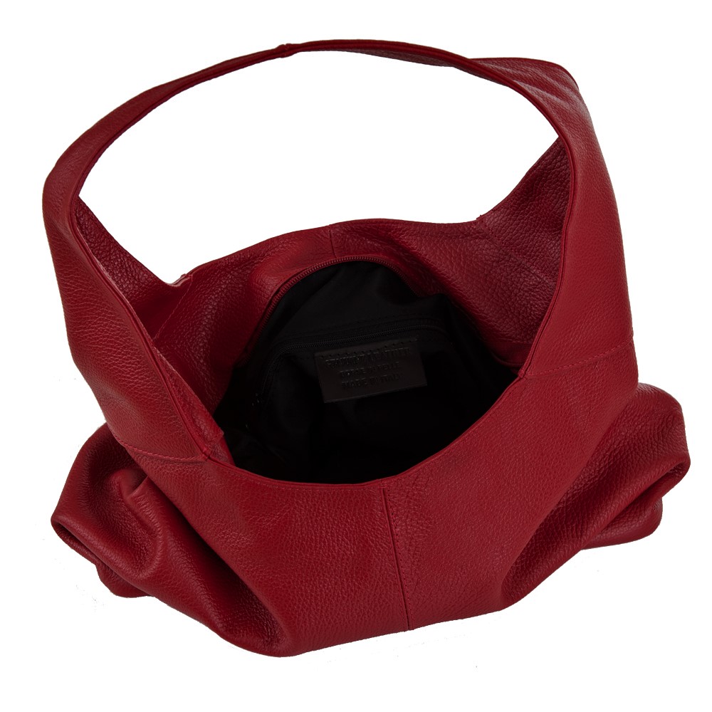 Włoska skórzana torebka / worek wykonana z wysokogatunkowej naturalnej miękkiej skóry. Zamykana z góry na suwak. Torebka dwukomorowa przedzielona na środku dużą kieszenią na suwak + wewnątrz jedna kieszonka na zamek oraz jedna na telefon. Wnętrze wykończone trwałą, czarną podszewką. Torebkę można nosić wygodnie na ramieniu dzięki szerokiemu paskowi.