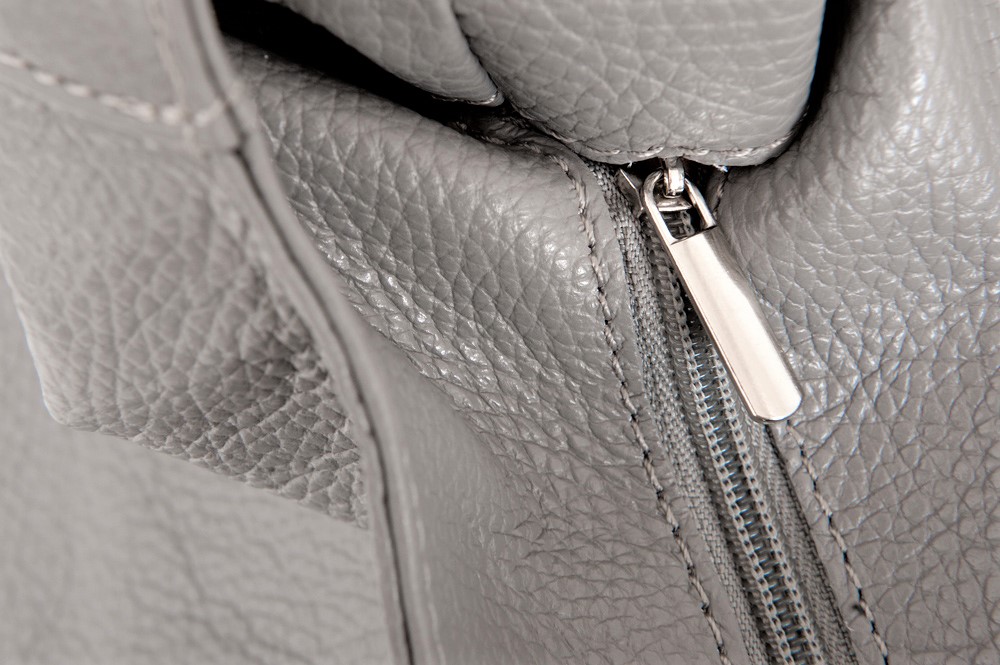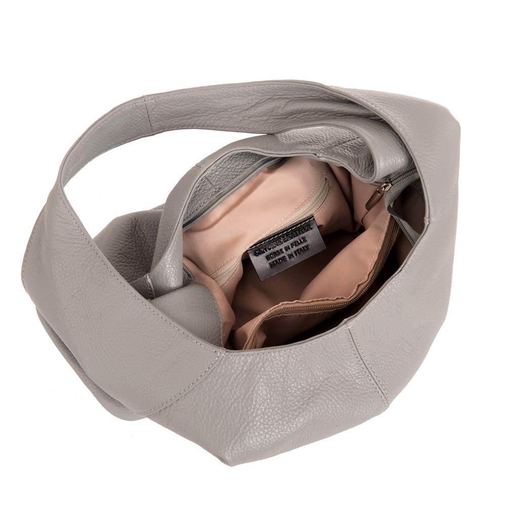 Włoska skórzana torebka / worek wykonana z wysokogatunkowej naturalnej miękkiej skóry. Zamykana z góry na suwak. Torebka dwukomorowa przedzielona na środku dużą kieszenią na suwak + wewnątrz jedna kieszonka na zamek oraz jedna na telefon. Wnętrze wykończone trwałą, jasną podszewką. Torebkę można nosić wygodnie na ramieniu dzięki szerokiemu paskowi.