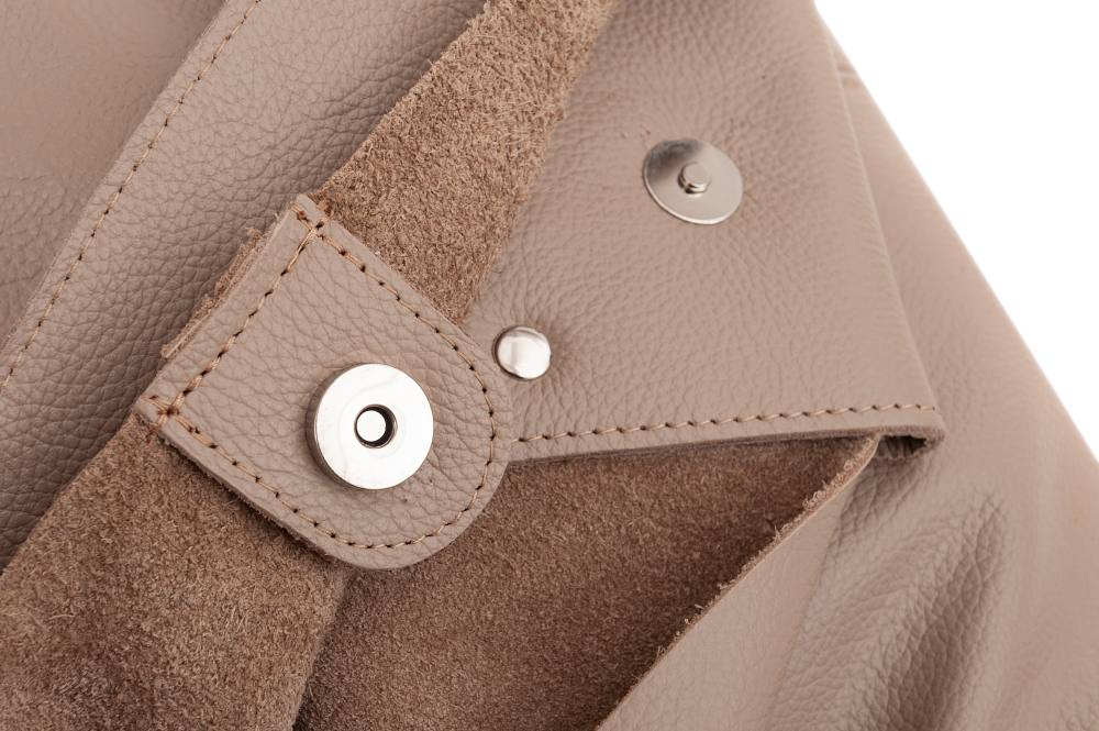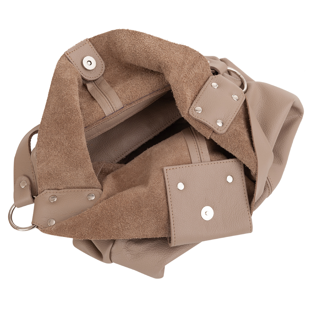 Modna pojemna torebka worek wykonana z najwyższej jakości miękkiej skóry naturalnej. Worek jest praktyczny, pojemny, bez problemu mieści format A4 oraz inne niezbędne rzeczy. Idealnie pasuje do stylizacji w miejskim stylu. Torebkę można nosić na kilka różnych sposobów, gdyż posiada dwa paski o różnej długości. Dłuższy jest odpinany. Torebka jednokomorowa, w środku duża kieszeń na zamek. Torba wykończona na surowo skórą naturalną. Dłuższy pasek skórzany z możliwością regulacji długości do max 130 cm