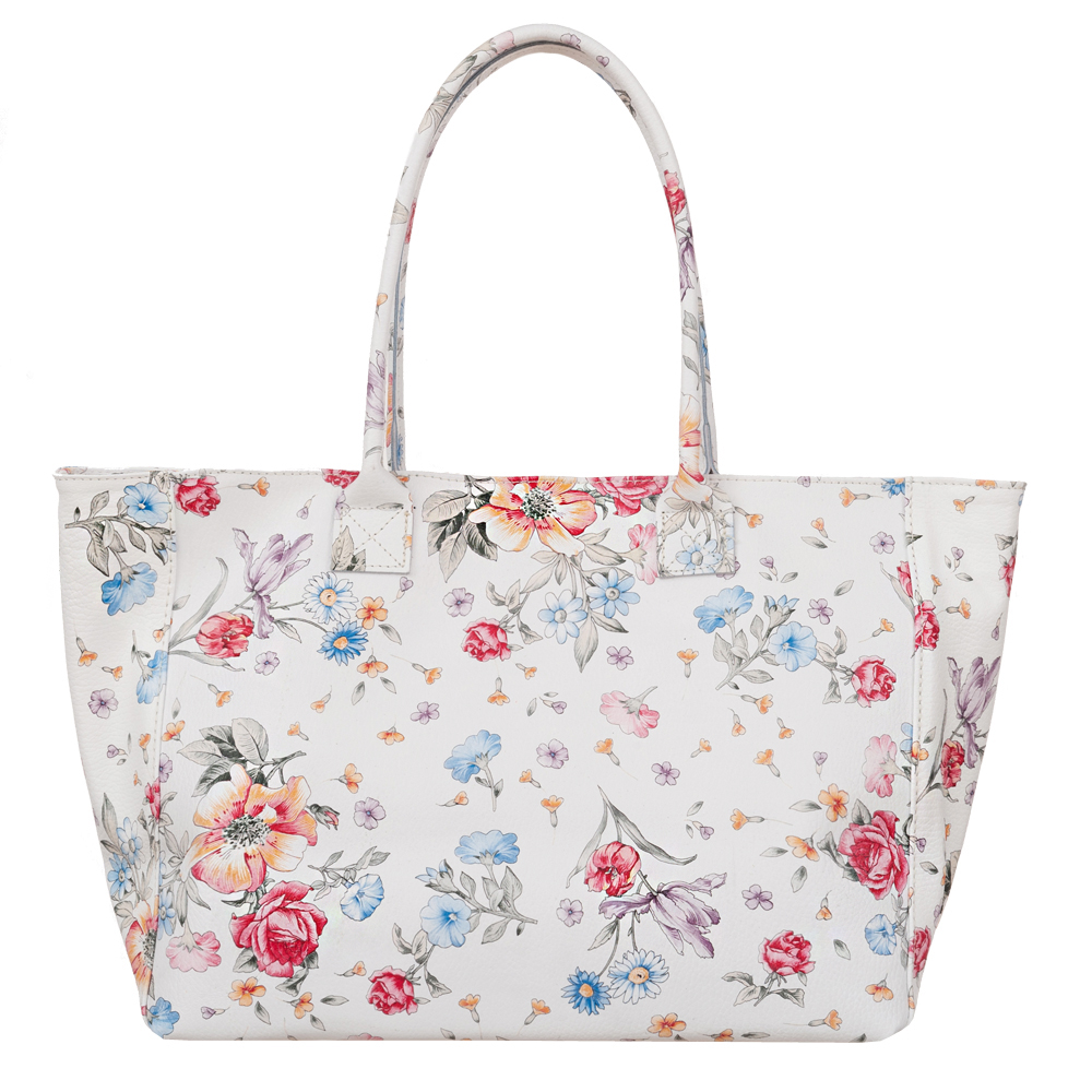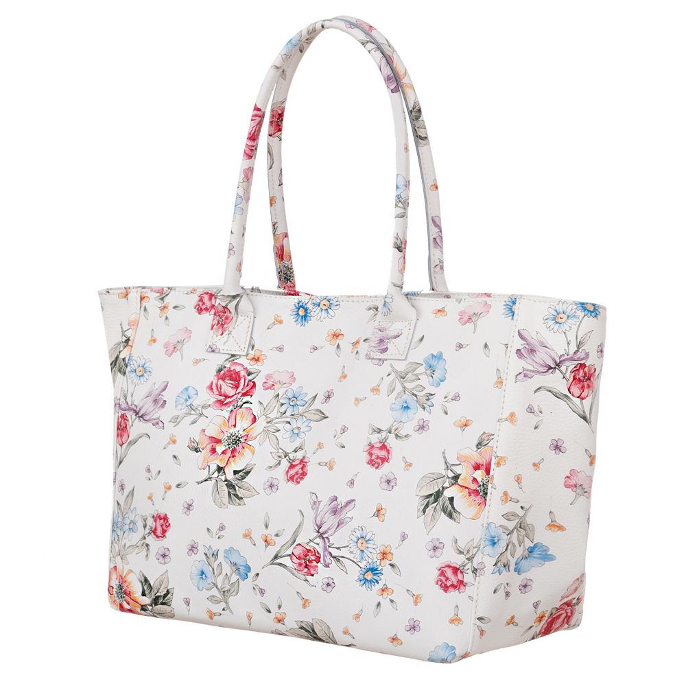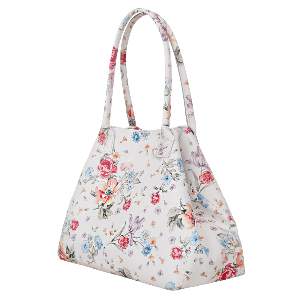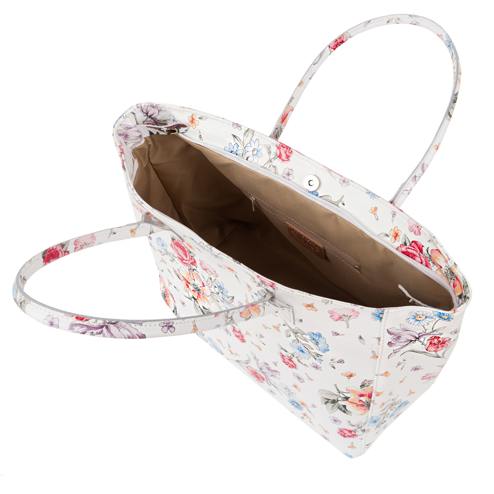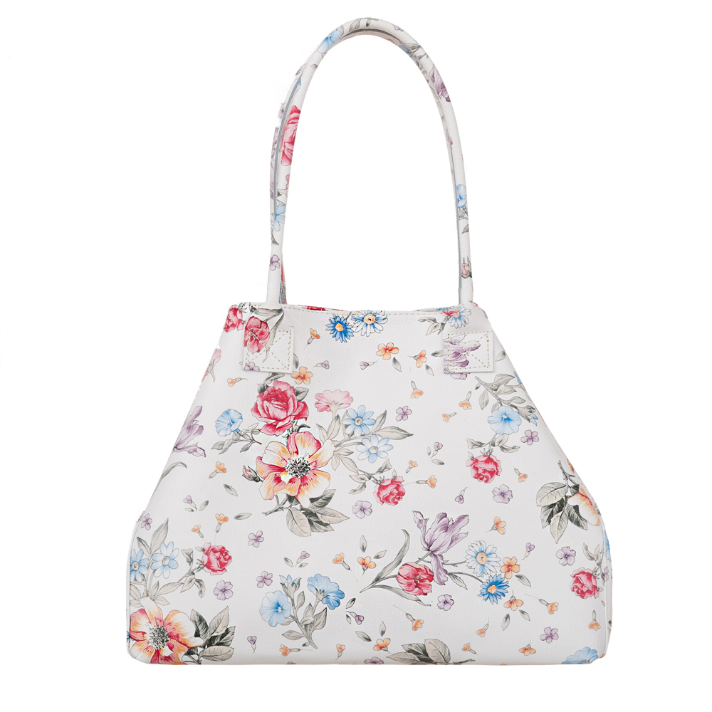 Hit! Włoska modna i poręczna torebka. Wykonana perfekcyjnie ze skóry naturalnej licowej, biała torebka z motywem kolorowych kwiatów. Torebka jednokomorowa, wykończona materiałową mocną podszewką, zamykana na całej szerokości na zamek. Możliwość noszenia torebki w dwóch formach - rozłożona jak i złożona w trapez po spięciu klipsem w środku torebki. Torebkę swobodnie można nosić na ramieniu. W środku kieszonka na zamek + miejsce na telefon. Torebka usztywniona od spodu. Metalowe elementy w kolorze srebrnym dodają torebce elegacji. Idealna torebka w miejskim stylu na co dzień.