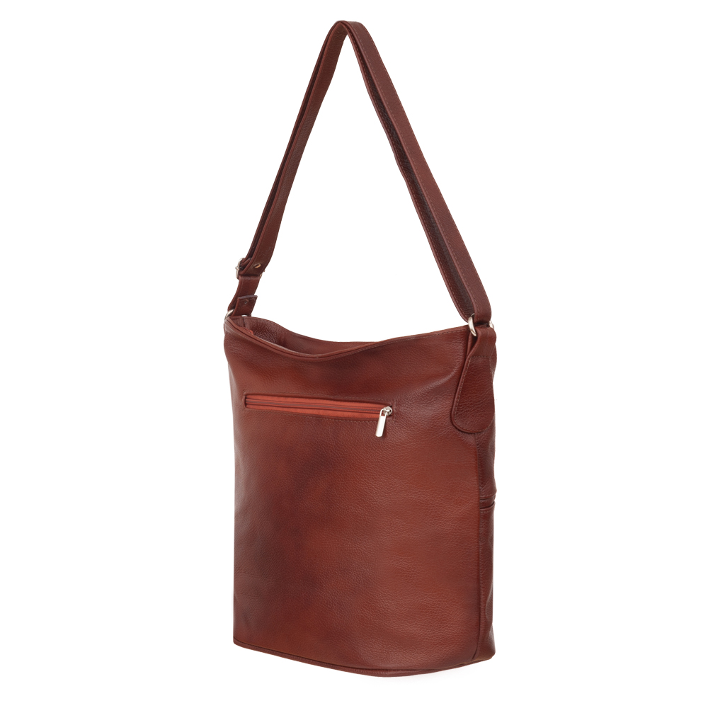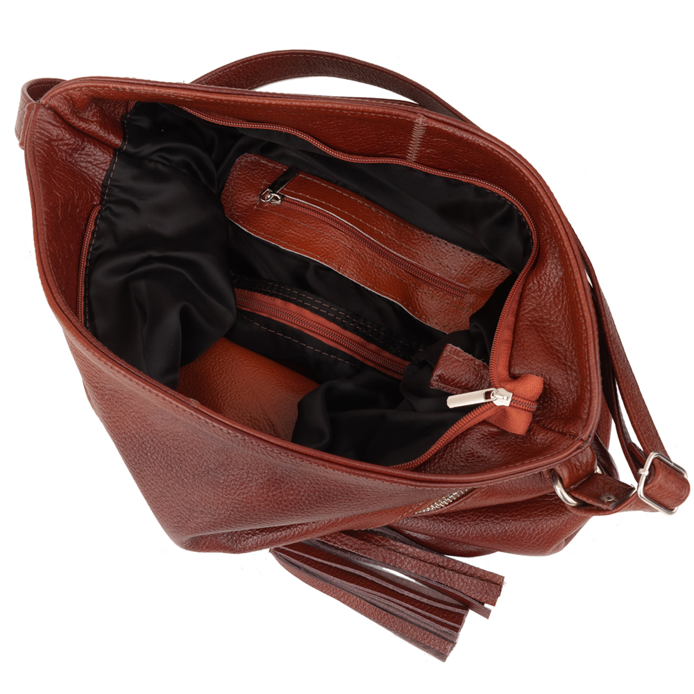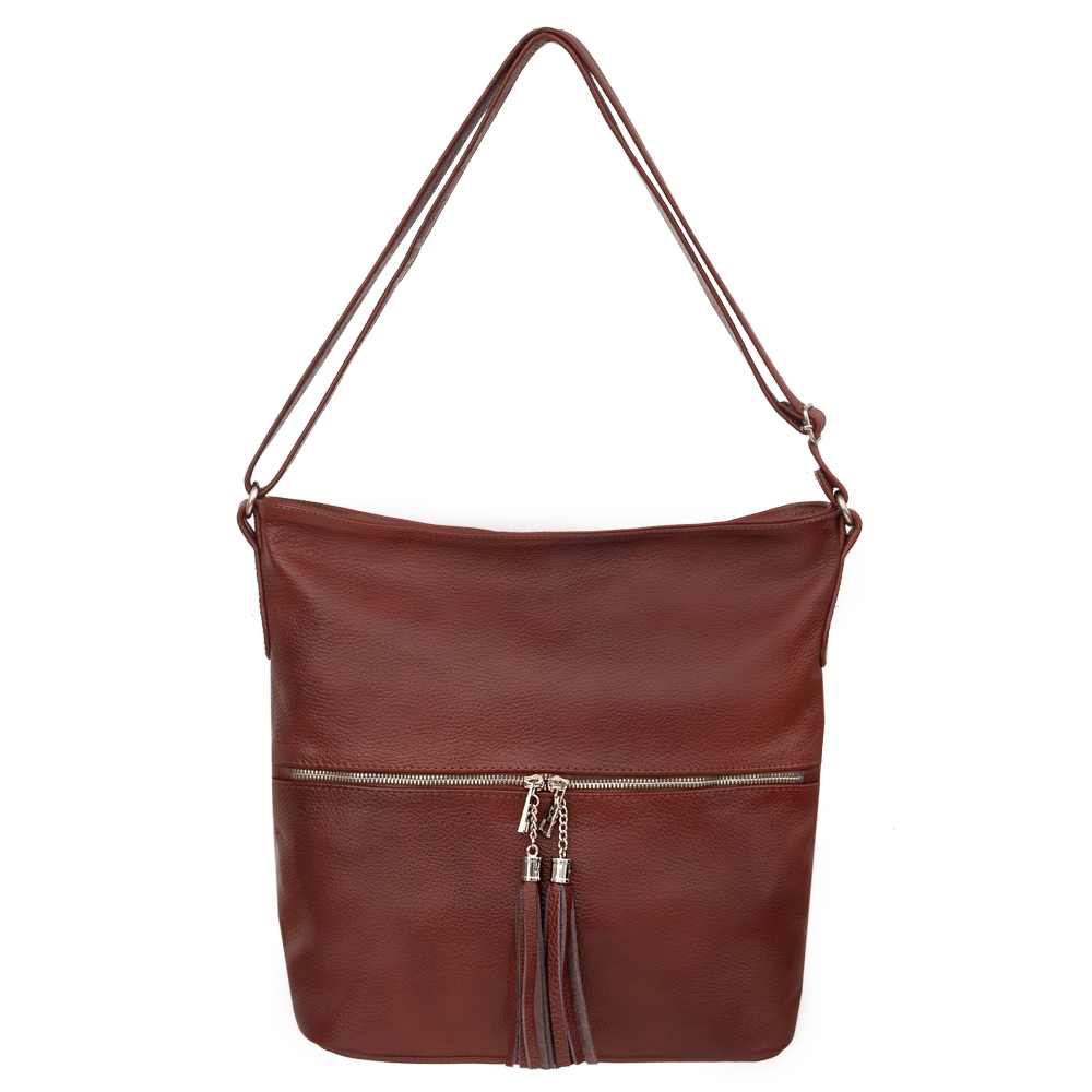 Skórzana A4 torebka wykonana w całości z miękkiej skóry naturalnej. Zamykana z góry na zamek na całej szerokości. Z przodu modne frędzle. Torebka jednokomorowa + wewnątrz dwie kieszonki na zamek, jedna na telefon + dodatkowa kieszeń na drobiazgi, klucze. Dodatkowo z tyłu kieszonka na suwak + kieszeń z przodu. Wnętrze wykończone trwałą, materiałową podszewką. Pasek z możliwością regulacji długości do 130 cm. Metalowe elementy w kolorze srebrnym. Dno torebki usztywnione.