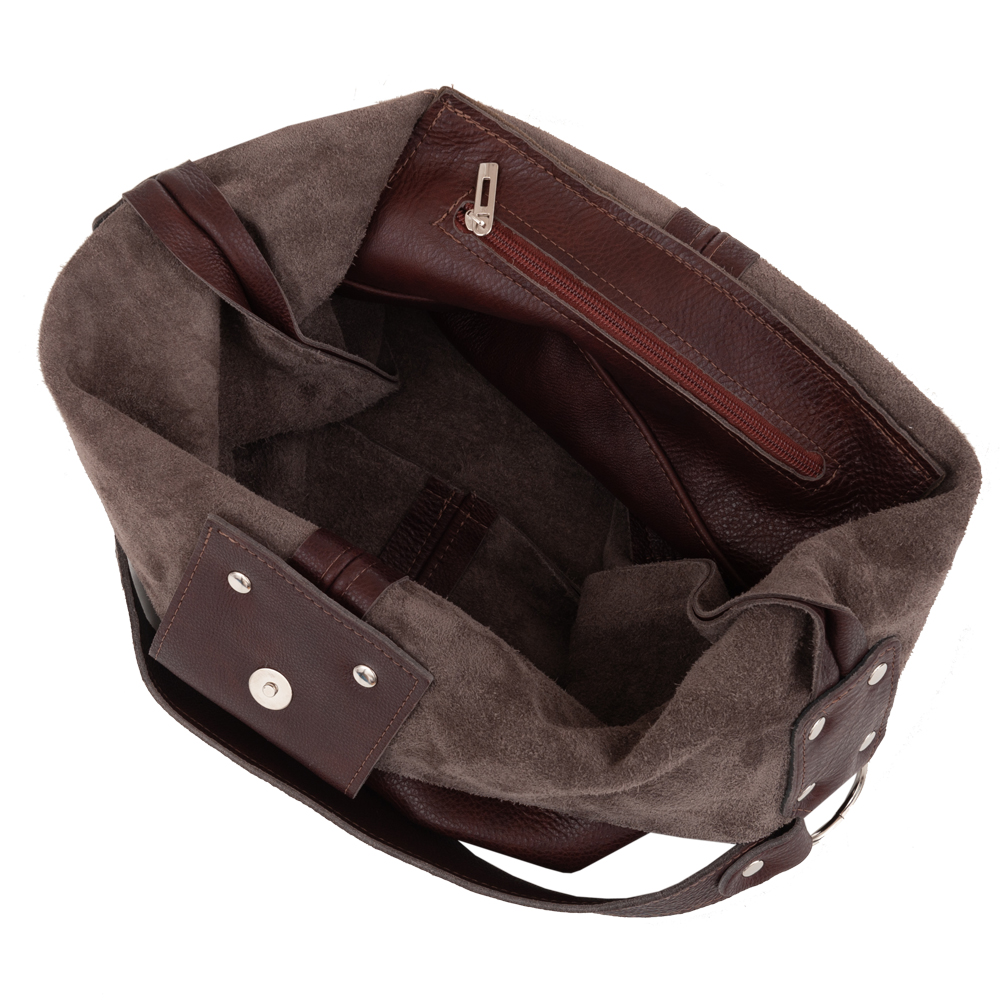 Modna pojemna torebka XL worek wykonana z najwyższej jakości miękkiej skóry naturalnej. Worek jest praktyczny, pojemny, bez problemu mieści format A4 oraz inne niezbędne rzeczy. Idealnie pasuje do stylizacji w miejskim stylu. Torebkę można nosić na kilka różnych sposobów, gdyż posiada dwa paski o różnej długości. Dłuższy jest odpinany. Torebka jednokomorowa, w środku duża kieszeń na zamek. Torba wykończona na surowo skórą naturalną. Dłuższy pasek skórzany z możliwością regulacji długości do max 112 cm