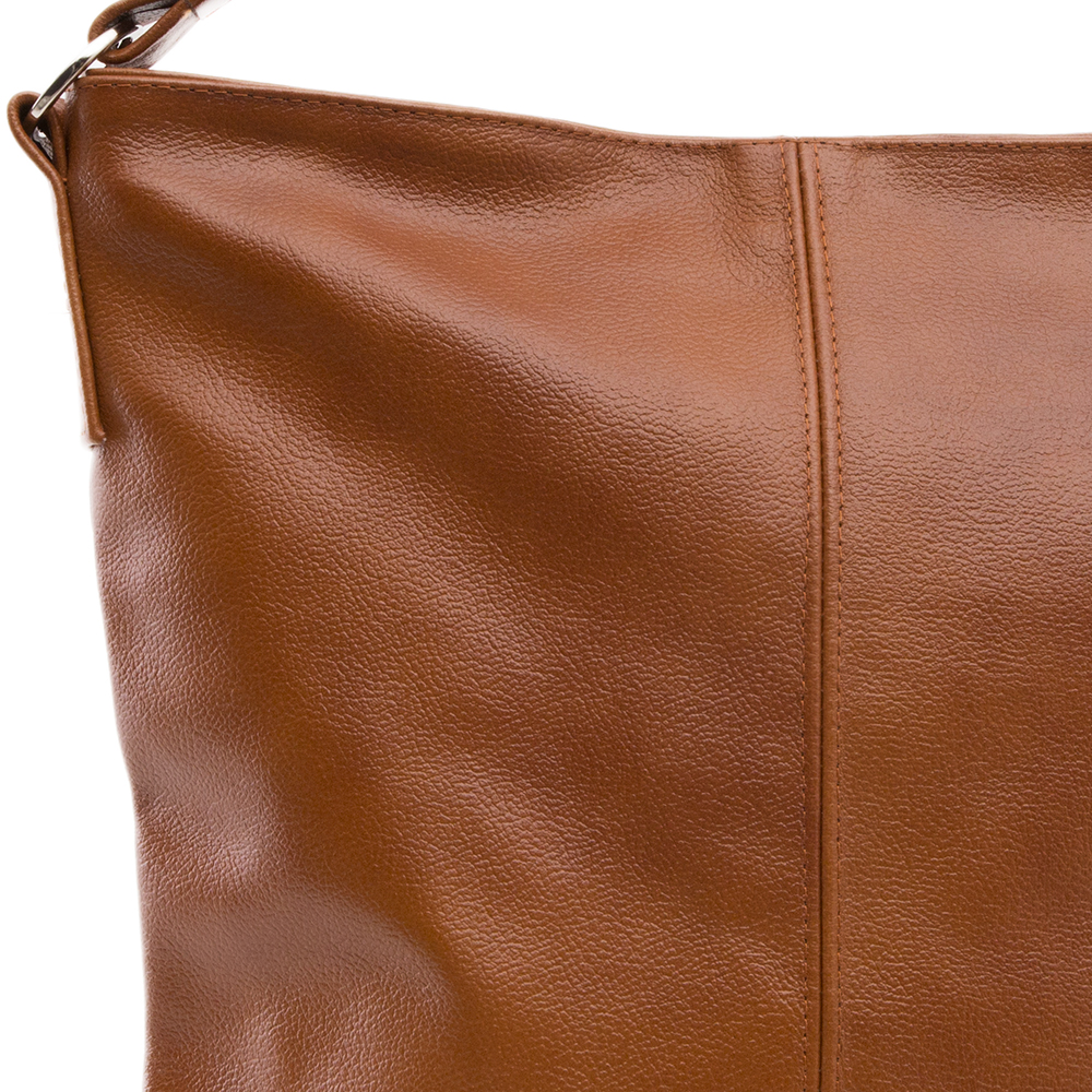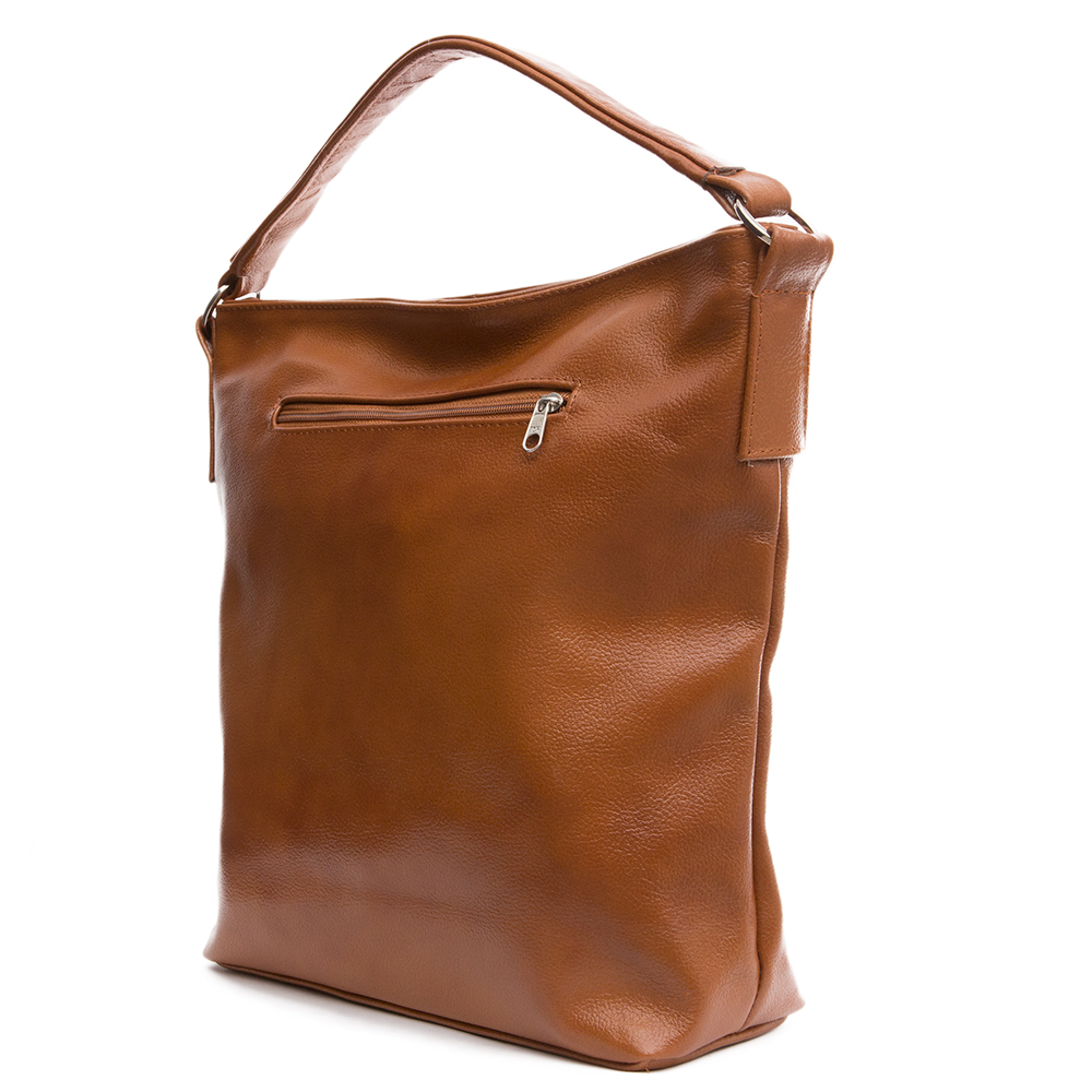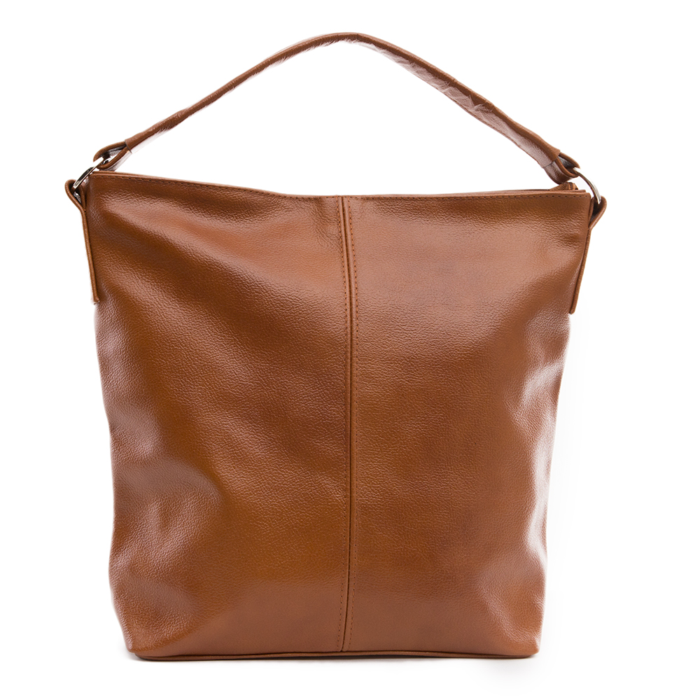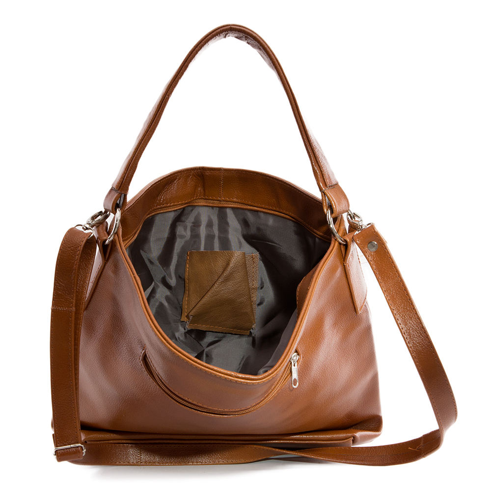 Skórzana, miękka A4 torebka wykonana w całości ze skóry naturalnej licowej. Zamykana z góry na suwak. Torebka dwukomorowa przedzielona na środku dużą kieszenią na zamek. Wewnątrz jedna kieszonka na zamek oraz jedna na telefon. Dodatkowo z tyłu kieszonka na suwak. Wnętrze wykończone trwałą, materiałową podszewką. Dodatkowy pasek z możliwością regulacji długości od 65 cm do 130 cm. Metalowe elementy w kolorze srebrnym. Dno torebki usztywnione.