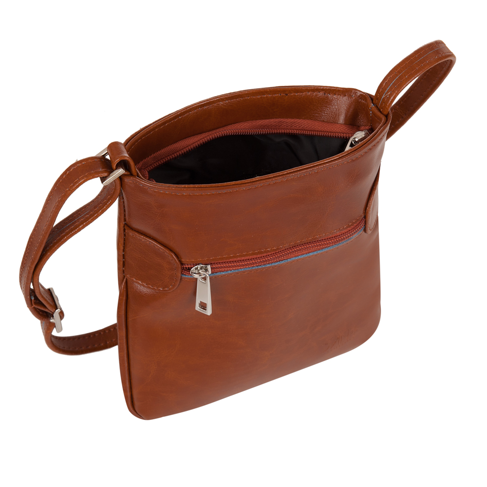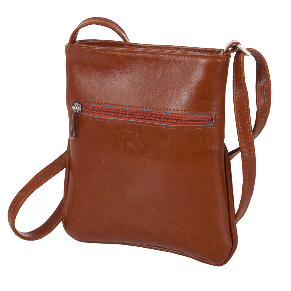 POLSKA skórzana torebka listonoszka wykonana z wysokogatunkowej naturalnej gładkiej skóry licowej firmy DAN-A. Zamykana og góry na zamek. Torebka jednokomorowa, wewnątrz jedna kieszonka na zamek oraz jedna na telefon. Wnętrze wykończone trwałą, materiałową podszewką. Długi, regulowany pasek umożliwia wygodne noszenie na ramieniu lub przez ramię. Dodatkowo z przodu i z tyłu praktyczna kieszonka na zamek. Elementy metalowe w kolorze srebrnym.