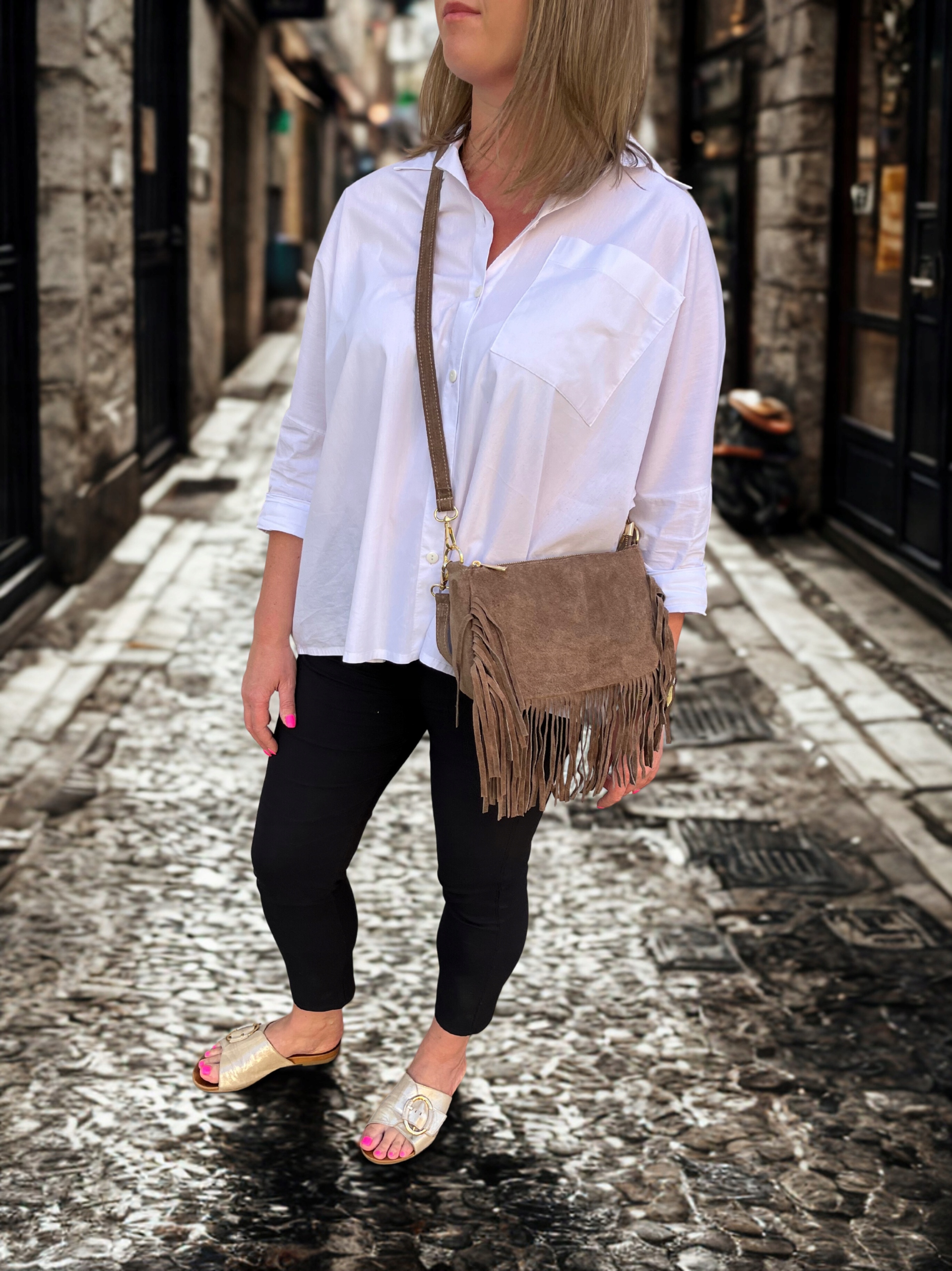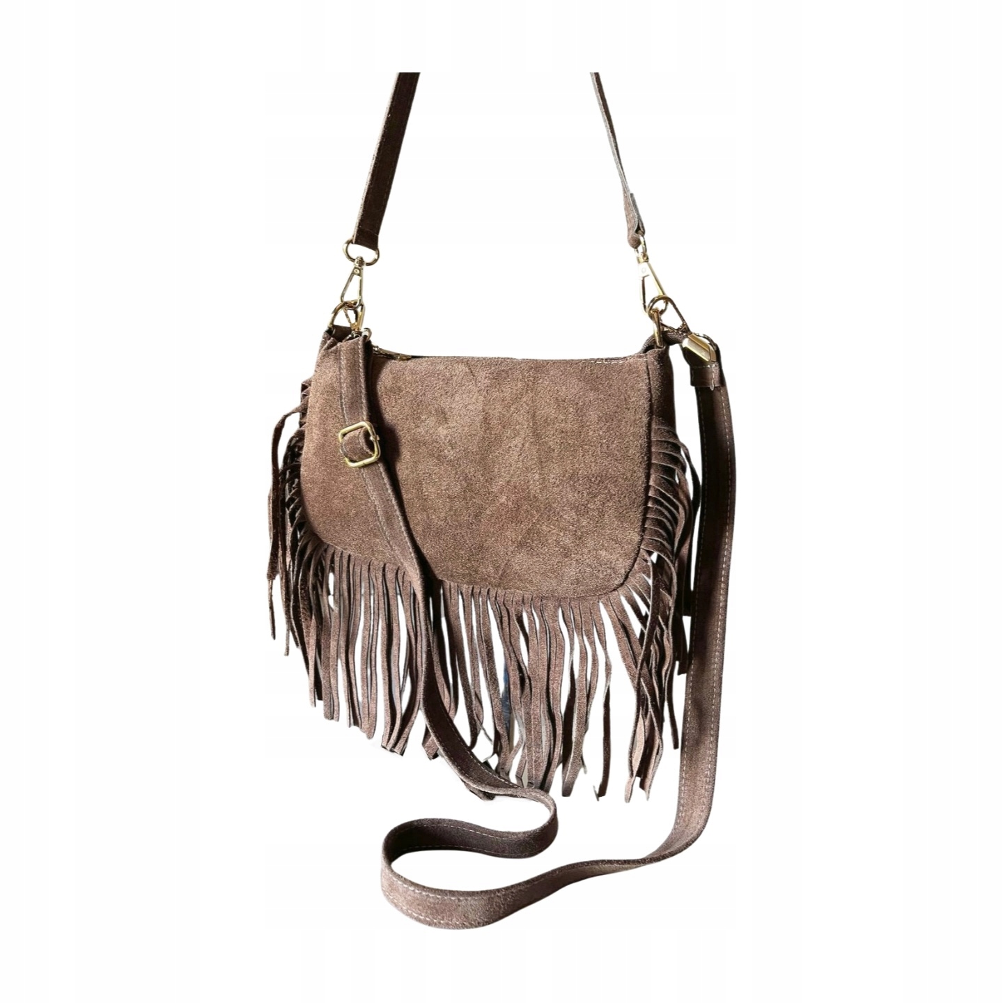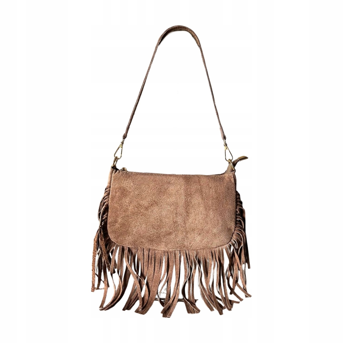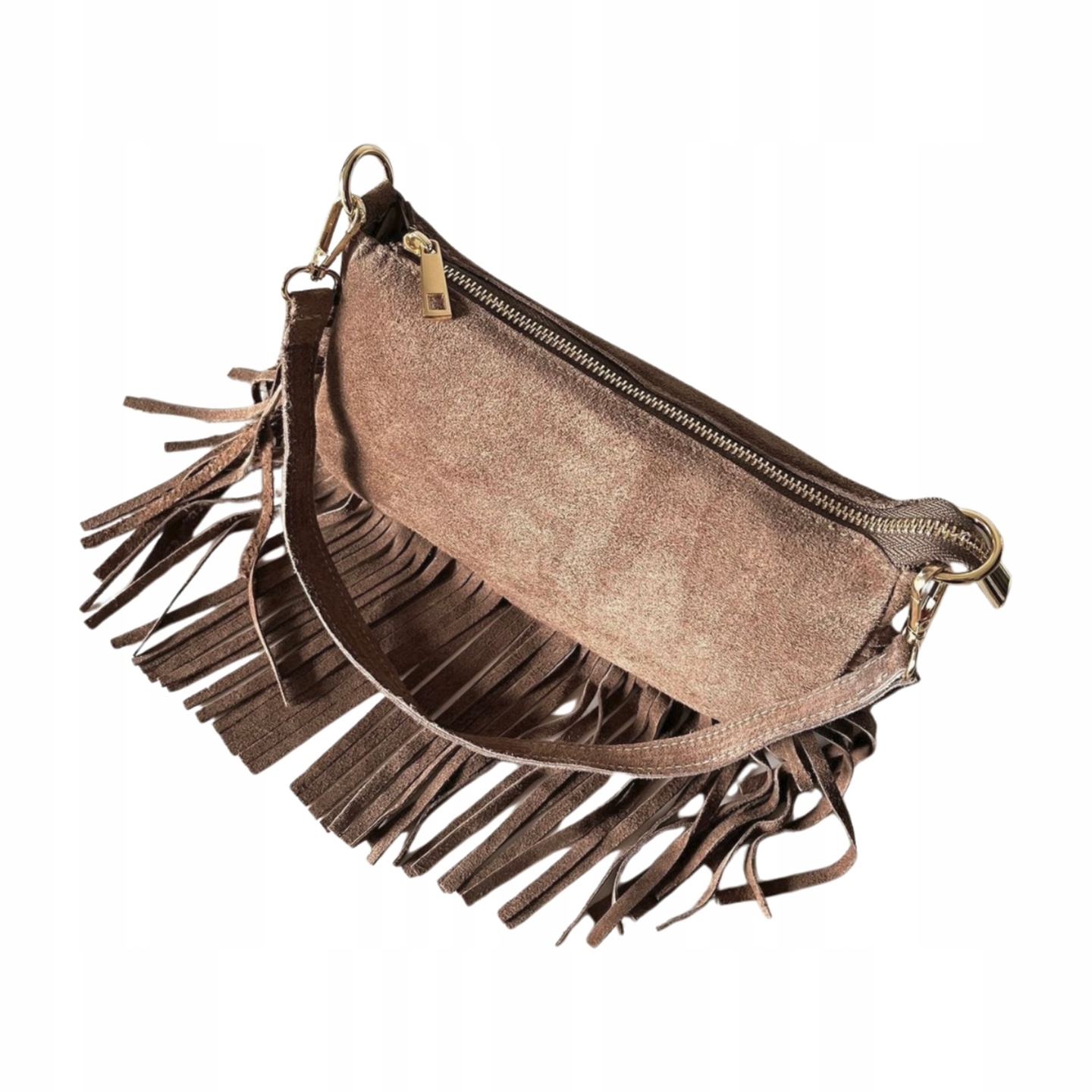 Vera Pelle - Włoska cappuccino taupe skórzana torebka listonoszka wykonana z wysokogatunkowej naturalnej skóry zamszowej.