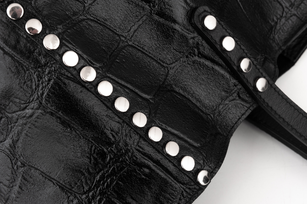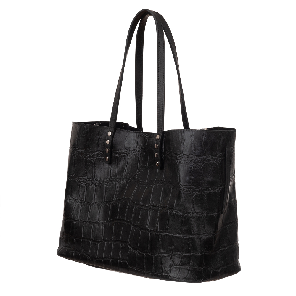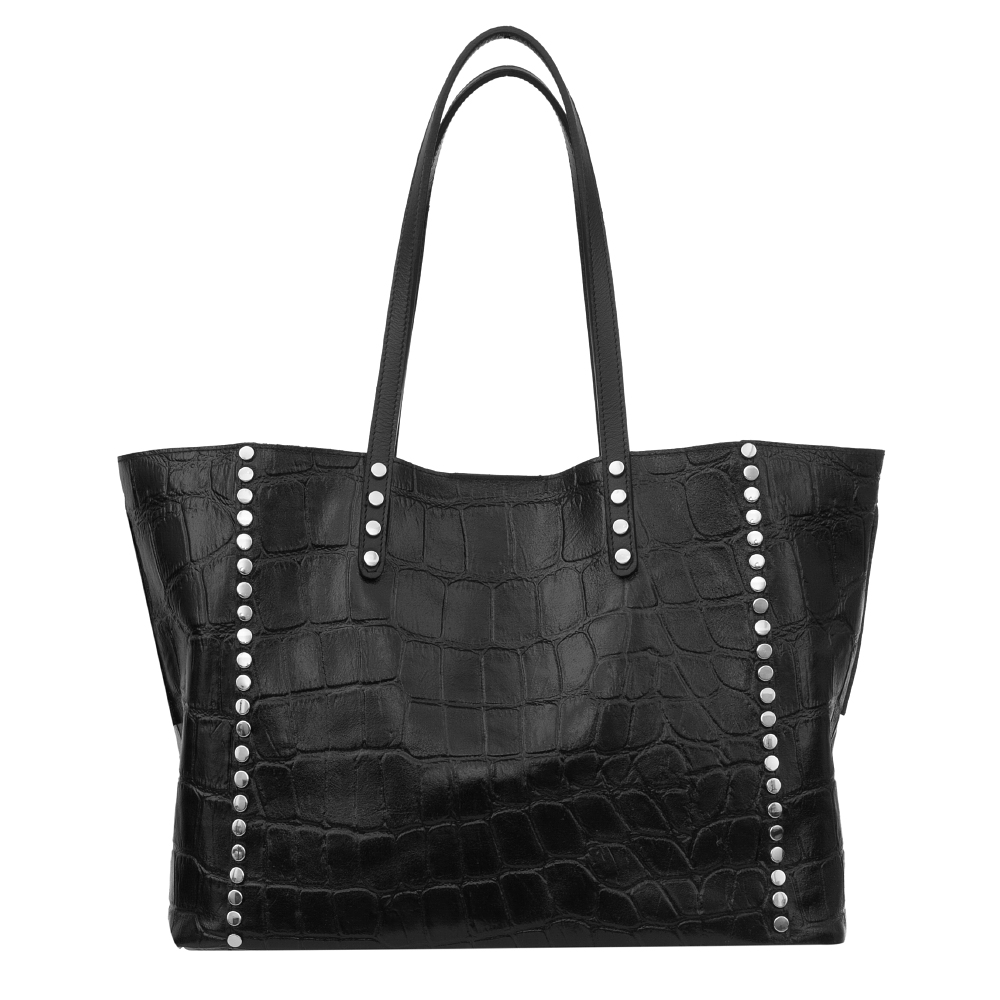 Hit! Włoska modna i poręczna torebka shopper z miękką kosmetyczką w środku. Ozdobiona modnymi dżetami w kolorze srebrnym. Wykonana perfekcyjnie ze skóry naturalnej z fakturą łuski krokodyla. Torebka jednokomorowa, wykończona czarnym pluszowym zamszem, zamykana na zatrzask magnetyczny. Możliwość noszenia torebki w dwóch formach - rozłożona jak i złożona w trapez po spięciu klipsem w środku torebki. Torebkę swobodnie można nosić na ramieniu. Torebka usztywniona od spodu. Metalowe elementy w kolorze srebrnym dodają torebce elegacji. Idealna torebka w miejskim stylu na codzień.